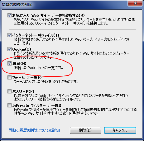 3.「履歴」にチェックが入っていることを確認し、「削除」ボタンをクリックします。