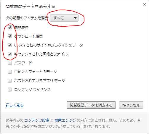 3.「消去する履歴の期間」で「すべての履歴」を選択、「消去する項目」で「赤丸の部分」のチェックを入れて「OK」ボタンをクリックします。