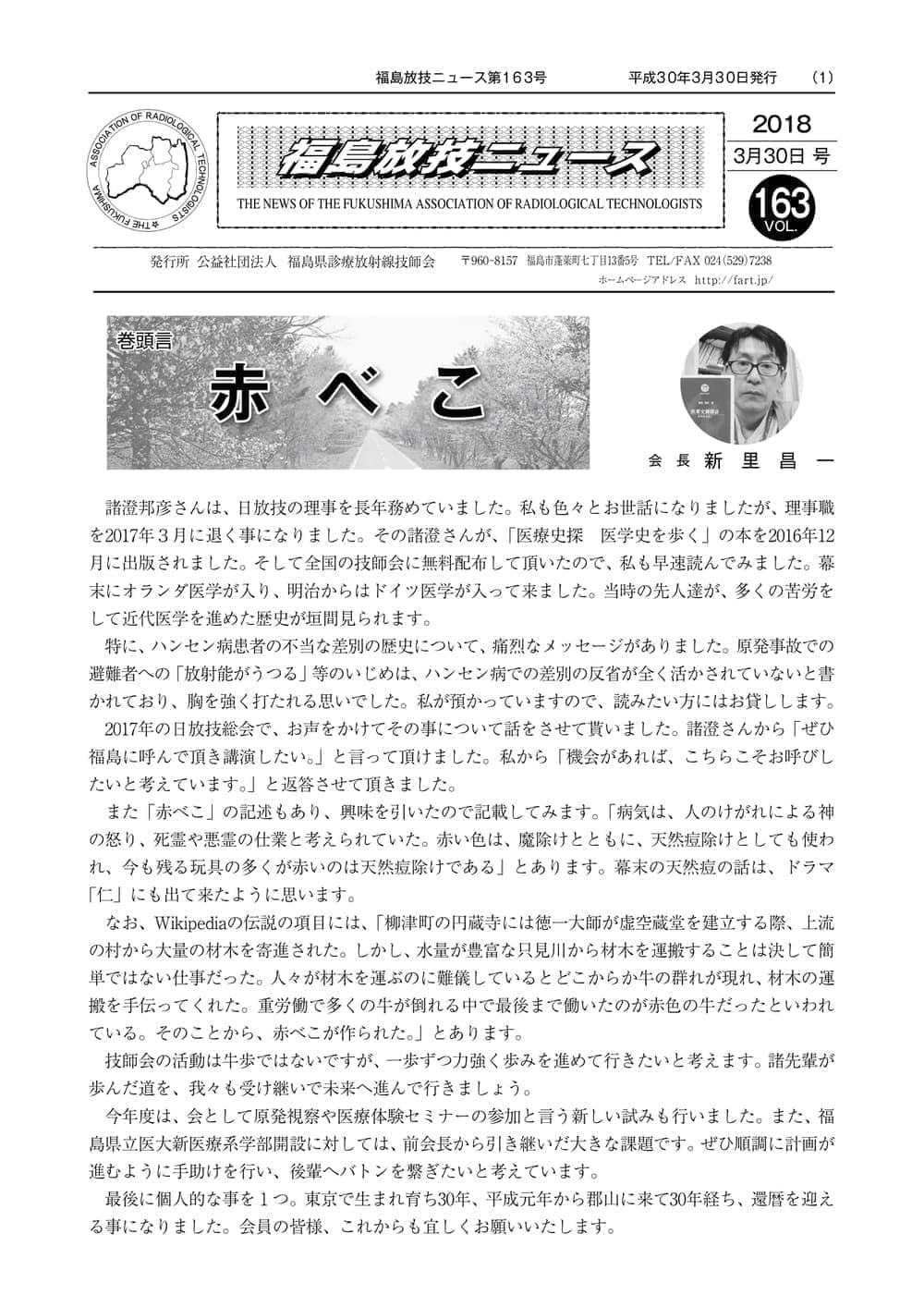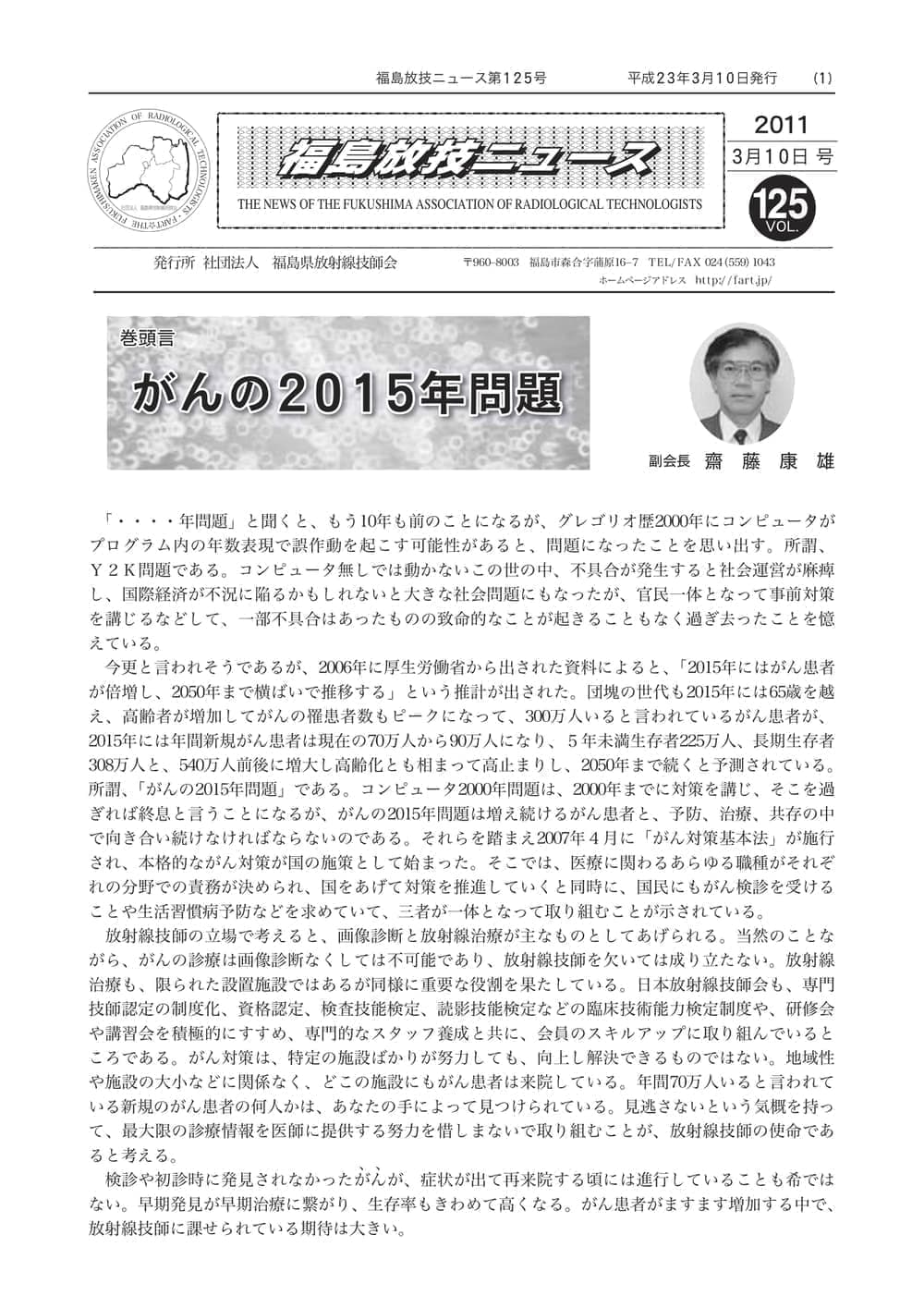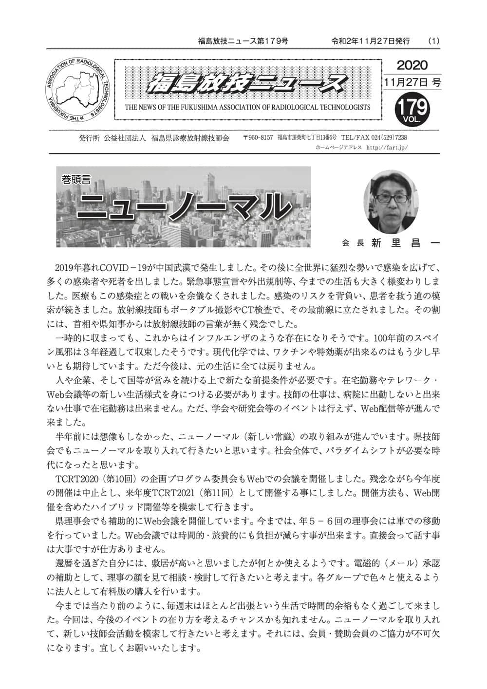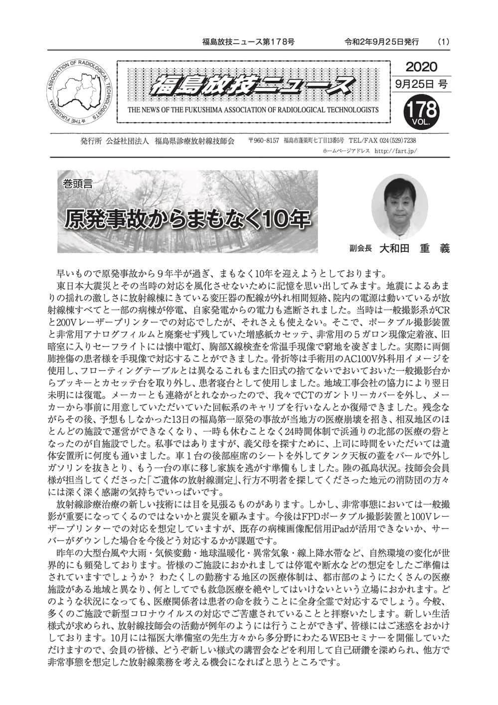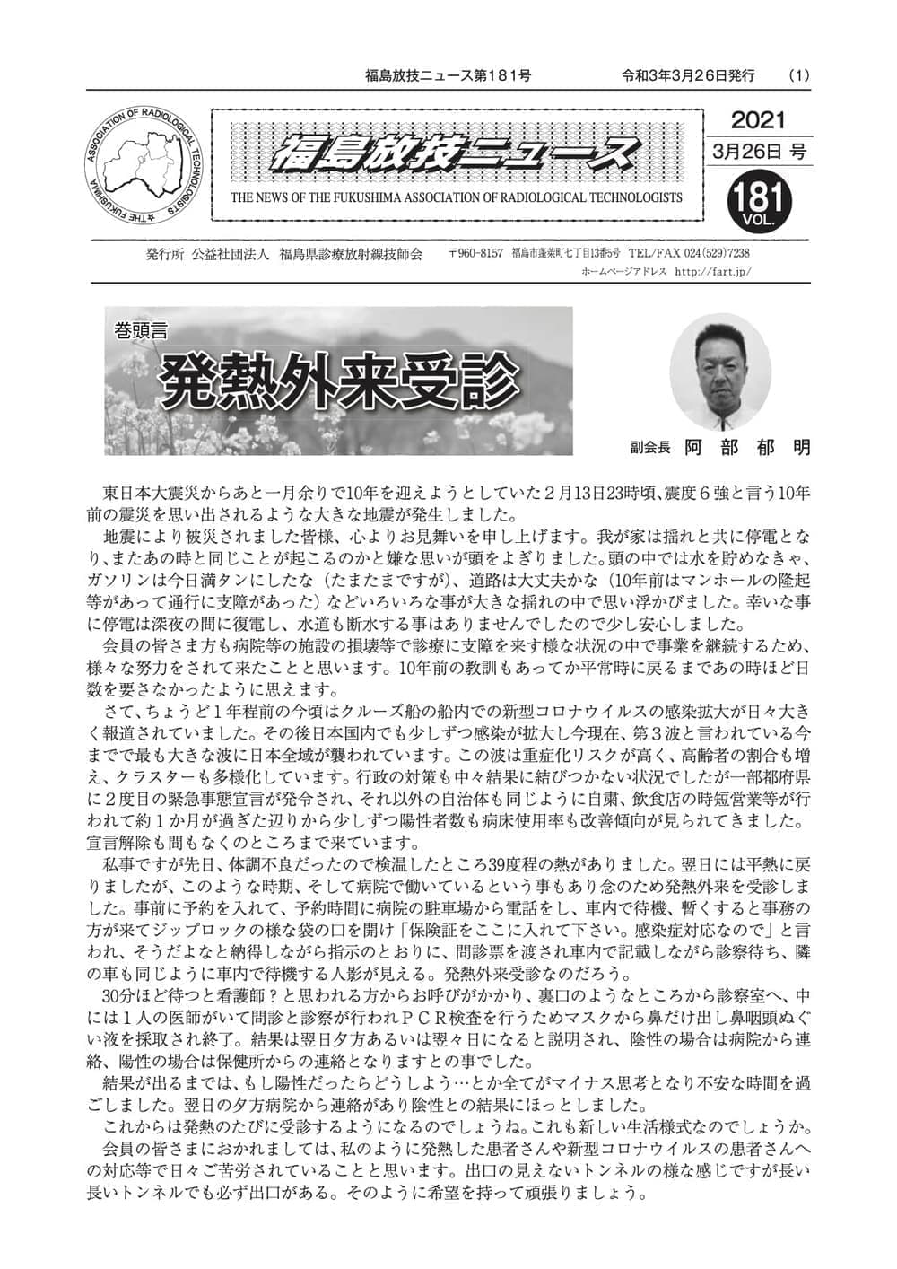 福島放技ニュースのバックナンバーをPDFファイルで閲覧することができます。 注1)Adobe Reader 6.0以上でご覧ください。 注2)ファイルサイズが大きいので、ダウンロードしてご覧頂くことをお勧めします。 【 2026年 】 No.210 No.211 【 2025年 】 No.204 No.205 No.206 No.207 No.208 No.209 【 2024年 】 No.198 No.199 No.200 No.201 No.202 No.203 【 2023年 】 No.192 No.193 No.194 No.195 No.196 No.197 【 2022年 】 No.186 No.187 No.188 No.189 No.190 No.191 【 2021年 】 No.180 No.181 No.182 No.183 No.184 No.185 【 2020年 】 No.174 No.175 No.176 No.177 No.178 No.179 【 2019年 】 No.168 No.169 No.170 No.171 No.172 No.173 【 2018年 】 No.163 No.164 No.165 No.166 No.167 【 2017年 】 No.161 No.162 No.156 No.157 No.158 No.159 No.160 【 2016年 】 No.155 No.150 No.151 No.152 No.153 No.154 【 2015年 】 No.149 No.144 No.145 No.146 No.147 No.148 【 2014年 】 No.143 No.138 No.139 No.140 No.141 No.142 【 2013年 】 No.133 No.134 No.135 No.136 No.137 【 2012年 】 No.129 No.130 No.131 No.132 【 2011年 】 No.124 No.125 No.126 No.127 No.128 【 2010年 】 No.123 No.118 No.119 No.120 No.121 No.122 【 2009年 】 No.113 No.114 No.115 No.116 No.117 【 2008年 】 No.112 No.107 No.108 No.109 No.110 No.111 【 2007年 】 No.106 No.101 No.102 No.103 No.104 No.105 【 2006年 】 No.100 No.095 No.096 No.097 No.098 No.099 【 2005年 】 No.094-01 No.094-02 No.089 No.090 No.091 No.092 No.093 HOME | 福放技ニュース 前のページ へ 次のページへ 技師会長よりごあいさつ お知らせ分科会・研究会・地区情報告示研修開催情報イベントカレンダー令和7年度 総会議案書役員改選および選挙 >役員改選告示 >役員改選立候補者 会員・医療従事者の皆様へ福放技ニュースメールマガジンに関して生涯ポイント付与について会報 技師会所有の物品貸出について >マンモグラフィトレーニング用ベスト >作業環境測定機器 会員専用情報パスワードについて 各種申請書ダウンロード 委員会報告各委員会ファイル共有 放射線に関する情報 ICRP勧告 MRI磁場の危険性 放射線 Q&A WBCに関する資料 簡易除染マニュアル