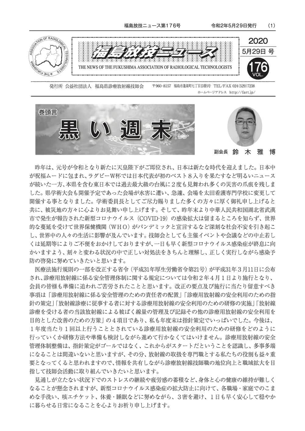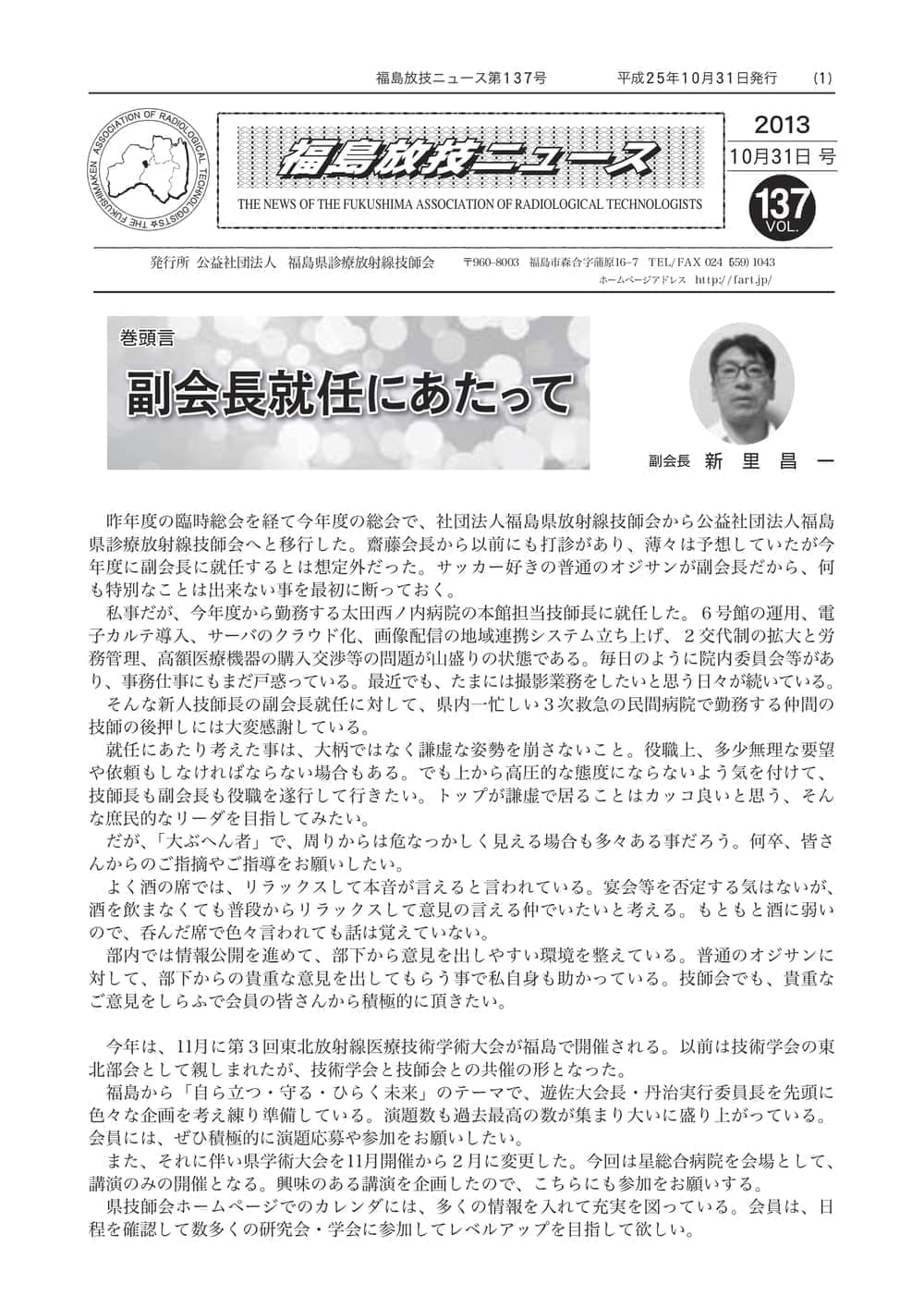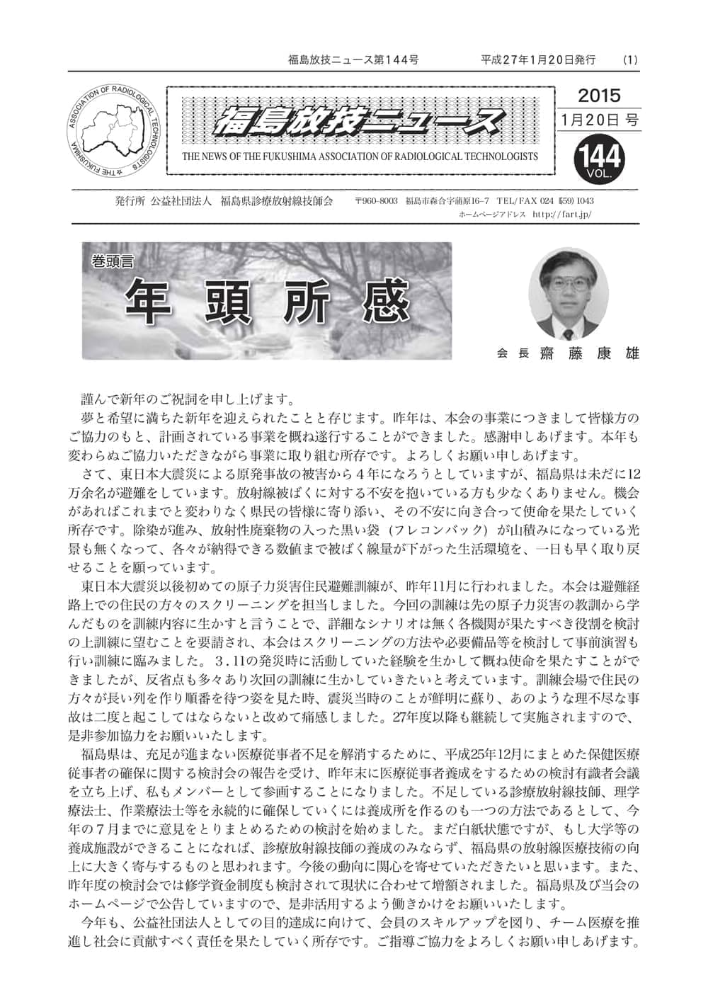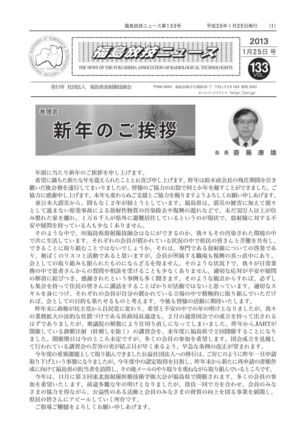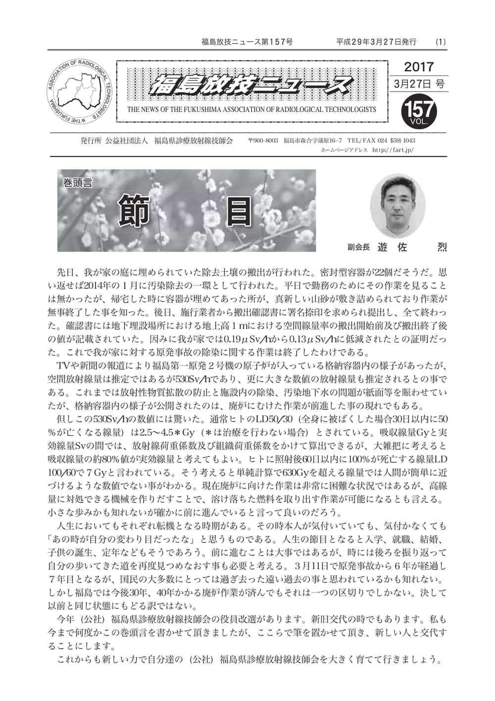 福島放技ニュースのバックナンバーをPDFファイルで閲覧することができます。 注1)Adobe Reader 6.0以上でご覧ください。 注2)ファイルサイズが大きいので、ダウンロードしてご覧頂くことをお勧めします。 【 2026年 】 No.210 No.211 【 2025年 】 No.204 No.205 No.206 No.207 No.208 No.209 【 2024年 】 No.198 No.199 No.200 No.201 No.202 No.203 【 2023年 】 No.192 No.193 No.194 No.195 No.196 No.197 【 2022年 】 No.186 No.187 No.188 No.189 No.190 No.191 【 2021年 】 No.180 No.181 No.182 No.183 No.184 No.185 【 2020年 】 No.174 No.175 No.176 No.177 No.178 No.179 【 2019年 】 No.168 No.169 No.170 No.171 No.172 No.173 【 2018年 】 No.163 No.164 No.165 No.166 No.167 【 2017年 】 No.161 No.162 No.156 No.157 No.158 No.159 No.160 【 2016年 】 No.155 No.150 No.151 No.152 No.153 No.154 【 2015年 】 No.149 No.144 No.145 No.146 No.147 No.148 【 2014年 】 No.143 No.138 No.139 No.140 No.141 No.142 【 2013年 】 No.133 No.134 No.135 No.136 No.137 【 2012年 】 No.129 No.130 No.131 No.132 【 2011年 】 No.124 No.125 No.126 No.127 No.128 【 2010年 】 No.123 No.118 No.119 No.120 No.121 No.122 【 2009年 】 No.113 No.114 No.115 No.116 No.117 【 2008年 】 No.112 No.107 No.108 No.109 No.110 No.111 【 2007年 】 No.106 No.101 No.102 No.103 No.104 No.105 【 2006年 】 No.100 No.095 No.096 No.097 No.098 No.099 【 2005年 】 No.094-01 No.094-02 No.089 No.090 No.091 No.092 No.093 HOME | 福放技ニュース 前のページ へ 次のページへ 技師会長よりごあいさつ お知らせ分科会・研究会・地区情報告示研修開催情報イベントカレンダー令和7年度 総会議案書役員改選および選挙 >役員改選告示 >役員改選立候補者 会員・医療従事者の皆様へ福放技ニュースメールマガジンに関して生涯ポイント付与について会報 技師会所有の物品貸出について >マンモグラフィトレーニング用ベスト >作業環境測定機器 会員専用情報パスワードについて 各種申請書ダウンロード 委員会報告各委員会ファイル共有 放射線に関する情報 ICRP勧告 MRI磁場の危険性 放射線 Q&A WBCに関する資料 簡易除染マニュアル