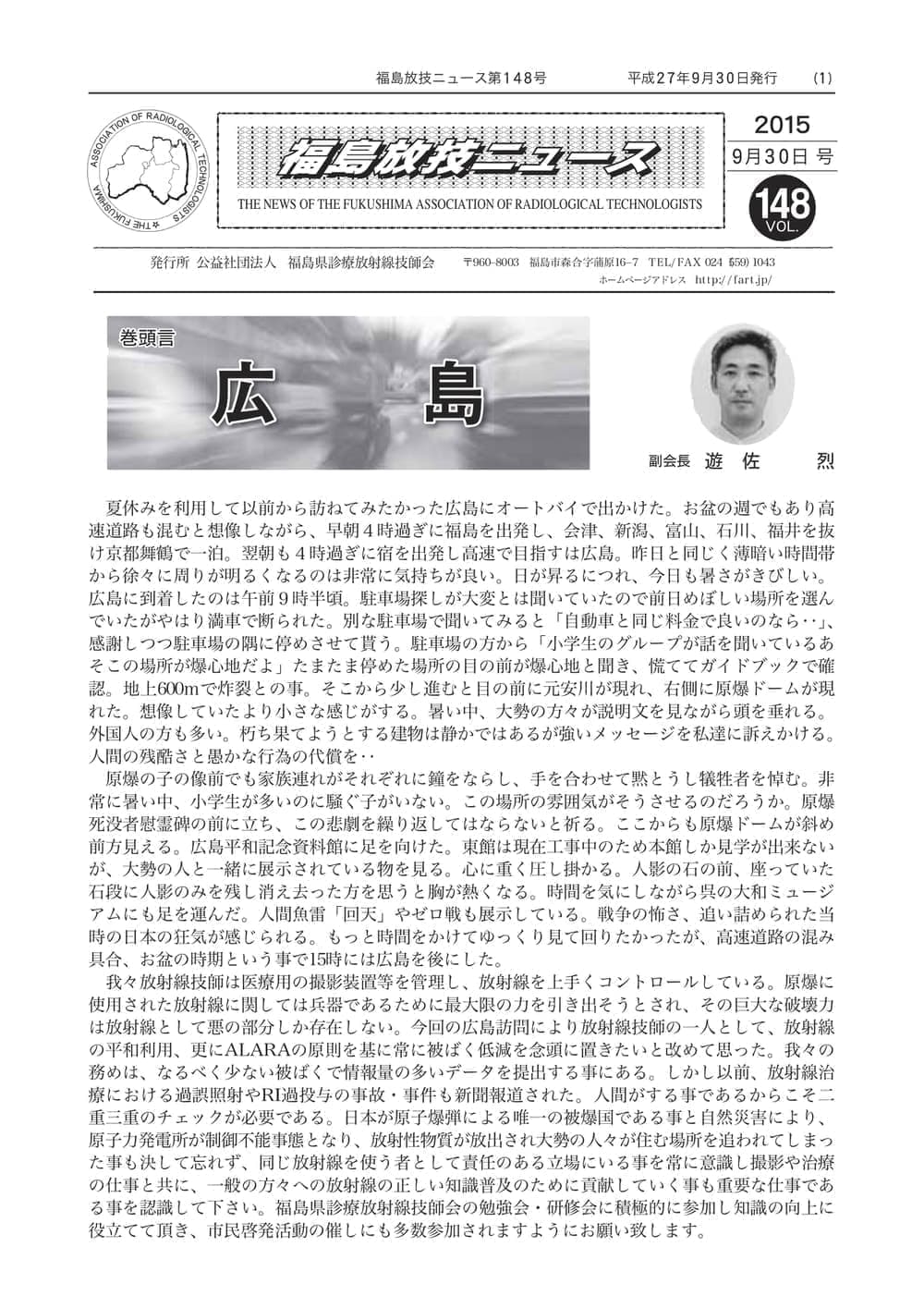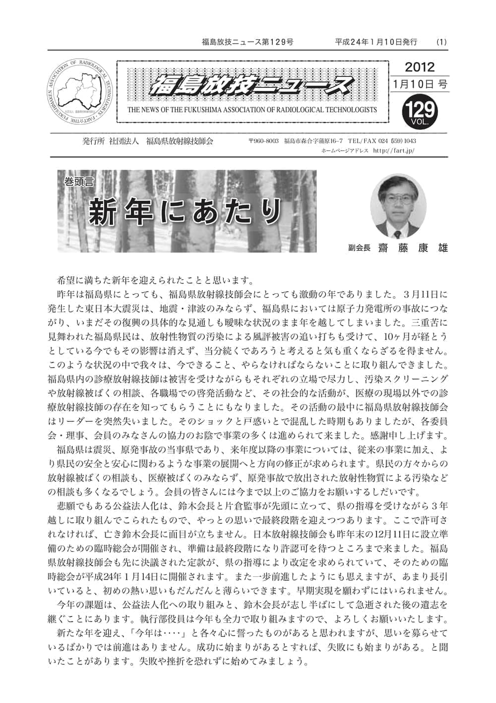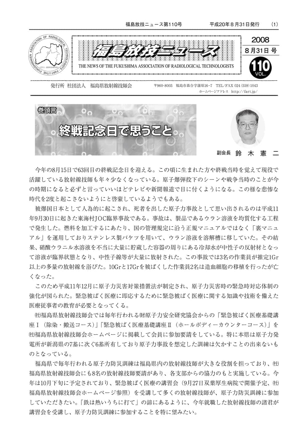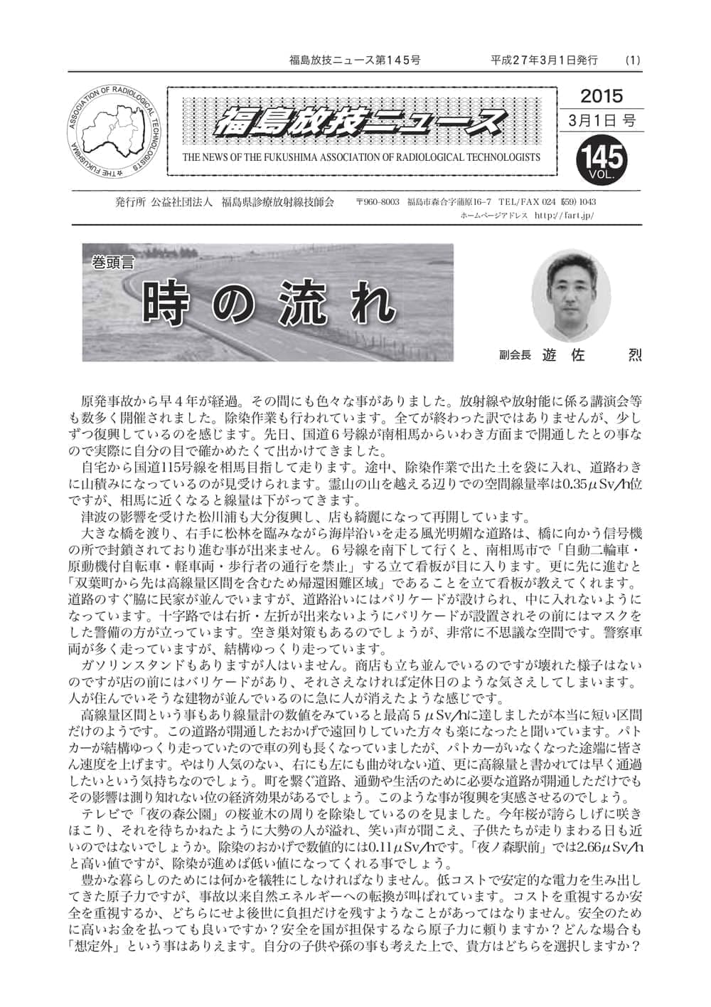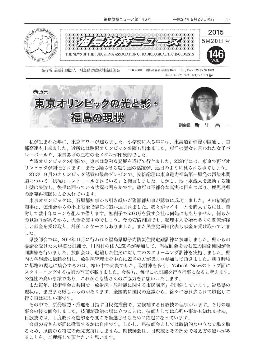 福島放技ニュースのバックナンバーをPDFファイルで閲覧することができます。 注1)Adobe Reader 6.0以上でご覧ください。 注2)ファイルサイズが大きいので、ダウンロードしてご覧頂くことをお勧めします。 【 2026年 】 No.210 No.211 【 2025年 】 No.204 No.205 No.206 No.207 No.208 No.209 【 2024年 】 No.198 No.199 No.200 No.201 No.202 No.203 【 2023年 】 No.192 No.193 No.194 No.195 No.196 No.197 【 2022年 】 No.186 No.187 No.188 No.189 No.190 No.191 【 2021年 】 No.180 No.181 No.182 No.183 No.184 No.185 【 2020年 】 No.174 No.175 No.176 No.177 No.178 No.179 【 2019年 】 No.168 No.169 No.170 No.171 No.172 No.173 【 2018年 】 No.163 No.164 No.165 No.166 No.167 【 2017年 】 No.161 No.162 No.156 No.157 No.158 No.159 No.160 【 2016年 】 No.155 No.150 No.151 No.152 No.153 No.154 【 2015年 】 No.149 No.144 No.145 No.146 No.147 No.148 【 2014年 】 No.143 No.138 No.139 No.140 No.141 No.142 【 2013年 】 No.133 No.134 No.135 No.136 No.137 【 2012年 】 No.129 No.130 No.131 No.132 【 2011年 】 No.124 No.125 No.126 No.127 No.128 【 2010年 】 No.123 No.118 No.119 No.120 No.121 No.122 【 2009年 】 No.113 No.114 No.115 No.116 No.117 【 2008年 】 No.112 No.107 No.108 No.109 No.110 No.111 【 2007年 】 No.106 No.101 No.102 No.103 No.104 No.105 【 2006年 】 No.100 No.095 No.096 No.097 No.098 No.099 【 2005年 】 No.094-01 No.094-02 No.089 No.090 No.091 No.092 No.093 HOME | 福放技ニュース 前のページ へ 次のページへ 技師会長よりごあいさつ お知らせ分科会・研究会・地区情報告示研修開催情報イベントカレンダー令和7年度 総会議案書役員改選および選挙 >役員改選告示 >役員改選立候補者 会員・医療従事者の皆様へ福放技ニュースメールマガジンに関して生涯ポイント付与について会報 技師会所有の物品貸出について >マンモグラフィトレーニング用ベスト >作業環境測定機器 会員専用情報パスワードについて 各種申請書ダウンロード 委員会報告各委員会ファイル共有 放射線に関する情報 ICRP勧告 MRI磁場の危険性 放射線 Q&A WBCに関する資料 簡易除染マニュアル