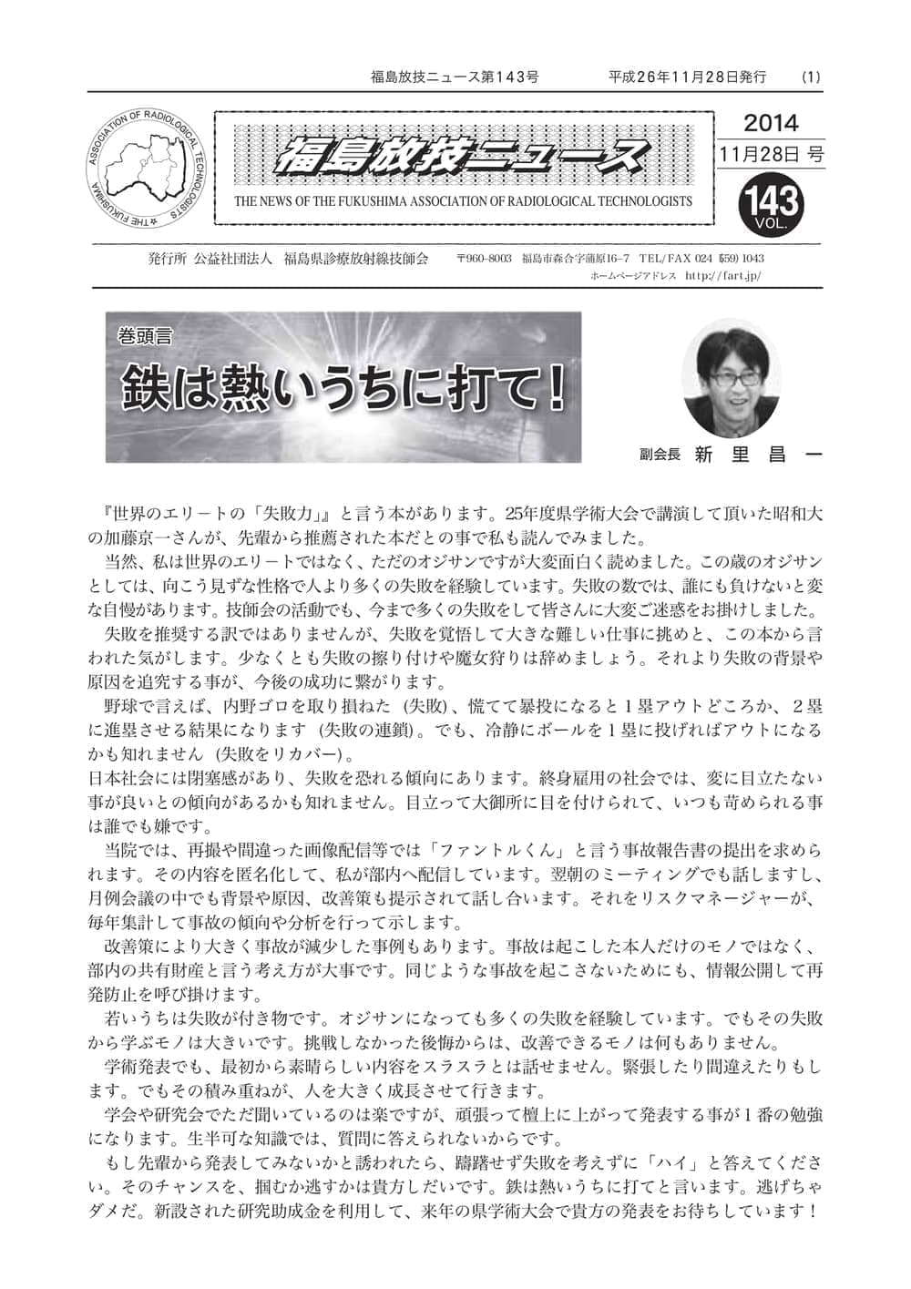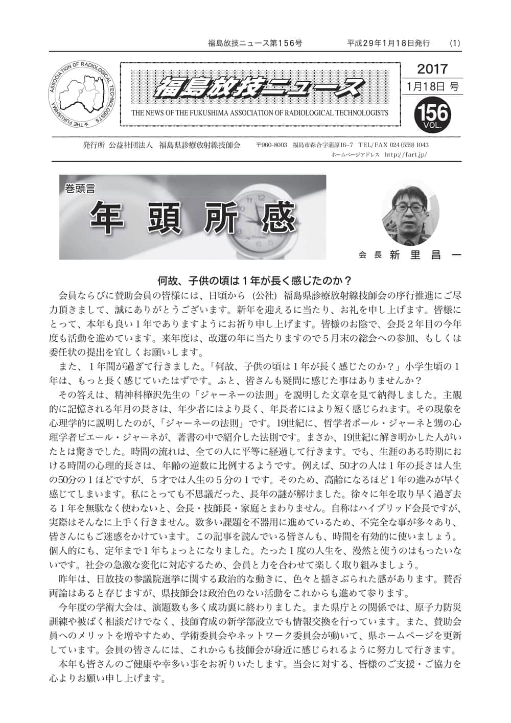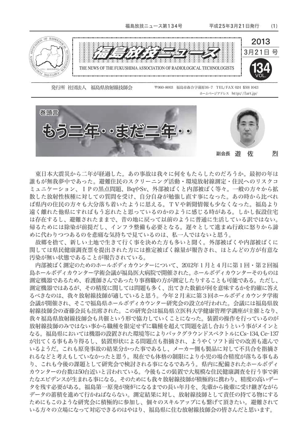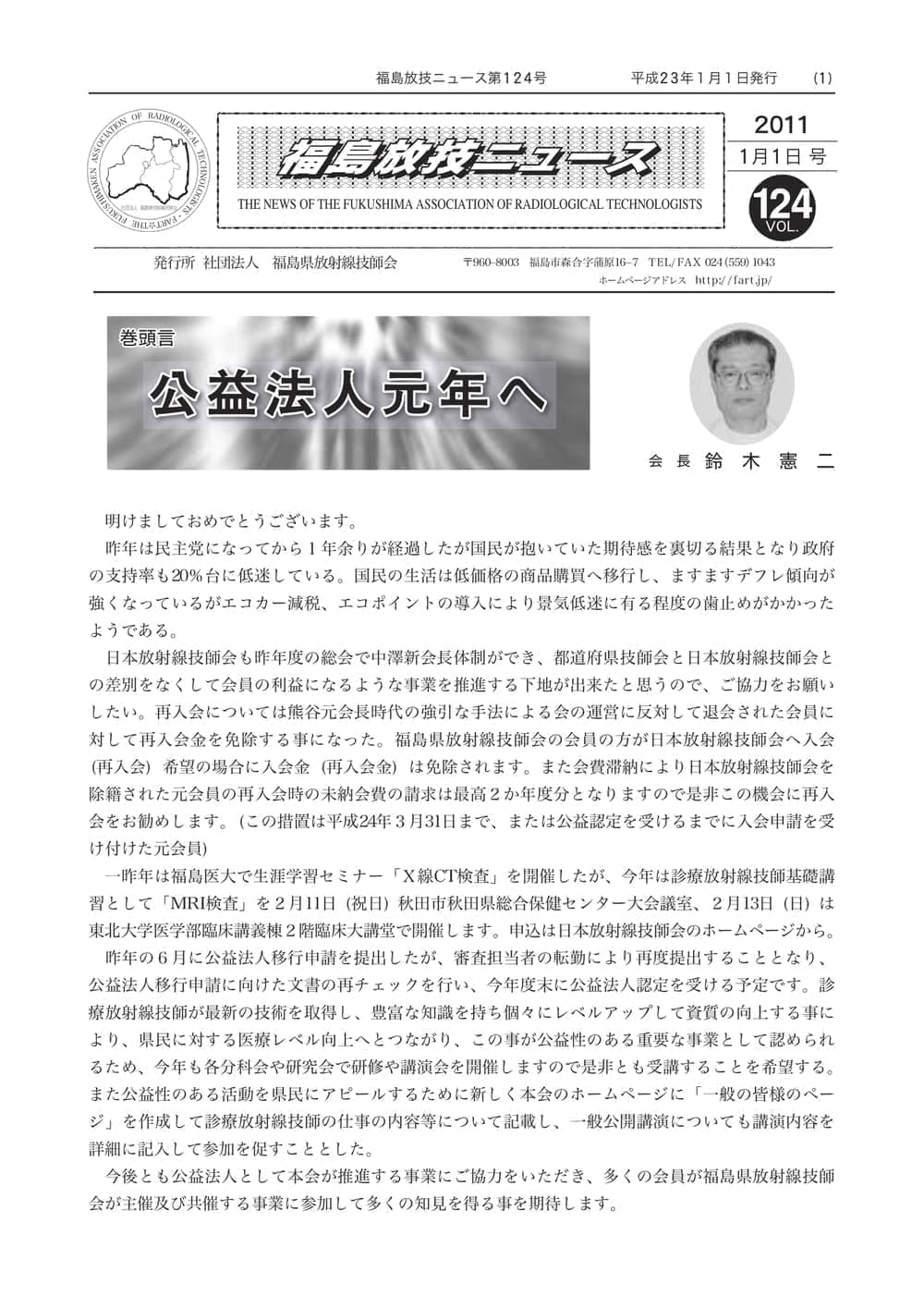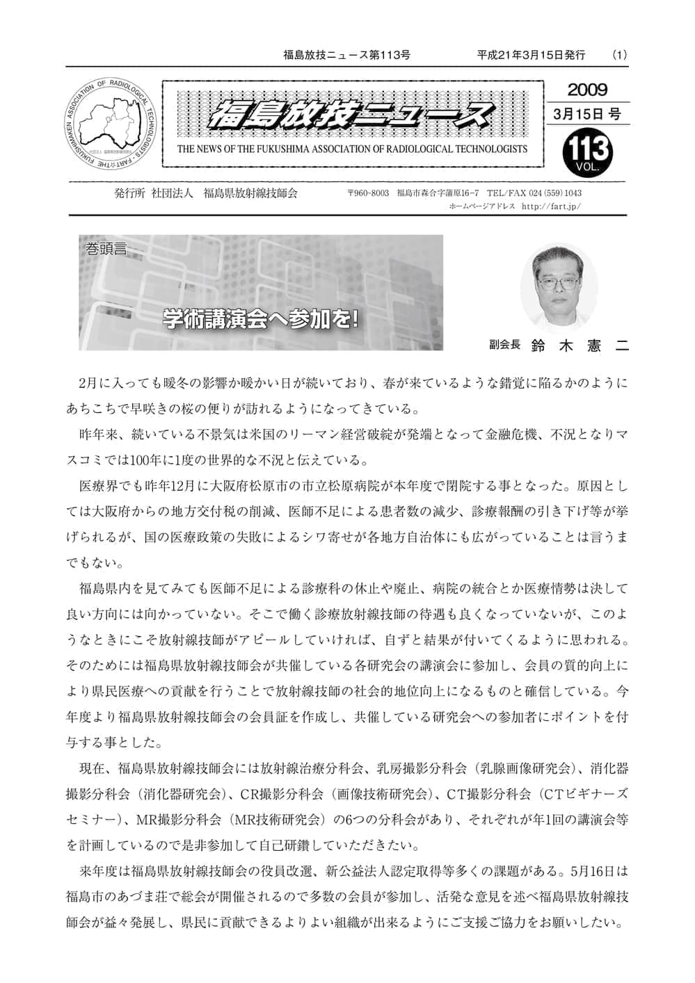福島放技ニュースのバックナンバーをPDFファイルで閲覧することができます。 注1)Adobe Reader 6.0以上でご覧ください。 注2)ファイルサイズが大きいので、ダウンロードしてご覧頂くことをお勧めします。 【 2026年 】 No.210 No.211 【 2025年 】 No.204 No.205 No.206 No.207 No.208 No.209 【 2024年 】 No.198 No.199 No.200 No.201 No.202 No.203 【 2023年 】 No.192 No.193 No.194 No.195 No.196 No.197 【 2022年 】 No.186 No.187 No.188 No.189 No.190 No.191 【 2021年 】 No.180 No.181 No.182 No.183 No.184 No.185 【 2020年 】 No.174 No.175 No.176 No.177 No.178 No.179 【 2019年 】 No.168 No.169 No.170 No.171 No.172 No.173 【 2018年 】 No.163 No.164 No.165 No.166 No.167 【 2017年 】 No.161 No.162 No.156 No.157 No.158 No.159 No.160 【 2016年 】 No.155 No.150 No.151 No.152 No.153 No.154 【 2015年 】 No.149 No.144 No.145 No.146 No.147 No.148 【 2014年 】 No.143 No.138 No.139 No.140 No.141 No.142 【 2013年 】 No.133 No.134 No.135 No.136 No.137 【 2012年 】 No.129 No.130 No.131 No.132 【 2011年 】 No.124 No.125 No.126 No.127 No.128 【 2010年 】 No.123 No.118 No.119 No.120 No.121 No.122 【 2009年 】 No.113 No.114 No.115 No.116 No.117 【 2008年 】 No.112 No.107 No.108 No.109 No.110 No.111 【 2007年 】 No.106 No.101 No.102 No.103 No.104 No.105 【 2006年 】 No.100 No.095 No.096 No.097 No.098 No.099 【 2005年 】 No.094-01 No.094-02 No.089 No.090 No.091 No.092 No.093 HOME | 福放技ニュース 前のページ へ 次のページへ 技師会長よりごあいさつ お知らせ分科会・研究会・地区情報告示研修開催情報イベントカレンダー令和7年度 総会議案書役員改選および選挙 >役員改選告示 >役員改選立候補者 会員・医療従事者の皆様へ福放技ニュースメールマガジンに関して生涯ポイント付与について会報 技師会所有の物品貸出について >マンモグラフィトレーニング用ベスト >作業環境測定機器 会員専用情報パスワードについて 各種申請書ダウンロード 委員会報告各委員会ファイル共有 放射線に関する情報 ICRP勧告 MRI磁場の危険性 放射線 Q&A WBCに関する資料 簡易除染マニュアル