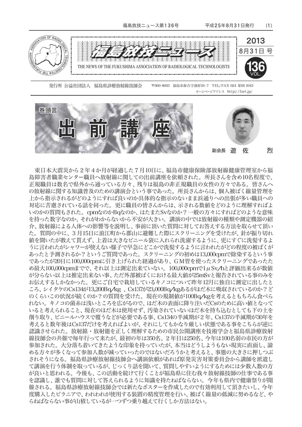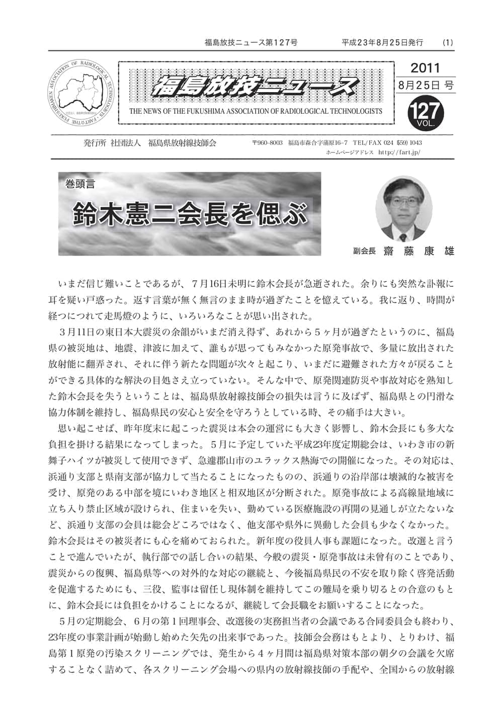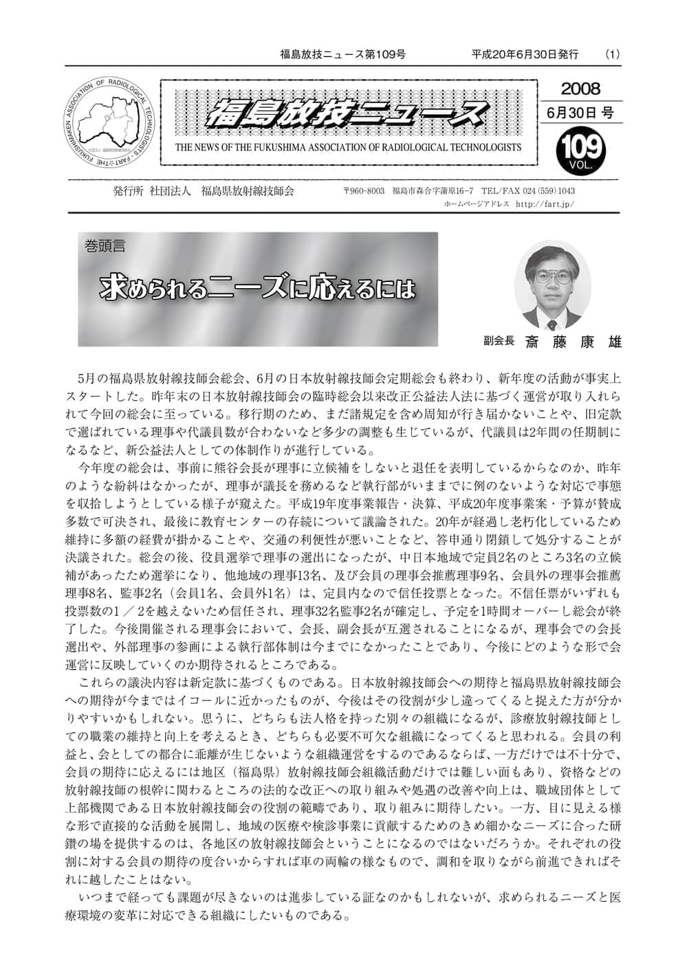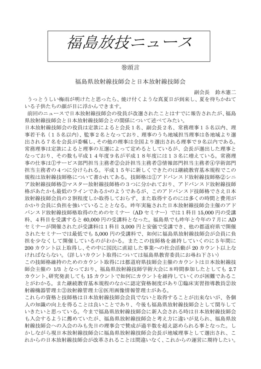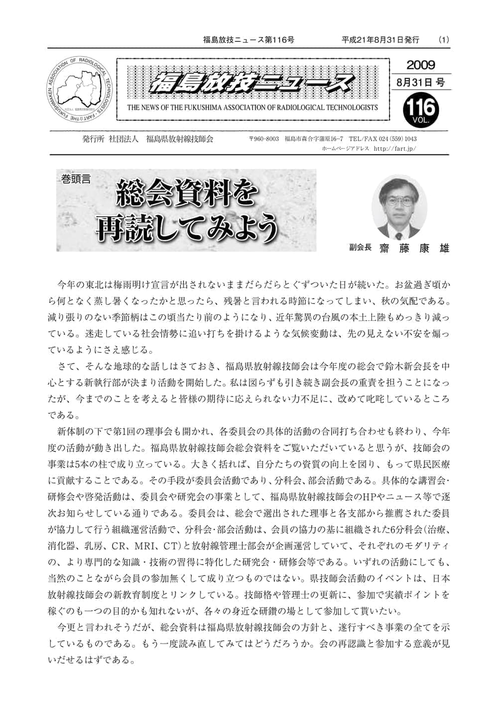 福島放技ニュースのバックナンバーをPDFファイルで閲覧することができます。 注1)Adobe Reader 6.0以上でご覧ください。 注2)ファイルサイズが大きいので、ダウンロードしてご覧頂くことをお勧めします。 【 2026年 】 No.210 No.211 【 2025年 】 No.204 No.205 No.206 No.207 No.208 No.209 【 2024年 】 No.198 No.199 No.200 No.201 No.202 No.203 【 2023年 】 No.192 No.193 No.194 No.195 No.196 No.197 【 2022年 】 No.186 No.187 No.188 No.189 No.190 No.191 【 2021年 】 No.180 No.181 No.182 No.183 No.184 No.185 【 2020年 】 No.174 No.175 No.176 No.177 No.178 No.179 【 2019年 】 No.168 No.169 No.170 No.171 No.172 No.173 【 2018年 】 No.163 No.164 No.165 No.166 No.167 【 2017年 】 No.161 No.162 No.156 No.157 No.158 No.159 No.160 【 2016年 】 No.155 No.150 No.151 No.152 No.153 No.154 【 2015年 】 No.149 No.144 No.145 No.146 No.147 No.148 【 2014年 】 No.143 No.138 No.139 No.140 No.141 No.142 【 2013年 】 No.133 No.134 No.135 No.136 No.137 【 2012年 】 No.129 No.130 No.131 No.132 【 2011年 】 No.124 No.125 No.126 No.127 No.128 【 2010年 】 No.123 No.118 No.119 No.120 No.121 No.122 【 2009年 】 No.113 No.114 No.115 No.116 No.117 【 2008年 】 No.112 No.107 No.108 No.109 No.110 No.111 【 2007年 】 No.106 No.101 No.102 No.103 No.104 No.105 【 2006年 】 No.100 No.095 No.096 No.097 No.098 No.099 【 2005年 】 No.094-01 No.094-02 No.089 No.090 No.091 No.092 No.093 HOME | 福放技ニュース 前のページ へ 次のページへ 技師会長よりごあいさつ お知らせ分科会・研究会・地区情報告示研修開催情報イベントカレンダー令和7年度 総会議案書役員改選および選挙 >役員改選告示 >役員改選立候補者 会員・医療従事者の皆様へ福放技ニュースメールマガジンに関して生涯ポイント付与について会報 技師会所有の物品貸出について >マンモグラフィトレーニング用ベスト >作業環境測定機器 会員専用情報パスワードについて 各種申請書ダウンロード 委員会報告各委員会ファイル共有 放射線に関する情報 ICRP勧告 MRI磁場の危険性 放射線 Q&A WBCに関する資料 簡易除染マニュアル