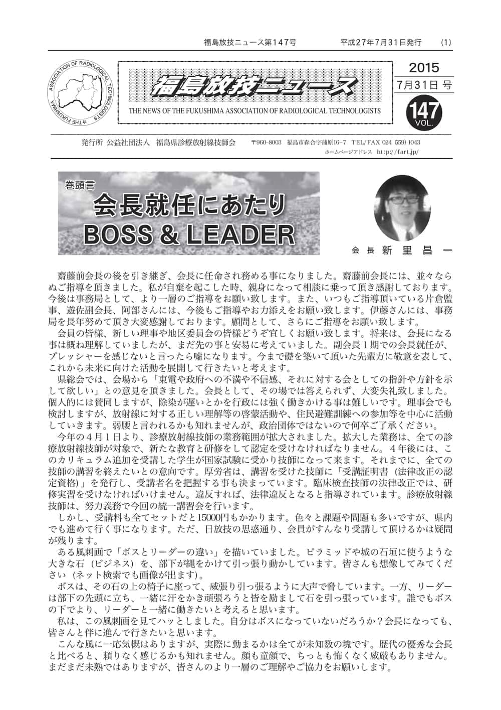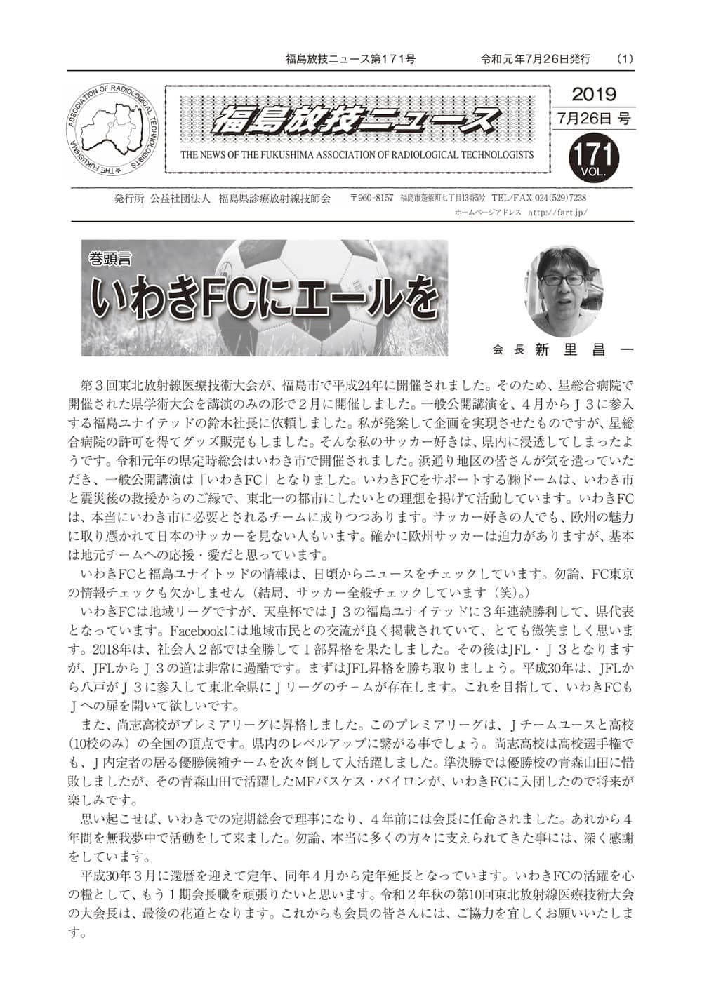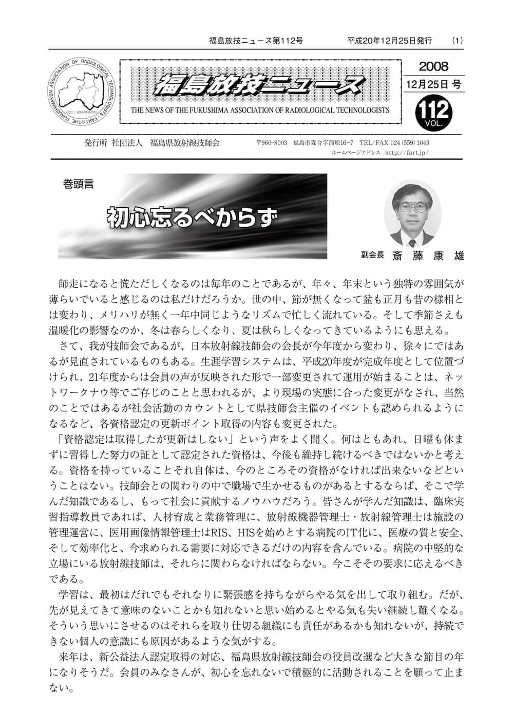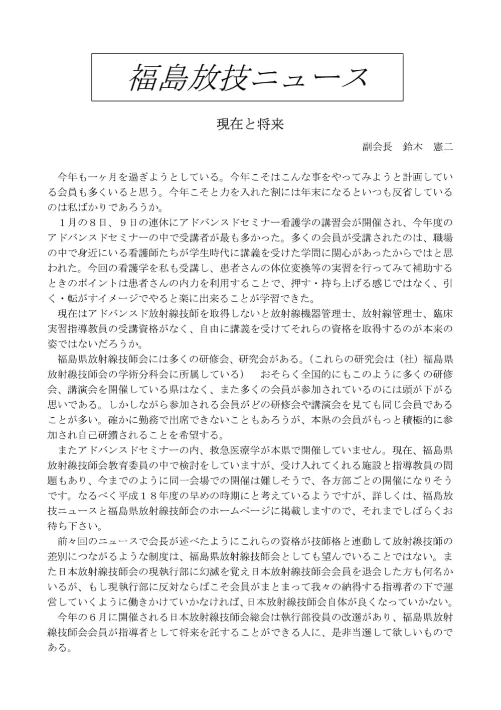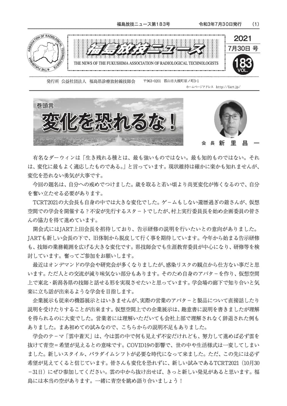 福島放技ニュースのバックナンバーをPDFファイルで閲覧することができます。 注1)Adobe Reader 6.0以上でご覧ください。 注2)ファイルサイズが大きいので、ダウンロードしてご覧頂くことをお勧めします。 【 2026年 】 No.210 No.211 【 2025年 】 No.204 No.205 No.206 No.207 No.208 No.209 【 2024年 】 No.198 No.199 No.200 No.201 No.202 No.203 【 2023年 】 No.192 No.193 No.194 No.195 No.196 No.197 【 2022年 】 No.186 No.187 No.188 No.189 No.190 No.191 【 2021年 】 No.180 No.181 No.182 No.183 No.184 No.185 【 2020年 】 No.174 No.175 No.176 No.177 No.178 No.179 【 2019年 】 No.168 No.169 No.170 No.171 No.172 No.173 【 2018年 】 No.163 No.164 No.165 No.166 No.167 【 2017年 】 No.161 No.162 No.156 No.157 No.158 No.159 No.160 【 2016年 】 No.155 No.150 No.151 No.152 No.153 No.154 【 2015年 】 No.149 No.144 No.145 No.146 No.147 No.148 【 2014年 】 No.143 No.138 No.139 No.140 No.141 No.142 【 2013年 】 No.133 No.134 No.135 No.136 No.137 【 2012年 】 No.129 No.130 No.131 No.132 【 2011年 】 No.124 No.125 No.126 No.127 No.128 【 2010年 】 No.123 No.118 No.119 No.120 No.121 No.122 【 2009年 】 No.113 No.114 No.115 No.116 No.117 【 2008年 】 No.112 No.107 No.108 No.109 No.110 No.111 【 2007年 】 No.106 No.101 No.102 No.103 No.104 No.105 【 2006年 】 No.100 No.095 No.096 No.097 No.098 No.099 【 2005年 】 No.094-01 No.094-02 No.089 No.090 No.091 No.092 No.093 HOME | 福放技ニュース 前のページ へ 次のページへ 技師会長よりごあいさつ お知らせ分科会・研究会・地区情報告示研修開催情報イベントカレンダー令和7年度 総会議案書役員改選および選挙 >役員改選告示 >役員改選立候補者 会員・医療従事者の皆様へ福放技ニュースメールマガジンに関して生涯ポイント付与について会報 技師会所有の物品貸出について >マンモグラフィトレーニング用ベスト >作業環境測定機器 会員専用情報パスワードについて 各種申請書ダウンロード 委員会報告各委員会ファイル共有 放射線に関する情報 ICRP勧告 MRI磁場の危険性 放射線 Q&A WBCに関する資料 簡易除染マニュアル
