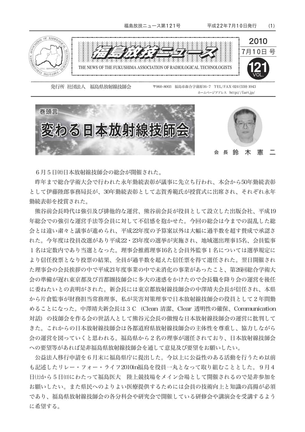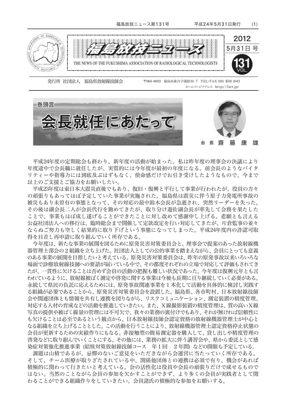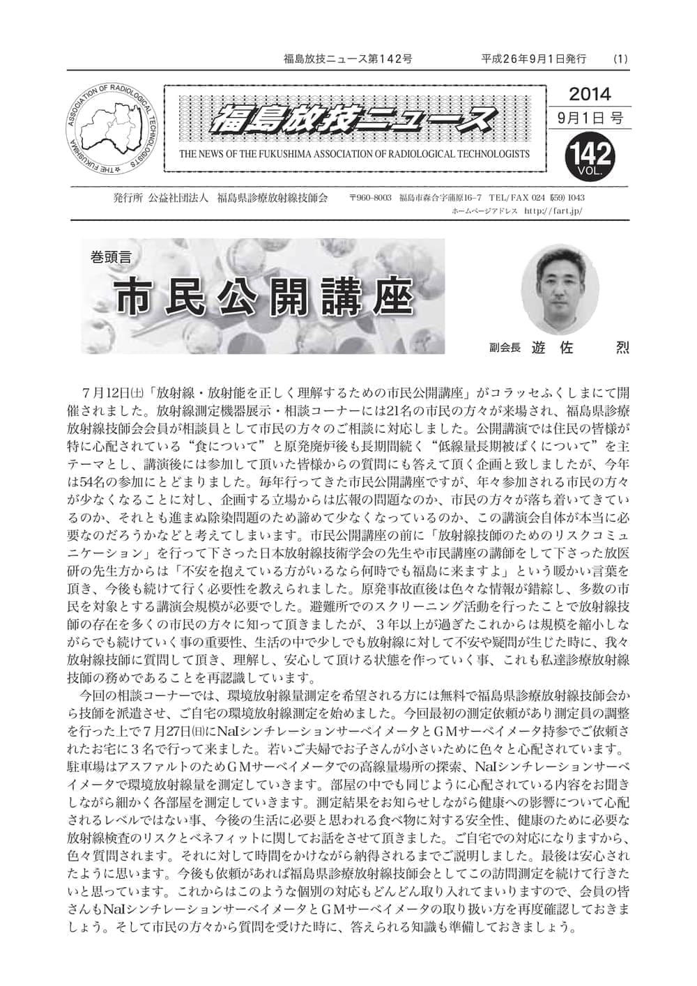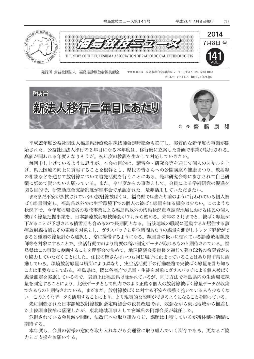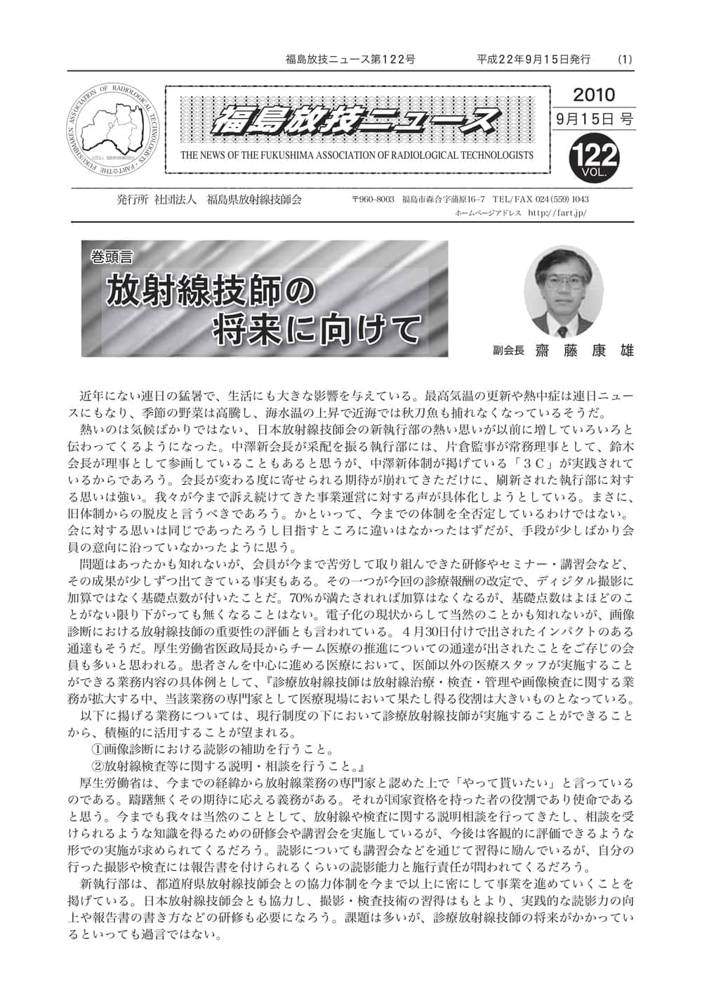 福島放技ニュースのバックナンバーをPDFファイルで閲覧することができます。 注1)Adobe Reader 6.0以上でご覧ください。 注2)ファイルサイズが大きいので、ダウンロードしてご覧頂くことをお勧めします。 【 2026年 】 No.210 No.211 【 2025年 】 No.204 No.205 No.206 No.207 No.208 No.209 【 2024年 】 No.198 No.199 No.200 No.201 No.202 No.203 【 2023年 】 No.192 No.193 No.194 No.195 No.196 No.197 【 2022年 】 No.186 No.187 No.188 No.189 No.190 No.191 【 2021年 】 No.180 No.181 No.182 No.183 No.184 No.185 【 2020年 】 No.174 No.175 No.176 No.177 No.178 No.179 【 2019年 】 No.168 No.169 No.170 No.171 No.172 No.173 【 2018年 】 No.163 No.164 No.165 No.166 No.167 【 2017年 】 No.161 No.162 No.156 No.157 No.158 No.159 No.160 【 2016年 】 No.155 No.150 No.151 No.152 No.153 No.154 【 2015年 】 No.149 No.144 No.145 No.146 No.147 No.148 【 2014年 】 No.143 No.138 No.139 No.140 No.141 No.142 【 2013年 】 No.133 No.134 No.135 No.136 No.137 【 2012年 】 No.129 No.130 No.131 No.132 【 2011年 】 No.124 No.125 No.126 No.127 No.128 【 2010年 】 No.123 No.118 No.119 No.120 No.121 No.122 【 2009年 】 No.113 No.114 No.115 No.116 No.117 【 2008年 】 No.112 No.107 No.108 No.109 No.110 No.111 【 2007年 】 No.106 No.101 No.102 No.103 No.104 No.105 【 2006年 】 No.100 No.095 No.096 No.097 No.098 No.099 【 2005年 】 No.094-01 No.094-02 No.089 No.090 No.091 No.092 No.093 HOME | 福放技ニュース 前のページ へ 次のページへ 技師会長よりごあいさつ お知らせ分科会・研究会・地区情報告示研修開催情報イベントカレンダー令和7年度 総会議案書役員改選および選挙 >役員改選告示 >役員改選立候補者 会員・医療従事者の皆様へ福放技ニュースメールマガジンに関して生涯ポイント付与について会報 技師会所有の物品貸出について >マンモグラフィトレーニング用ベスト >作業環境測定機器 会員専用情報パスワードについて 各種申請書ダウンロード 委員会報告各委員会ファイル共有 放射線に関する情報 ICRP勧告 MRI磁場の危険性 放射線 Q&A WBCに関する資料 簡易除染マニュアル