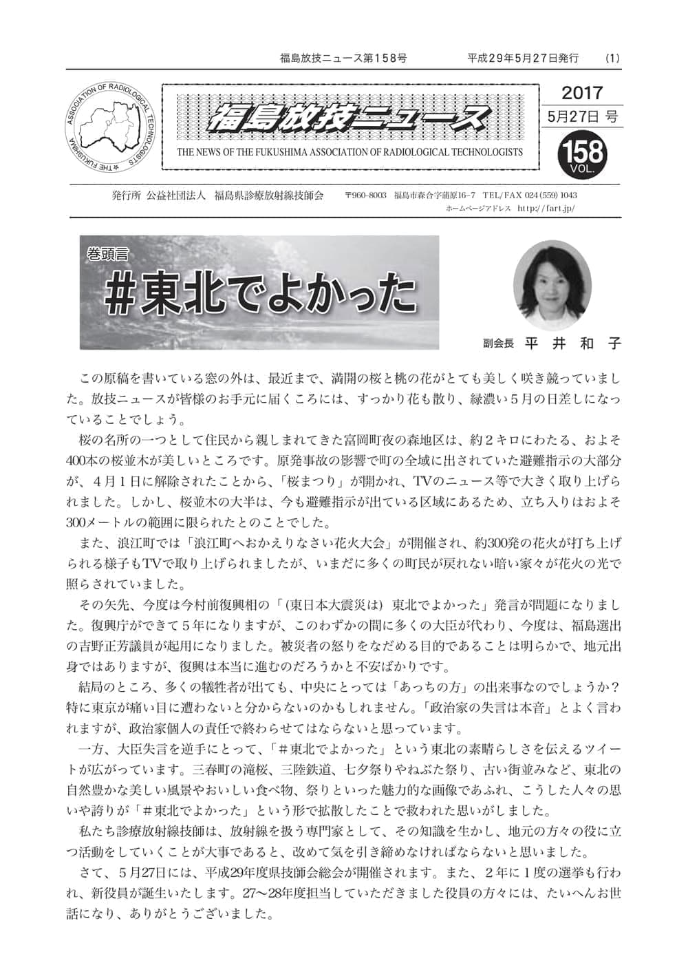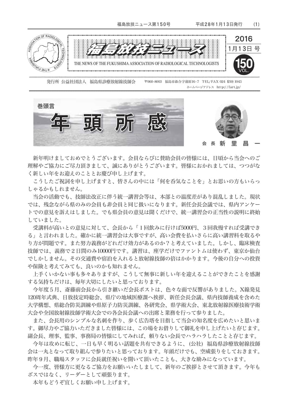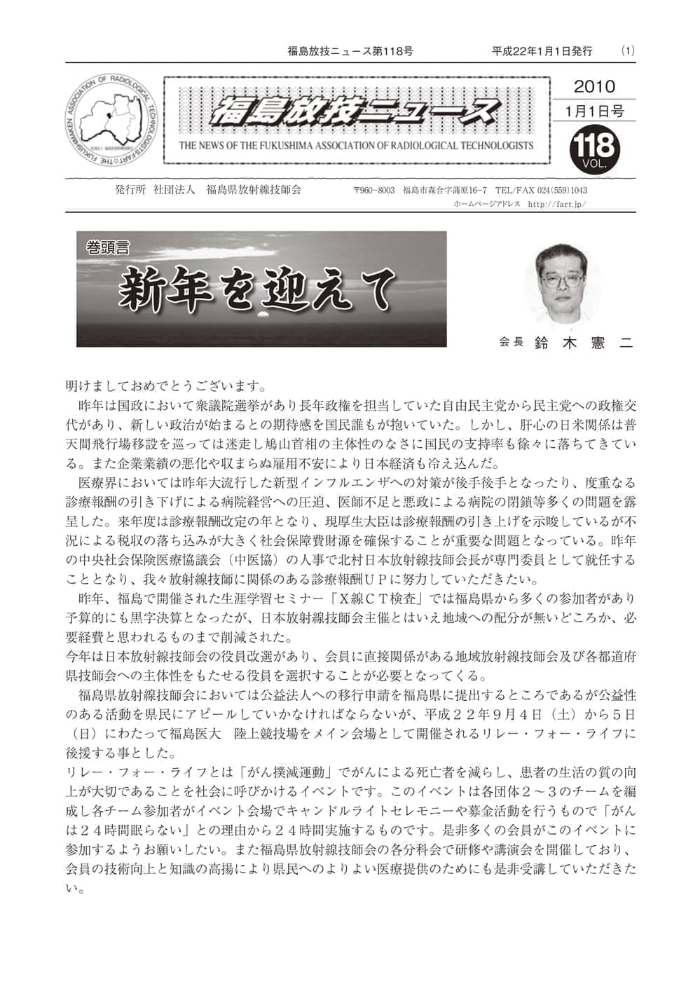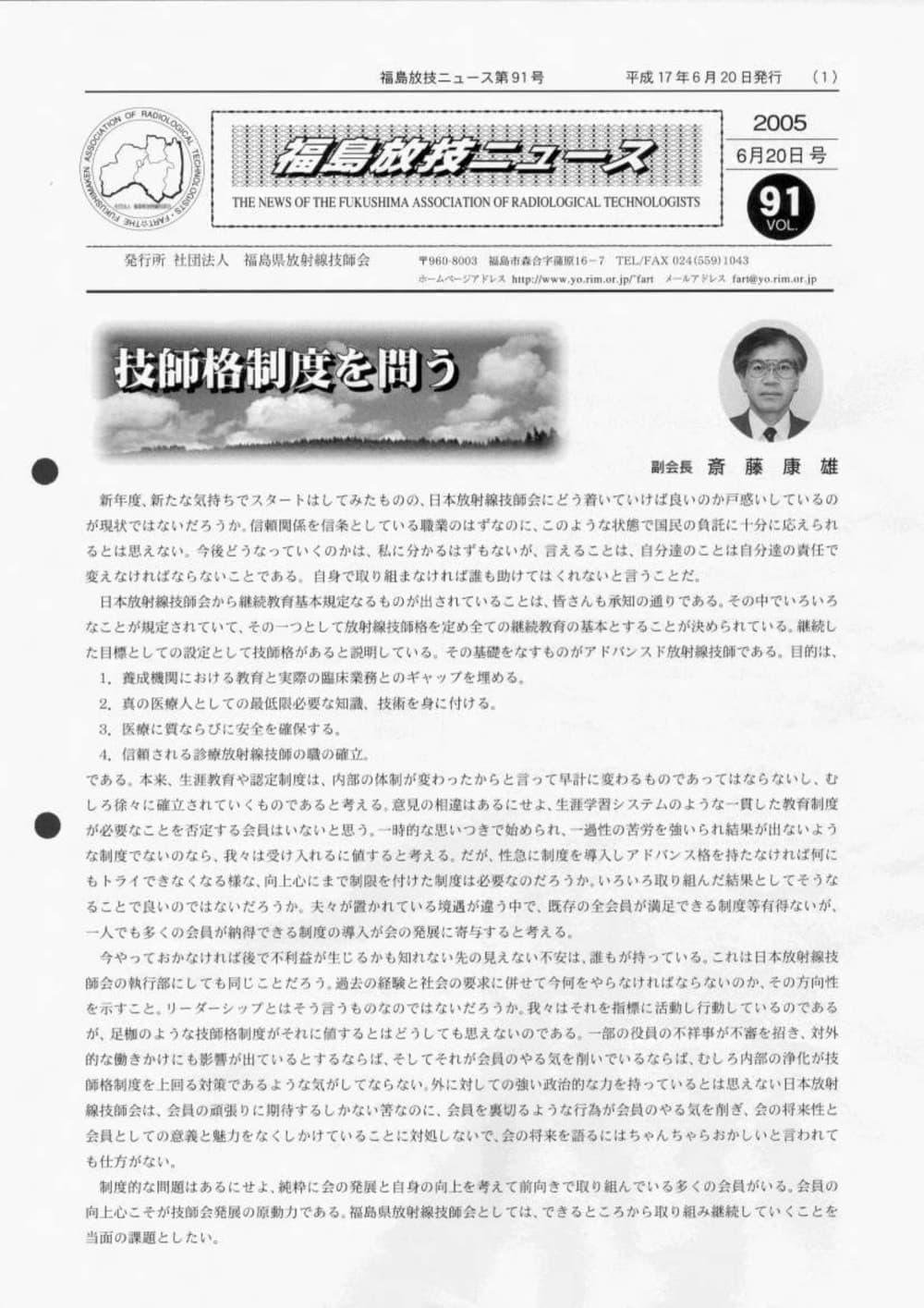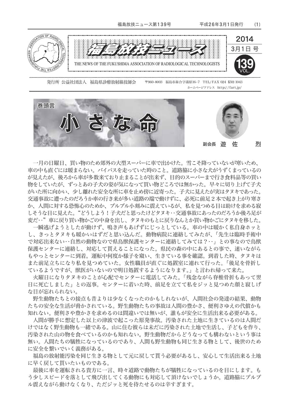 福島放技ニュースのバックナンバーをPDFファイルで閲覧することができます。 注1)Adobe Reader 6.0以上でご覧ください。 注2)ファイルサイズが大きいので、ダウンロードしてご覧頂くことをお勧めします。 【 2026年 】 No.210 No.211 【 2025年 】 No.204 No.205 No.206 No.207 No.208 No.209 【 2024年 】 No.198 No.199 No.200 No.201 No.202 No.203 【 2023年 】 No.192 No.193 No.194 No.195 No.196 No.197 【 2022年 】 No.186 No.187 No.188 No.189 No.190 No.191 【 2021年 】 No.180 No.181 No.182 No.183 No.184 No.185 【 2020年 】 No.174 No.175 No.176 No.177 No.178 No.179 【 2019年 】 No.168 No.169 No.170 No.171 No.172 No.173 【 2018年 】 No.163 No.164 No.165 No.166 No.167 【 2017年 】 No.161 No.162 No.156 No.157 No.158 No.159 No.160 【 2016年 】 No.155 No.150 No.151 No.152 No.153 No.154 【 2015年 】 No.149 No.144 No.145 No.146 No.147 No.148 【 2014年 】 No.143 No.138 No.139 No.140 No.141 No.142 【 2013年 】 No.133 No.134 No.135 No.136 No.137 【 2012年 】 No.129 No.130 No.131 No.132 【 2011年 】 No.124 No.125 No.126 No.127 No.128 【 2010年 】 No.123 No.118 No.119 No.120 No.121 No.122 【 2009年 】 No.113 No.114 No.115 No.116 No.117 【 2008年 】 No.112 No.107 No.108 No.109 No.110 No.111 【 2007年 】 No.106 No.101 No.102 No.103 No.104 No.105 【 2006年 】 No.100 No.095 No.096 No.097 No.098 No.099 【 2005年 】 No.094-01 No.094-02 No.089 No.090 No.091 No.092 No.093 HOME | 福放技ニュース 前のページ へ 次のページへ 技師会長よりごあいさつ お知らせ分科会・研究会・地区情報告示研修開催情報イベントカレンダー令和7年度 総会議案書役員改選および選挙 >役員改選告示 >役員改選立候補者 会員・医療従事者の皆様へ福放技ニュースメールマガジンに関して生涯ポイント付与について会報 技師会所有の物品貸出について >マンモグラフィトレーニング用ベスト >作業環境測定機器 会員専用情報パスワードについて 各種申請書ダウンロード 委員会報告各委員会ファイル共有 放射線に関する情報 ICRP勧告 MRI磁場の危険性 放射線 Q&A WBCに関する資料 簡易除染マニュアル