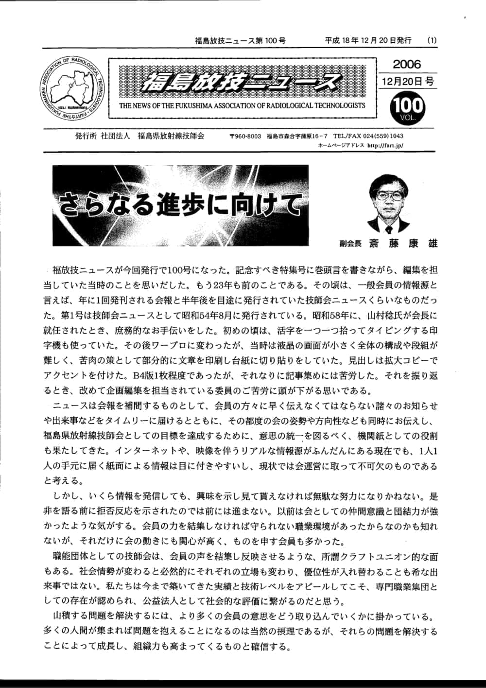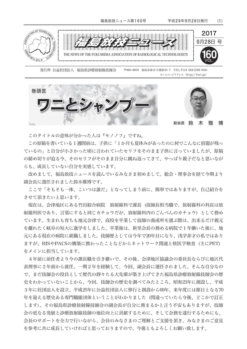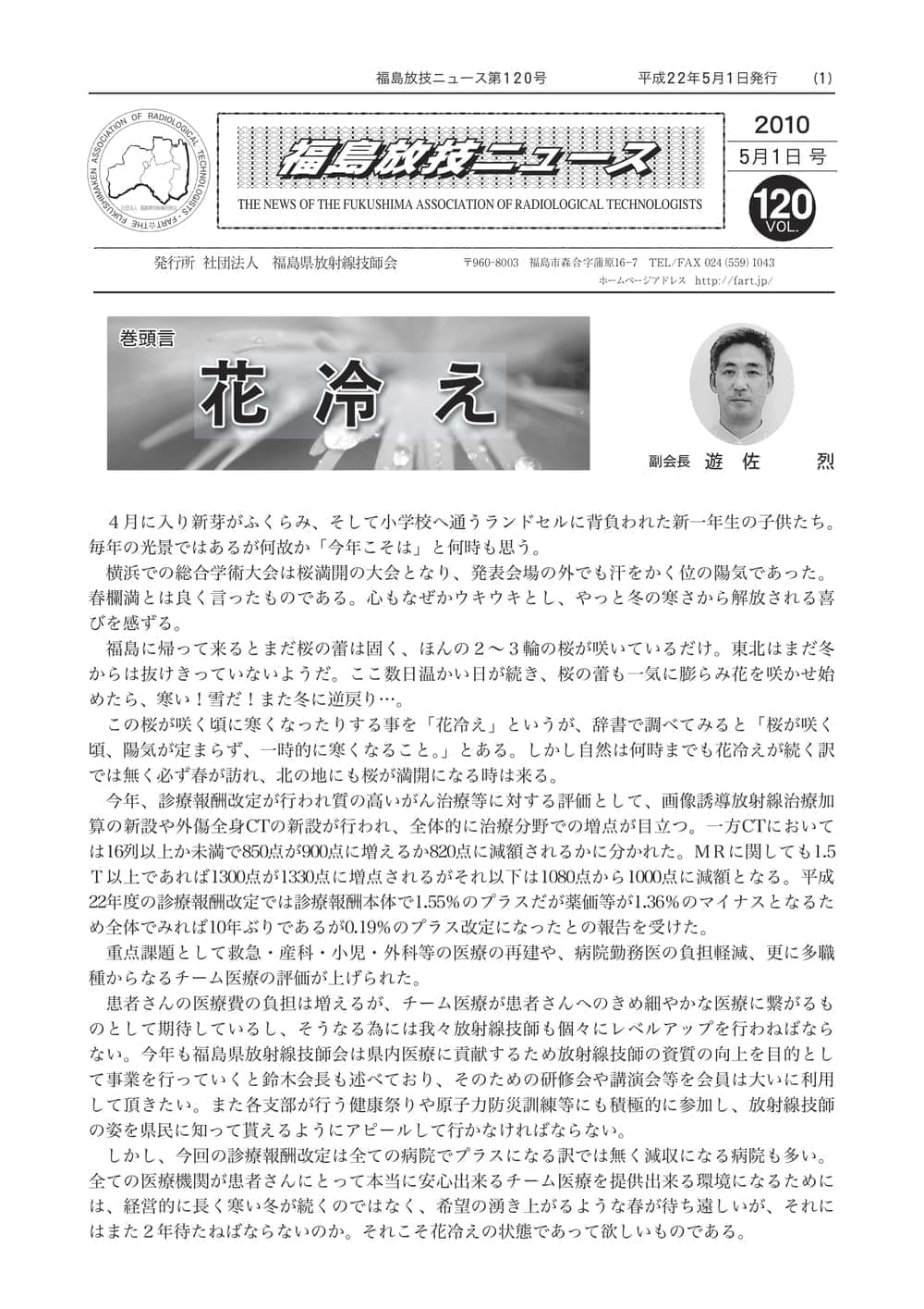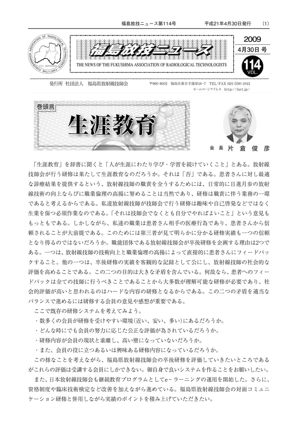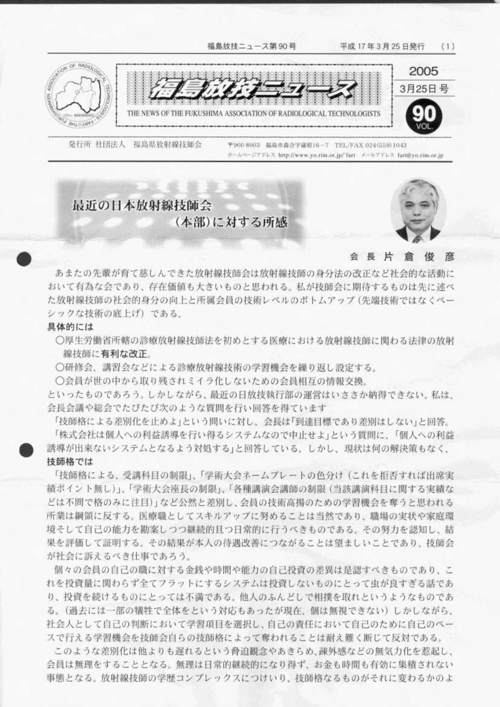 福島放技ニュースのバックナンバーをPDFファイルで閲覧することができます。 注1)Adobe Reader 6.0以上でご覧ください。 注2)ファイルサイズが大きいので、ダウンロードしてご覧頂くことをお勧めします。 【 2026年 】 No.210 No.211 【 2025年 】 No.204 No.205 No.206 No.207 No.208 No.209 【 2024年 】 No.198 No.199 No.200 No.201 No.202 No.203 【 2023年 】 No.192 No.193 No.194 No.195 No.196 No.197 【 2022年 】 No.186 No.187 No.188 No.189 No.190 No.191 【 2021年 】 No.180 No.181 No.182 No.183 No.184 No.185 【 2020年 】 No.174 No.175 No.176 No.177 No.178 No.179 【 2019年 】 No.168 No.169 No.170 No.171 No.172 No.173 【 2018年 】 No.163 No.164 No.165 No.166 No.167 【 2017年 】 No.161 No.162 No.156 No.157 No.158 No.159 No.160 【 2016年 】 No.155 No.150 No.151 No.152 No.153 No.154 【 2015年 】 No.149 No.144 No.145 No.146 No.147 No.148 【 2014年 】 No.143 No.138 No.139 No.140 No.141 No.142 【 2013年 】 No.133 No.134 No.135 No.136 No.137 【 2012年 】 No.129 No.130 No.131 No.132 【 2011年 】 No.124 No.125 No.126 No.127 No.128 【 2010年 】 No.123 No.118 No.119 No.120 No.121 No.122 【 2009年 】 No.113 No.114 No.115 No.116 No.117 【 2008年 】 No.112 No.107 No.108 No.109 No.110 No.111 【 2007年 】 No.106 No.101 No.102 No.103 No.104 No.105 【 2006年 】 No.100 No.095 No.096 No.097 No.098 No.099 【 2005年 】 No.094-01 No.094-02 No.089 No.090 No.091 No.092 No.093 HOME | 福放技ニュース 前のページ へ 次のページへ 技師会長よりごあいさつ お知らせ分科会・研究会・地区情報告示研修開催情報イベントカレンダー令和7年度 総会議案書役員改選および選挙 >役員改選告示 >役員改選立候補者 会員・医療従事者の皆様へ福放技ニュースメールマガジンに関して生涯ポイント付与について会報 技師会所有の物品貸出について >マンモグラフィトレーニング用ベスト >作業環境測定機器 会員専用情報パスワードについて 各種申請書ダウンロード 委員会報告各委員会ファイル共有 放射線に関する情報 ICRP勧告 MRI磁場の危険性 放射線 Q&A WBCに関する資料 簡易除染マニュアル