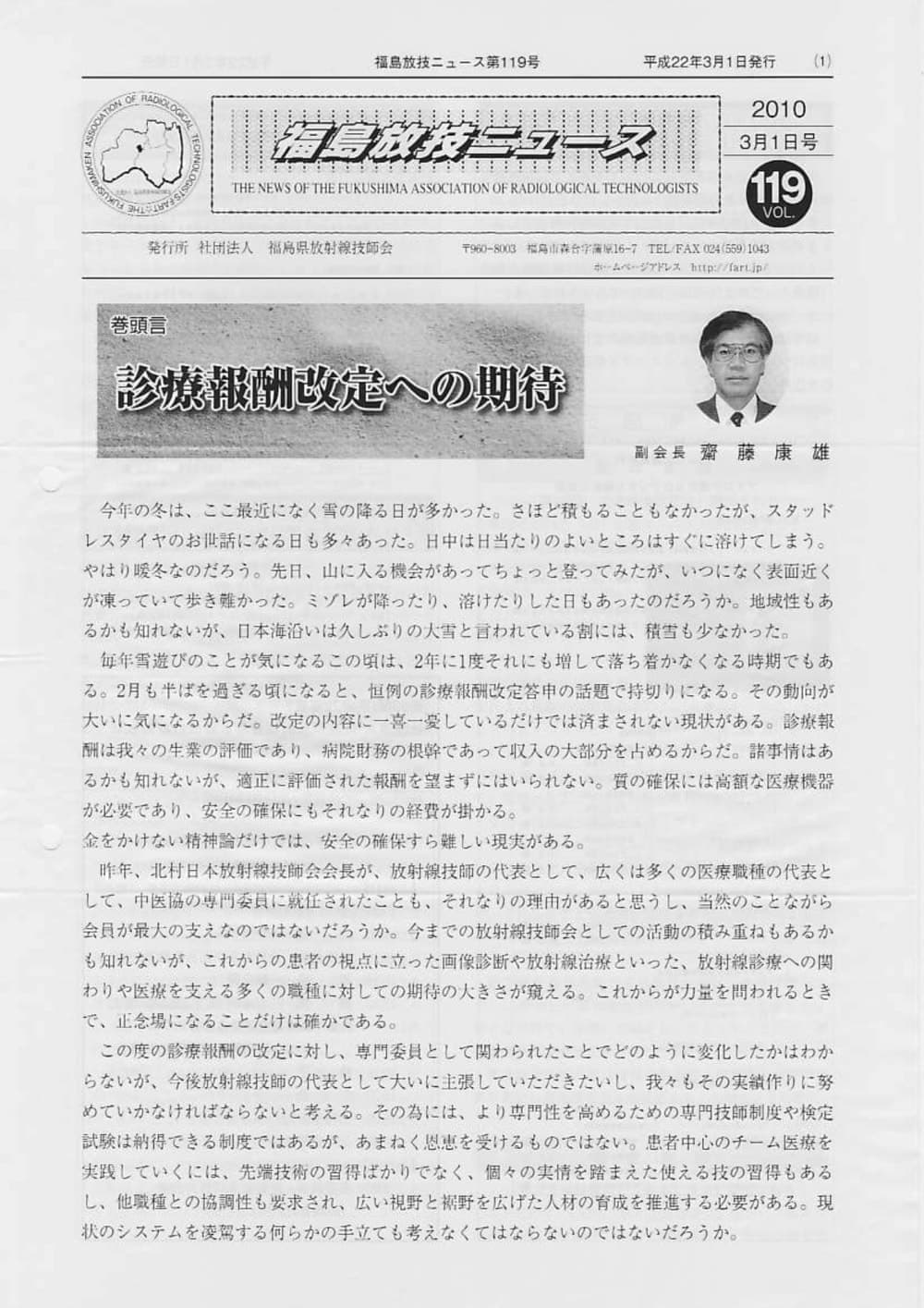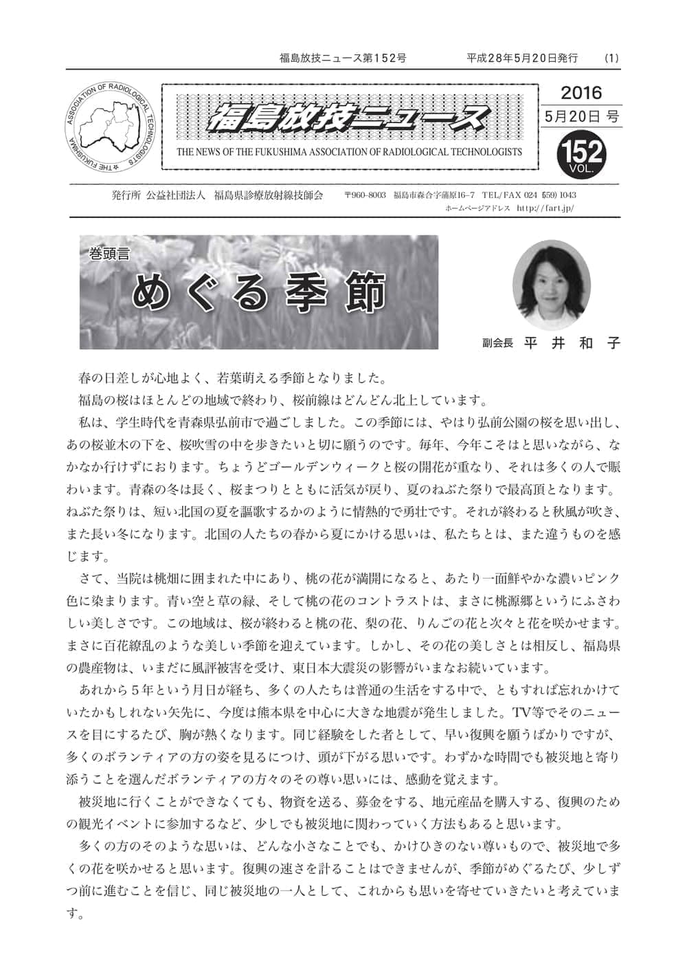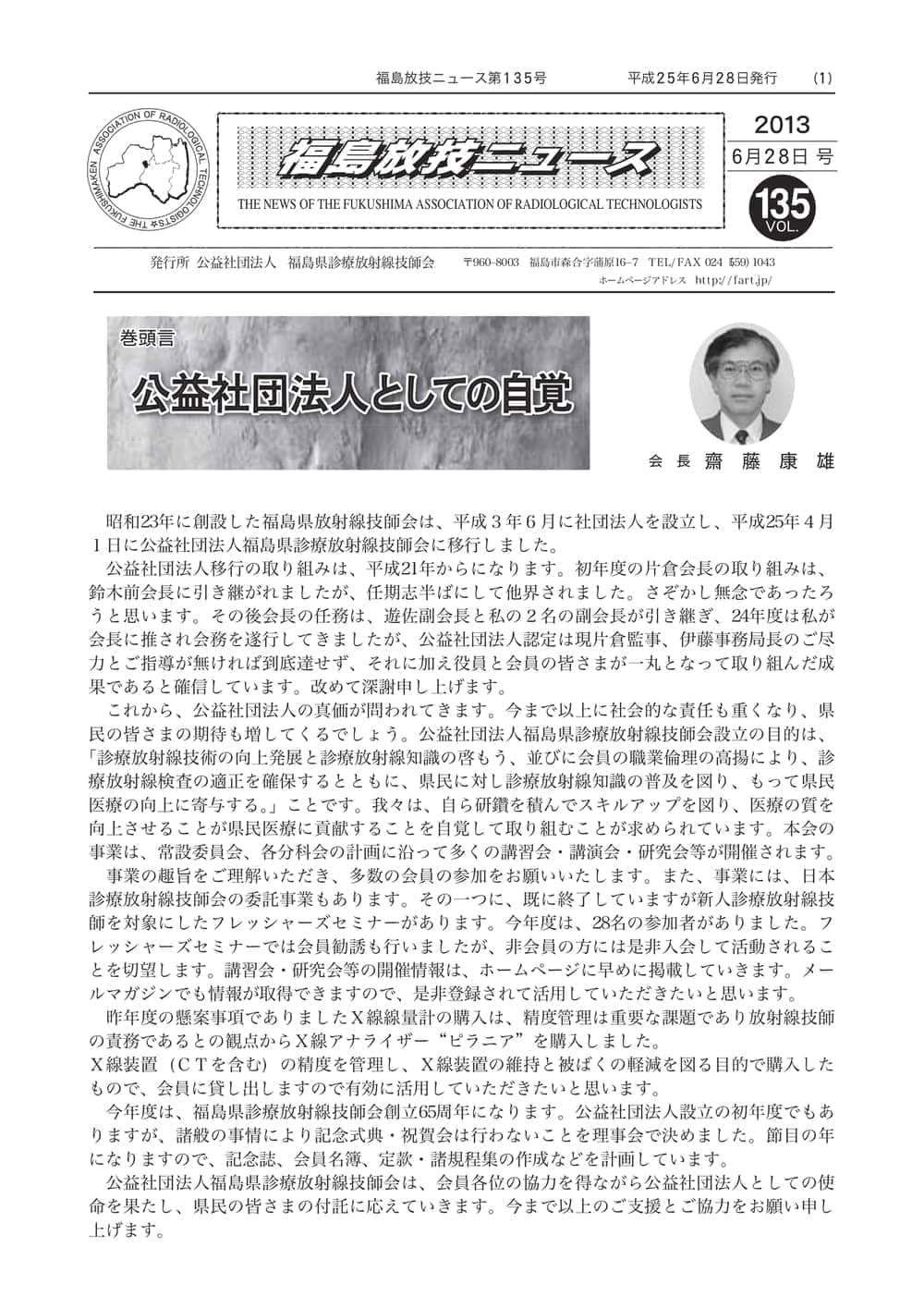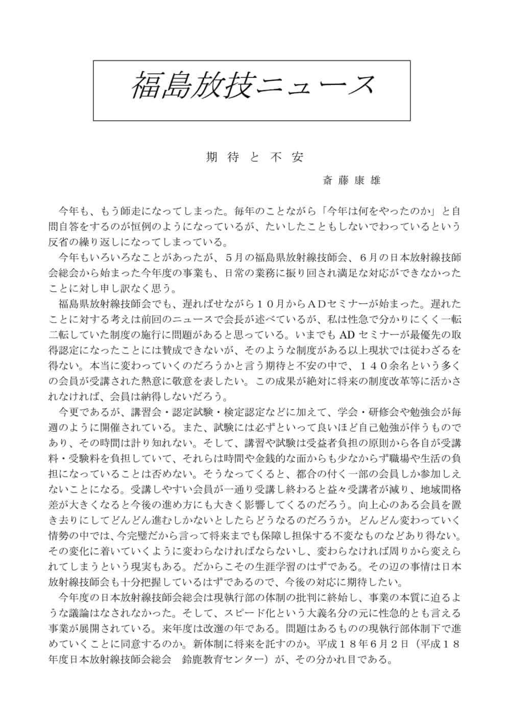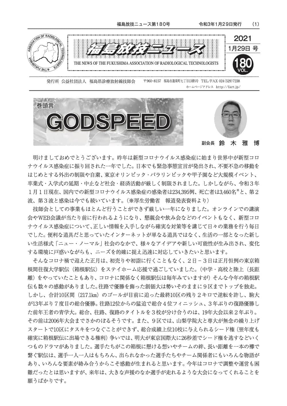 福島放技ニュースのバックナンバーをPDFファイルで閲覧することができます。 注1)Adobe Reader 6.0以上でご覧ください。 注2)ファイルサイズが大きいので、ダウンロードしてご覧頂くことをお勧めします。 【 2026年 】 No.210 No.211 【 2025年 】 No.204 No.205 No.206 No.207 No.208 No.209 【 2024年 】 No.198 No.199 No.200 No.201 No.202 No.203 【 2023年 】 No.192 No.193 No.194 No.195 No.196 No.197 【 2022年 】 No.186 No.187 No.188 No.189 No.190 No.191 【 2021年 】 No.180 No.181 No.182 No.183 No.184 No.185 【 2020年 】 No.174 No.175 No.176 No.177 No.178 No.179 【 2019年 】 No.168 No.169 No.170 No.171 No.172 No.173 【 2018年 】 No.163 No.164 No.165 No.166 No.167 【 2017年 】 No.161 No.162 No.156 No.157 No.158 No.159 No.160 【 2016年 】 No.155 No.150 No.151 No.152 No.153 No.154 【 2015年 】 No.149 No.144 No.145 No.146 No.147 No.148 【 2014年 】 No.143 No.138 No.139 No.140 No.141 No.142 【 2013年 】 No.133 No.134 No.135 No.136 No.137 【 2012年 】 No.129 No.130 No.131 No.132 【 2011年 】 No.124 No.125 No.126 No.127 No.128 【 2010年 】 No.123 No.118 No.119 No.120 No.121 No.122 【 2009年 】 No.113 No.114 No.115 No.116 No.117 【 2008年 】 No.112 No.107 No.108 No.109 No.110 No.111 【 2007年 】 No.106 No.101 No.102 No.103 No.104 No.105 【 2006年 】 No.100 No.095 No.096 No.097 No.098 No.099 【 2005年 】 No.094-01 No.094-02 No.089 No.090 No.091 No.092 No.093 HOME | 福放技ニュース 前のページ へ 次のページへ 技師会長よりごあいさつ お知らせ分科会・研究会・地区情報告示研修開催情報イベントカレンダー令和7年度 総会議案書役員改選および選挙 >役員改選告示 >役員改選立候補者 会員・医療従事者の皆様へ福放技ニュースメールマガジンに関して生涯ポイント付与について会報 技師会所有の物品貸出について >マンモグラフィトレーニング用ベスト >作業環境測定機器 会員専用情報パスワードについて 各種申請書ダウンロード 委員会報告各委員会ファイル共有 放射線に関する情報 ICRP勧告 MRI磁場の危険性 放射線 Q&A WBCに関する資料 簡易除染マニュアル
