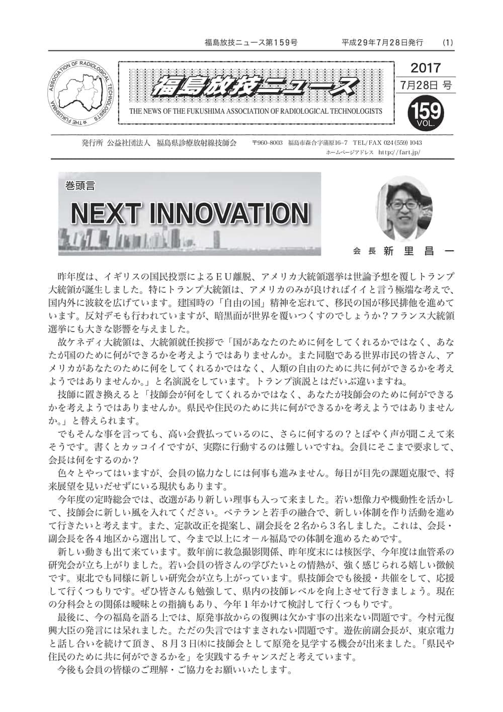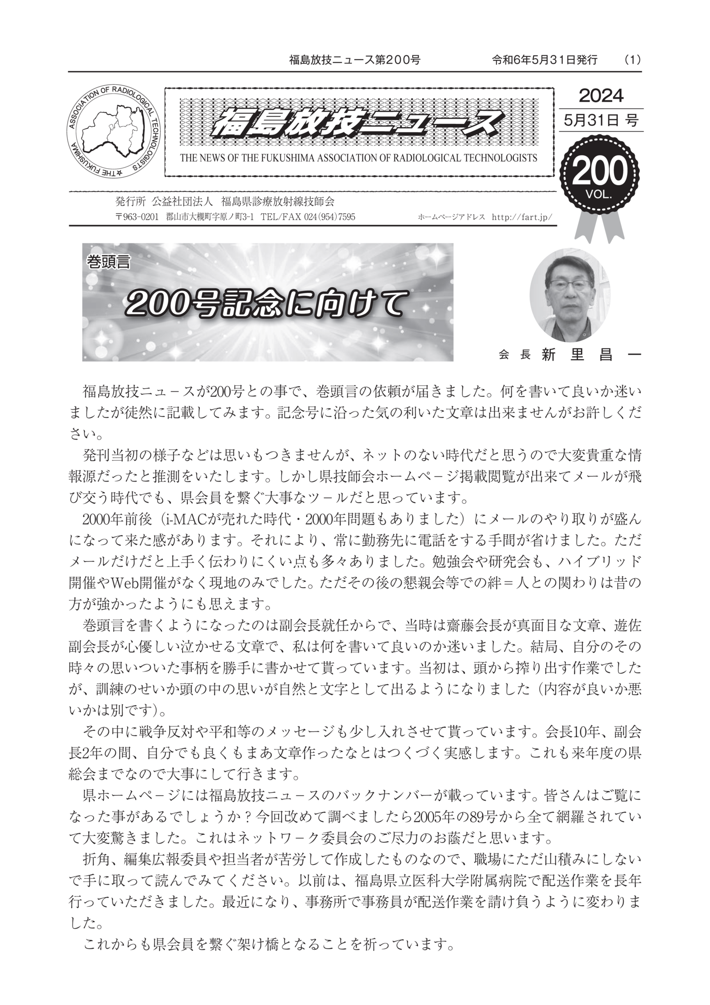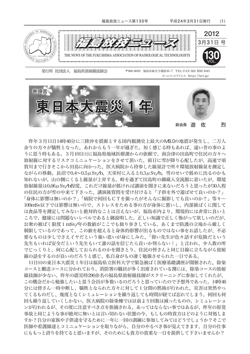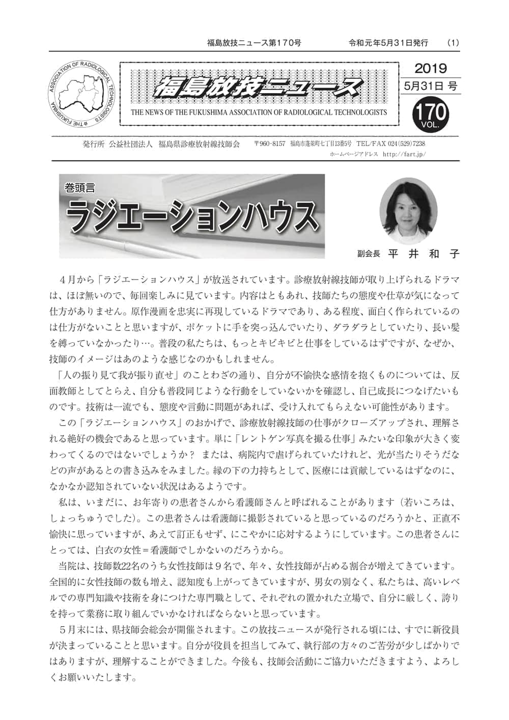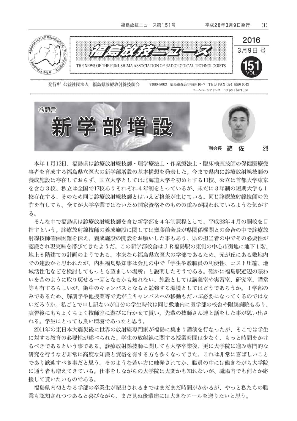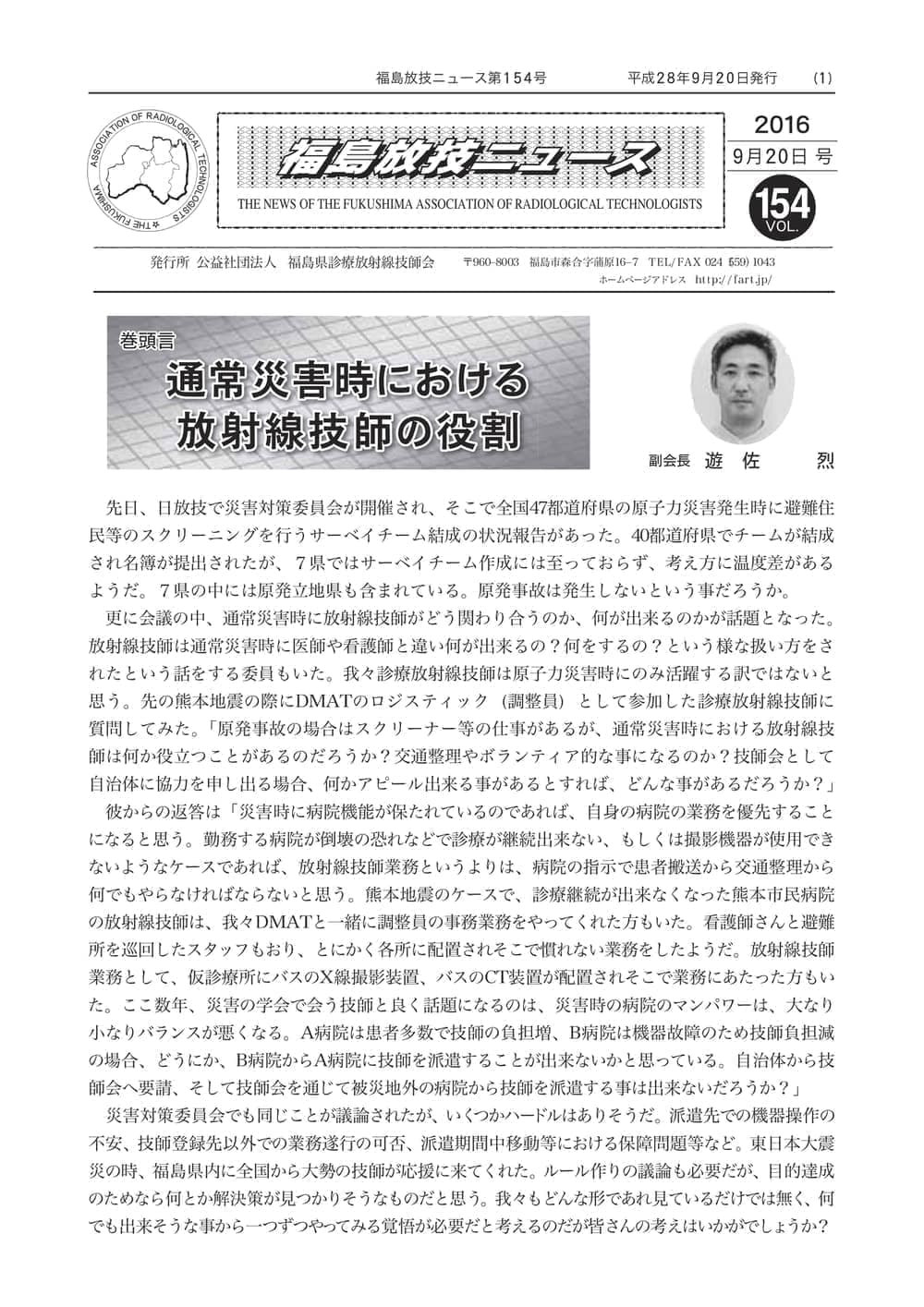 福島放技ニュースのバックナンバーをPDFファイルで閲覧することができます。 注1)Adobe Reader 6.0以上でご覧ください。 注2)ファイルサイズが大きいので、ダウンロードしてご覧頂くことをお勧めします。 【 2026年 】 No.210 No.211 【 2025年 】 No.204 No.205 No.206 No.207 No.208 No.209 【 2024年 】 No.198 No.199 No.200 No.201 No.202 No.203 【 2023年 】 No.192 No.193 No.194 No.195 No.196 No.197 【 2022年 】 No.186 No.187 No.188 No.189 No.190 No.191 【 2021年 】 No.180 No.181 No.182 No.183 No.184 No.185 【 2020年 】 No.174 No.175 No.176 No.177 No.178 No.179 【 2019年 】 No.168 No.169 No.170 No.171 No.172 No.173 【 2018年 】 No.163 No.164 No.165 No.166 No.167 【 2017年 】 No.161 No.162 No.156 No.157 No.158 No.159 No.160 【 2016年 】 No.155 No.150 No.151 No.152 No.153 No.154 【 2015年 】 No.149 No.144 No.145 No.146 No.147 No.148 【 2014年 】 No.143 No.138 No.139 No.140 No.141 No.142 【 2013年 】 No.133 No.134 No.135 No.136 No.137 【 2012年 】 No.129 No.130 No.131 No.132 【 2011年 】 No.124 No.125 No.126 No.127 No.128 【 2010年 】 No.123 No.118 No.119 No.120 No.121 No.122 【 2009年 】 No.113 No.114 No.115 No.116 No.117 【 2008年 】 No.112 No.107 No.108 No.109 No.110 No.111 【 2007年 】 No.106 No.101 No.102 No.103 No.104 No.105 【 2006年 】 No.100 No.095 No.096 No.097 No.098 No.099 【 2005年 】 No.094-01 No.094-02 No.089 No.090 No.091 No.092 No.093 HOME | 福放技ニュース 前のページ へ 次のページへ 技師会長よりごあいさつ お知らせ分科会・研究会・地区情報告示研修開催情報イベントカレンダー令和7年度 総会議案書役員改選および選挙 >役員改選告示 >役員改選立候補者 会員・医療従事者の皆様へ福放技ニュースメールマガジンに関して生涯ポイント付与について会報 技師会所有の物品貸出について >マンモグラフィトレーニング用ベスト >作業環境測定機器 会員専用情報パスワードについて 各種申請書ダウンロード 委員会報告各委員会ファイル共有 放射線に関する情報 ICRP勧告 MRI磁場の危険性 放射線 Q&A WBCに関する資料 簡易除染マニュアル
