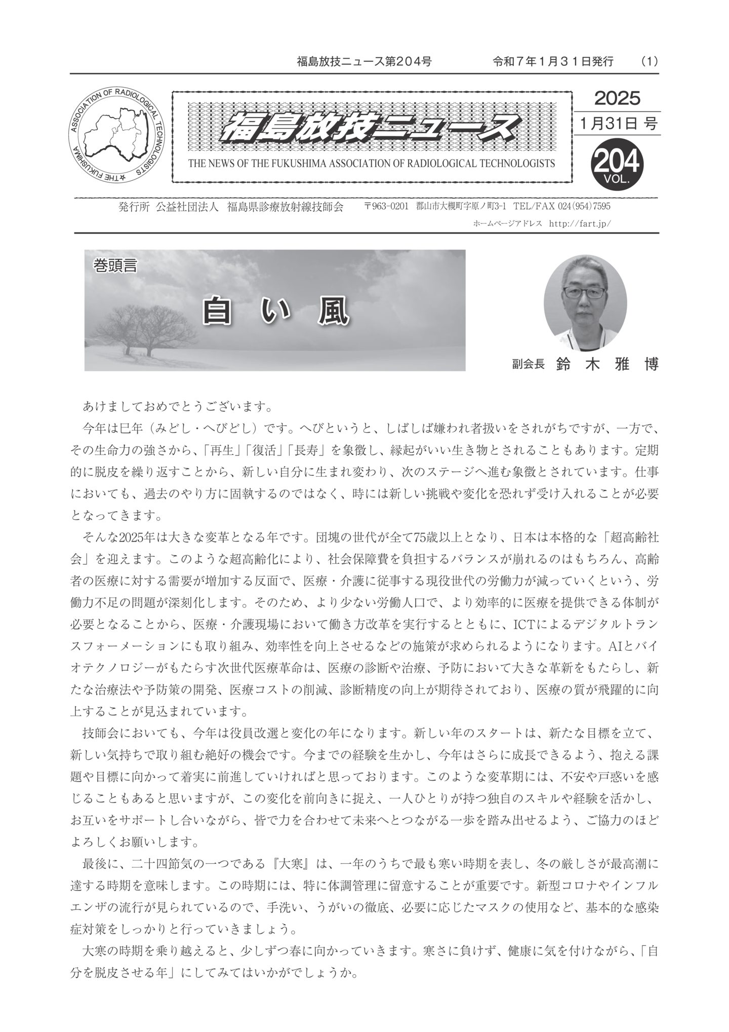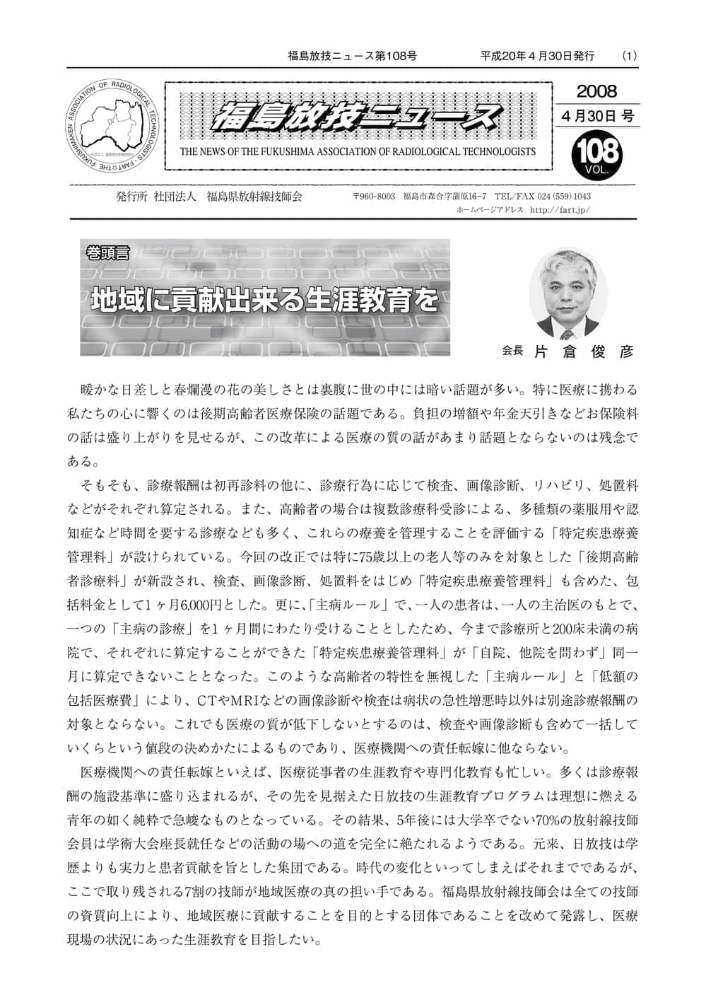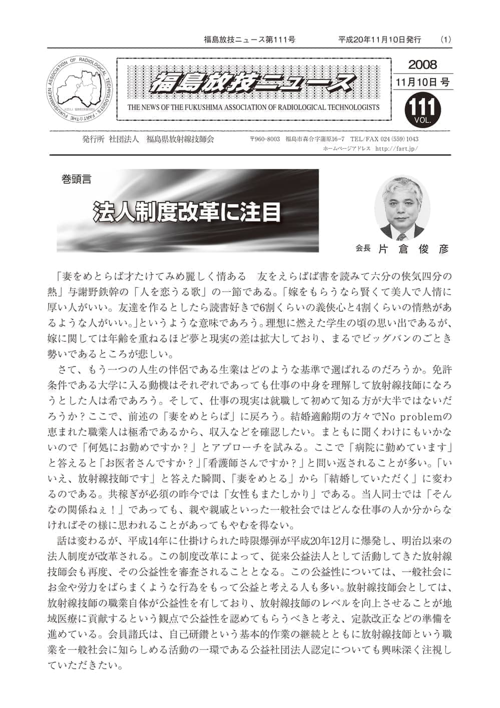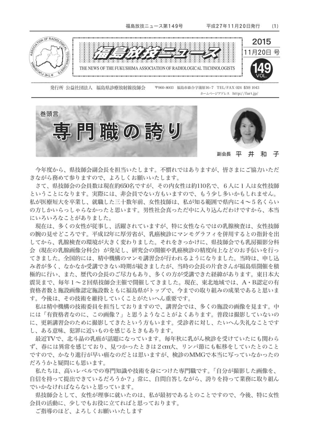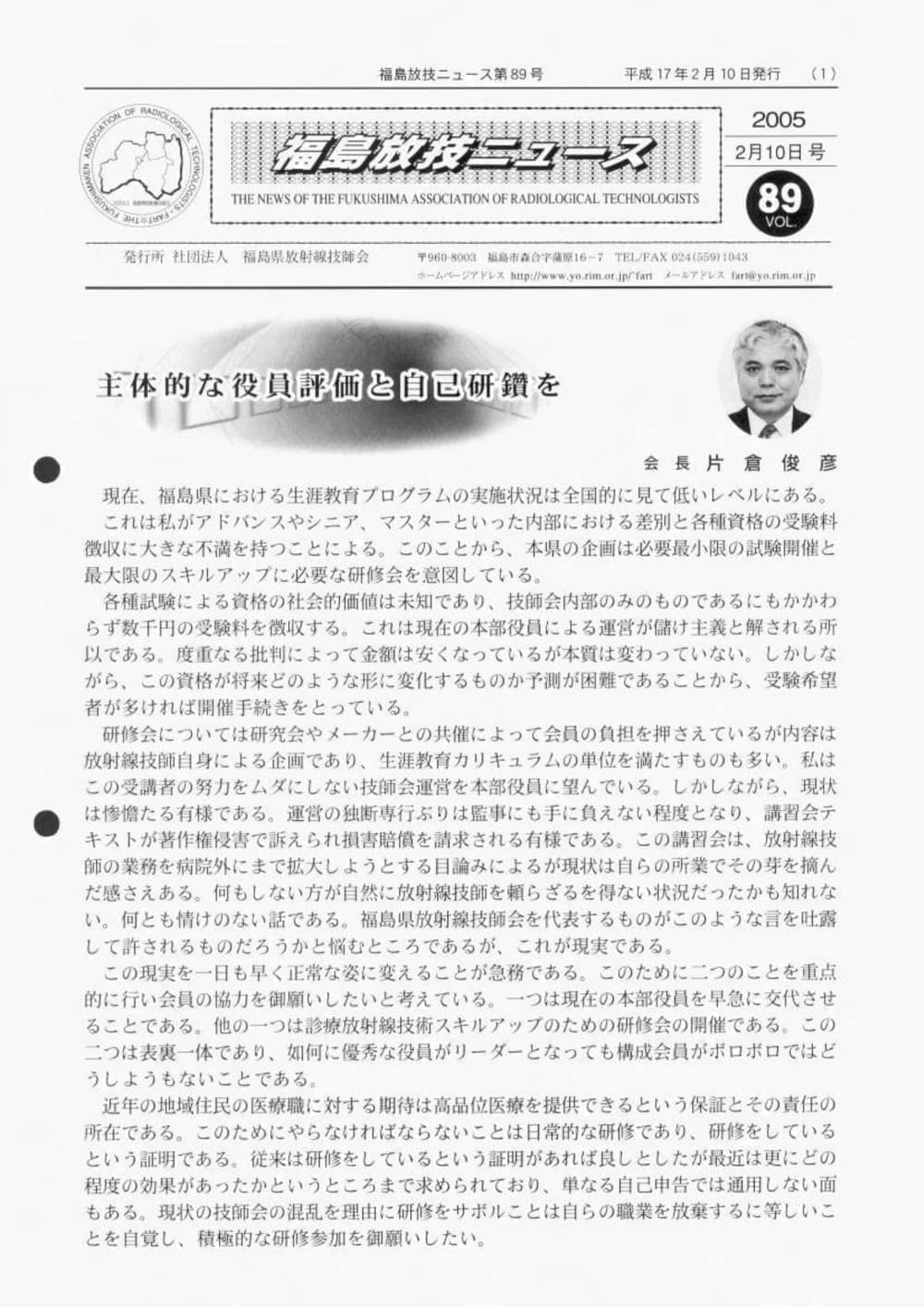 福島放技ニュースのバックナンバーをPDFファイルで閲覧することができます。 注1)Adobe Reader 6.0以上でご覧ください。 注2)ファイルサイズが大きいので、ダウンロードしてご覧頂くことをお勧めします。 【 2026年 】 No.210 No.211 【 2025年 】 No.204 No.205 No.206 No.207 No.208 No.209 【 2024年 】 No.198 No.199 No.200 No.201 No.202 No.203 【 2023年 】 No.192 No.193 No.194 No.195 No.196 No.197 【 2022年 】 No.186 No.187 No.188 No.189 No.190 No.191 【 2021年 】 No.180 No.181 No.182 No.183 No.184 No.185 【 2020年 】 No.174 No.175 No.176 No.177 No.178 No.179 【 2019年 】 No.168 No.169 No.170 No.171 No.172 No.173 【 2018年 】 No.163 No.164 No.165 No.166 No.167 【 2017年 】 No.161 No.162 No.156 No.157 No.158 No.159 No.160 【 2016年 】 No.155 No.150 No.151 No.152 No.153 No.154 【 2015年 】 No.149 No.144 No.145 No.146 No.147 No.148 【 2014年 】 No.143 No.138 No.139 No.140 No.141 No.142 【 2013年 】 No.133 No.134 No.135 No.136 No.137 【 2012年 】 No.129 No.130 No.131 No.132 【 2011年 】 No.124 No.125 No.126 No.127 No.128 【 2010年 】 No.123 No.118 No.119 No.120 No.121 No.122 【 2009年 】 No.113 No.114 No.115 No.116 No.117 【 2008年 】 No.112 No.107 No.108 No.109 No.110 No.111 【 2007年 】 No.106 No.101 No.102 No.103 No.104 No.105 【 2006年 】 No.100 No.095 No.096 No.097 No.098 No.099 【 2005年 】 No.094-01 No.094-02 No.089 No.090 No.091 No.092 No.093 HOME | 福放技ニュース 前のページ へ 次のページへ 技師会長よりごあいさつ お知らせ分科会・研究会・地区情報告示研修開催情報イベントカレンダー令和7年度 総会議案書役員改選および選挙 >役員改選告示 >役員改選立候補者 会員・医療従事者の皆様へ福放技ニュースメールマガジンに関して生涯ポイント付与について会報 技師会所有の物品貸出について >マンモグラフィトレーニング用ベスト >作業環境測定機器 会員専用情報パスワードについて 各種申請書ダウンロード 委員会報告各委員会ファイル共有 放射線に関する情報 ICRP勧告 MRI磁場の危険性 放射線 Q&A WBCに関する資料 簡易除染マニュアル