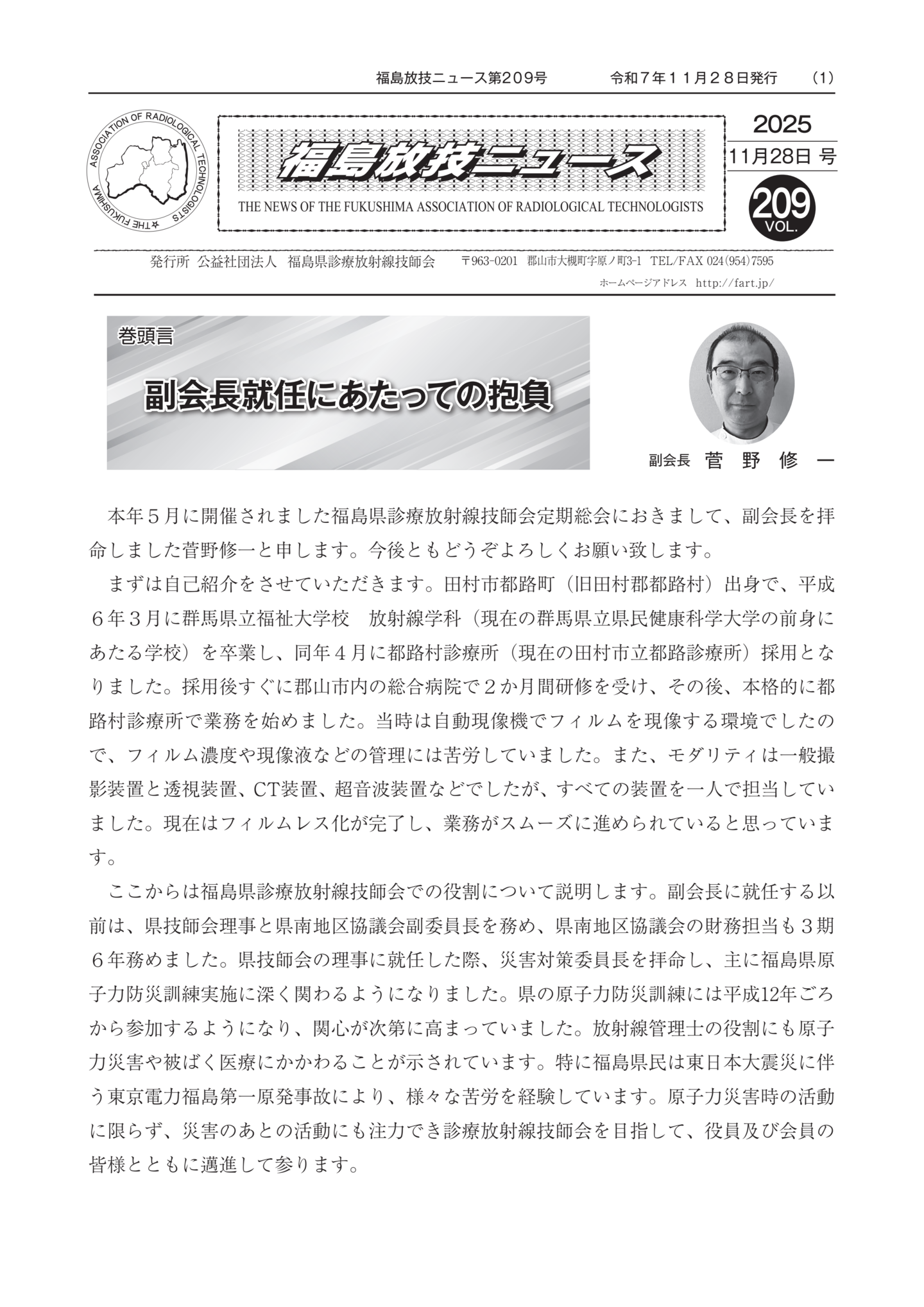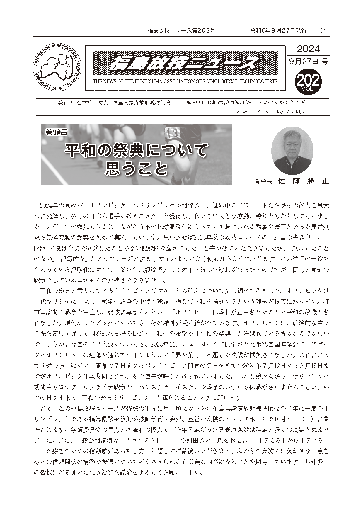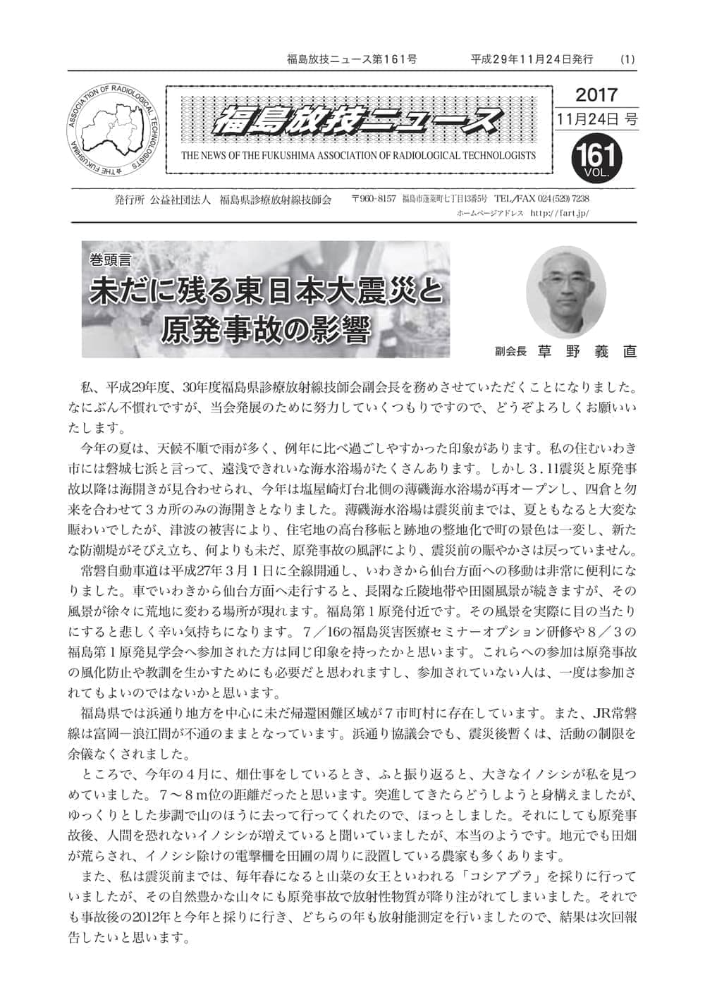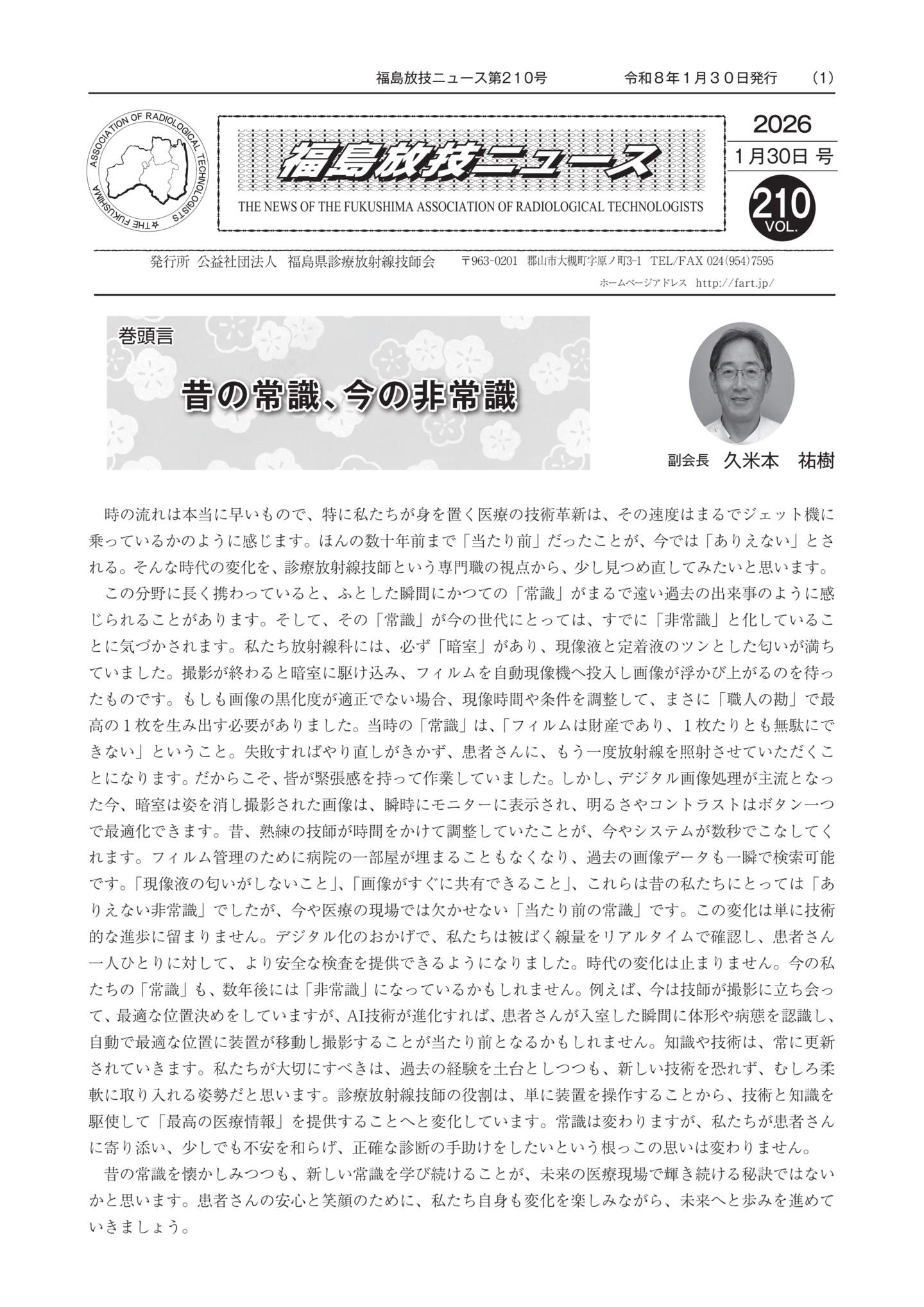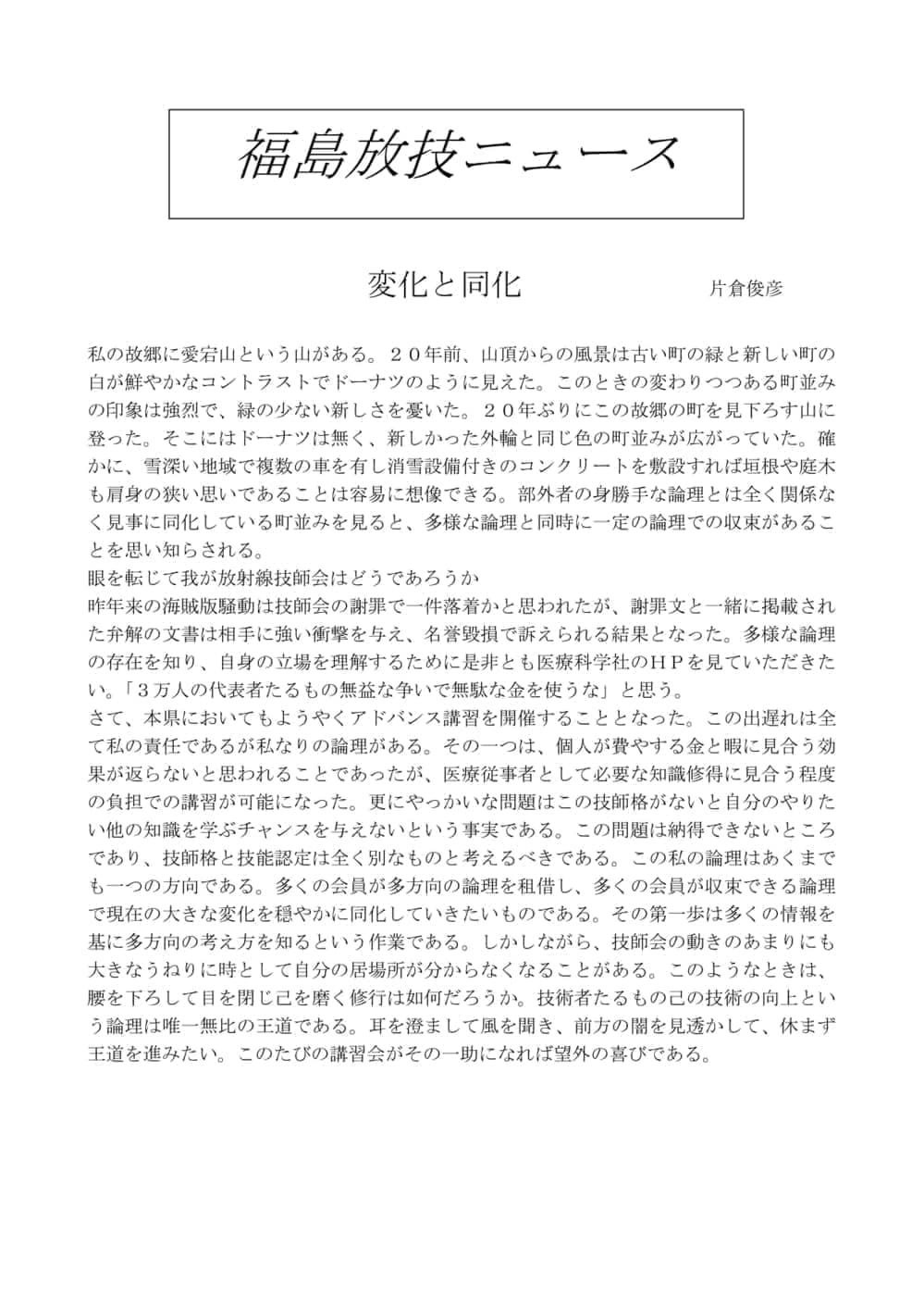 福島放技ニュースのバックナンバーをPDFファイルで閲覧することができます。 注1)Adobe Reader 6.0以上でご覧ください。 注2)ファイルサイズが大きいので、ダウンロードしてご覧頂くことをお勧めします。 【 2026年 】 No.210 No.211 【 2025年 】 No.204 No.205 No.206 No.207 No.208 No.209 【 2024年 】 No.198 No.199 No.200 No.201 No.202 No.203 【 2023年 】 No.192 No.193 No.194 No.195 No.196 No.197 【 2022年 】 No.186 No.187 No.188 No.189 No.190 No.191 【 2021年 】 No.180 No.181 No.182 No.183 No.184 No.185 【 2020年 】 No.174 No.175 No.176 No.177 No.178 No.179 【 2019年 】 No.168 No.169 No.170 No.171 No.172 No.173 【 2018年 】 No.163 No.164 No.165 No.166 No.167 【 2017年 】 No.161 No.162 No.156 No.157 No.158 No.159 No.160 【 2016年 】 No.155 No.150 No.151 No.152 No.153 No.154 【 2015年 】 No.149 No.144 No.145 No.146 No.147 No.148 【 2014年 】 No.143 No.138 No.139 No.140 No.141 No.142 【 2013年 】 No.133 No.134 No.135 No.136 No.137 【 2012年 】 No.129 No.130 No.131 No.132 【 2011年 】 No.124 No.125 No.126 No.127 No.128 【 2010年 】 No.123 No.118 No.119 No.120 No.121 No.122 【 2009年 】 No.113 No.114 No.115 No.116 No.117 【 2008年 】 No.112 No.107 No.108 No.109 No.110 No.111 【 2007年 】 No.106 No.101 No.102 No.103 No.104 No.105 【 2006年 】 No.100 No.095 No.096 No.097 No.098 No.099 【 2005年 】 No.094-01 No.094-02 No.089 No.090 No.091 No.092 No.093 HOME | 福放技ニュース 前のページ へ 次のページへ 技師会長よりごあいさつ お知らせ分科会・研究会・地区情報告示研修開催情報イベントカレンダー令和7年度 総会議案書役員改選および選挙 >役員改選告示 >役員改選立候補者 会員・医療従事者の皆様へ福放技ニュースメールマガジンに関して生涯ポイント付与について会報 技師会所有の物品貸出について >マンモグラフィトレーニング用ベスト >作業環境測定機器 会員専用情報パスワードについて 各種申請書ダウンロード 委員会報告各委員会ファイル共有 放射線に関する情報 ICRP勧告 MRI磁場の危険性 放射線 Q&A WBCに関する資料 簡易除染マニュアル