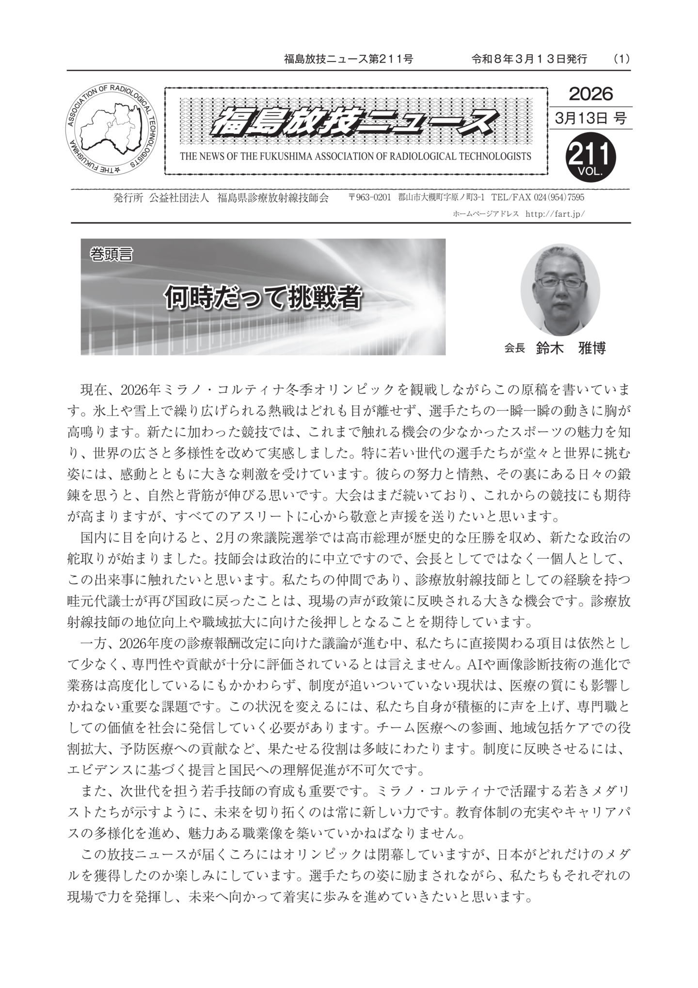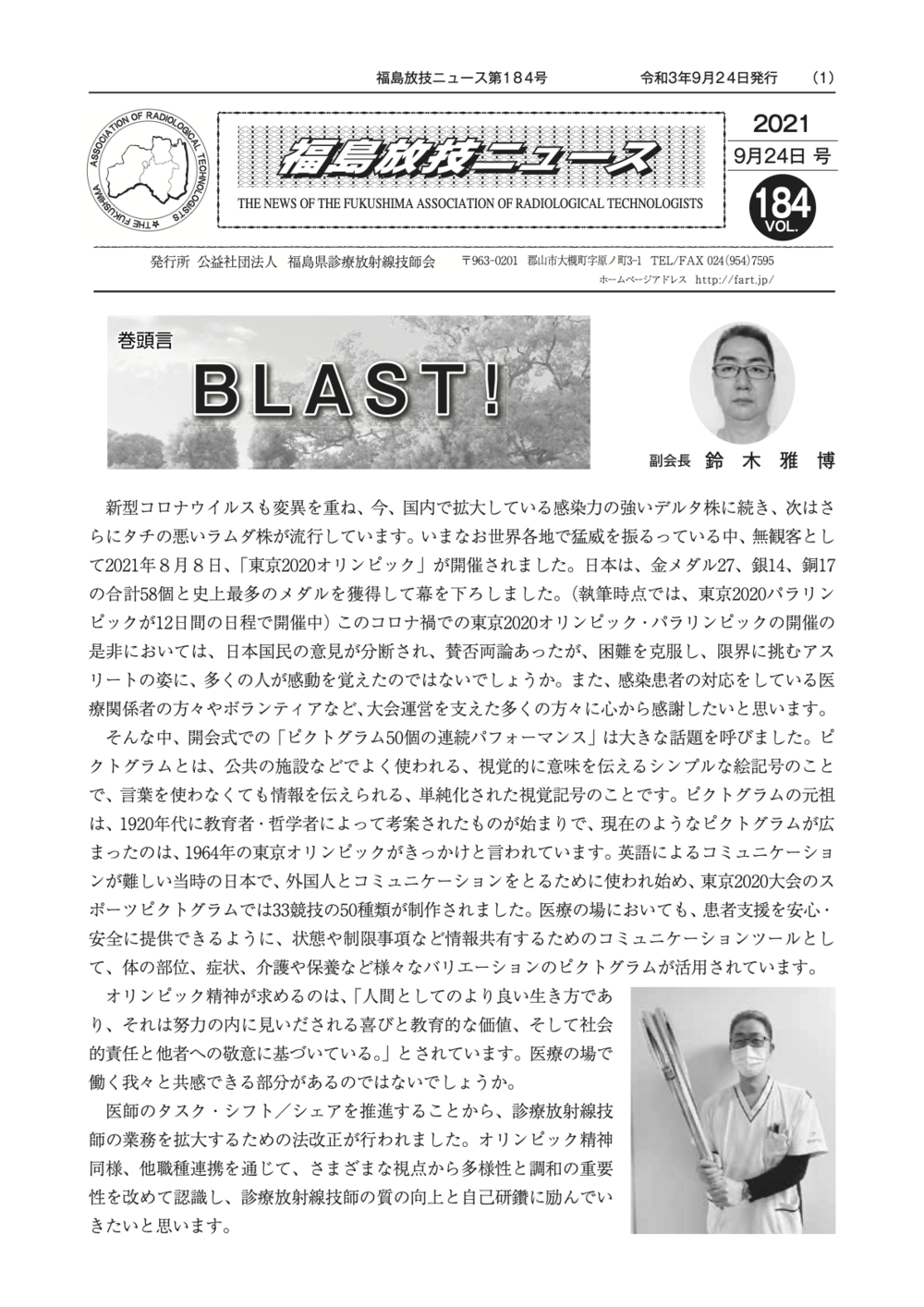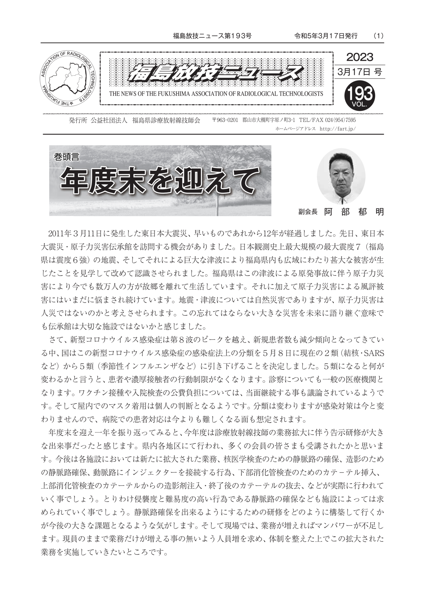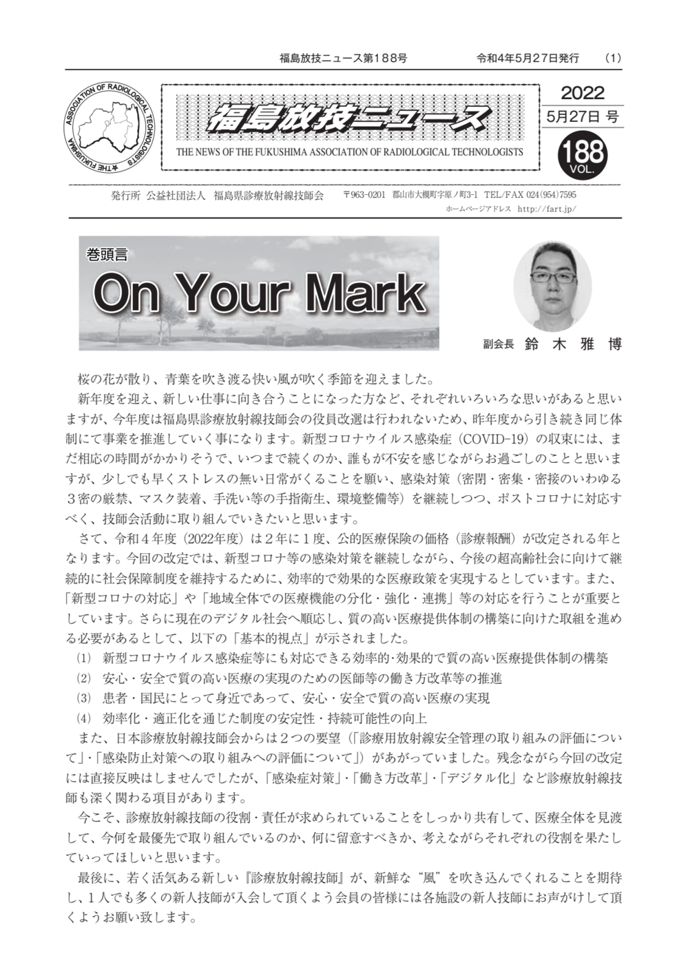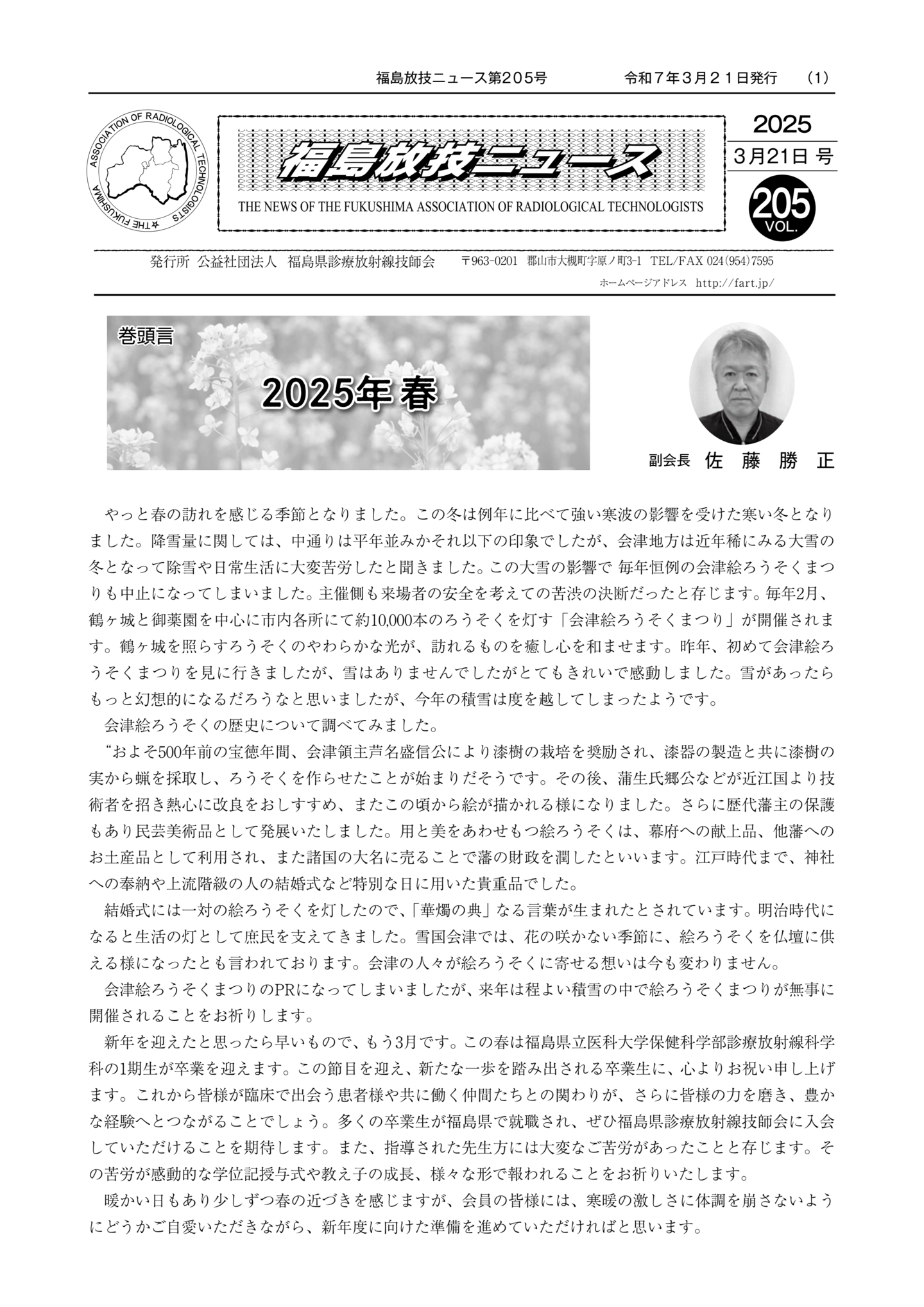 福島放技ニュースのバックナンバーをPDFファイルで閲覧することができます。 注1)Adobe Reader 6.0以上でご覧ください。 注2)ファイルサイズが大きいので、ダウンロードしてご覧頂くことをお勧めします。 【 2026年 】 No.210 No.211 【 2025年 】 No.204 No.205 No.206 No.207 No.208 No.209 【 2024年 】 No.198 No.199 No.200 No.201 No.202 No.203 【 2023年 】 No.192 No.193 No.194 No.195 No.196 No.197 【 2022年 】 No.186 No.187 No.188 No.189 No.190 No.191 【 2021年 】 No.180 No.181 No.182 No.183 No.184 No.185 【 2020年 】 No.174 No.175 No.176 No.177 No.178 No.179 【 2019年 】 No.168 No.169 No.170 No.171 No.172 No.173 【 2018年 】 No.163 No.164 No.165 No.166 No.167 【 2017年 】 No.161 No.162 No.156 No.157 No.158 No.159 No.160 【 2016年 】 No.155 No.150 No.151 No.152 No.153 No.154 【 2015年 】 No.149 No.144 No.145 No.146 No.147 No.148 【 2014年 】 No.143 No.138 No.139 No.140 No.141 No.142 【 2013年 】 No.133 No.134 No.135 No.136 No.137 【 2012年 】 No.129 No.130 No.131 No.132 【 2011年 】 No.124 No.125 No.126 No.127 No.128 【 2010年 】 No.123 No.118 No.119 No.120 No.121 No.122 【 2009年 】 No.113 No.114 No.115 No.116 No.117 【 2008年 】 No.112 No.107 No.108 No.109 No.110 No.111 【 2007年 】 No.106 No.101 No.102 No.103 No.104 No.105 【 2006年 】 No.100 No.095 No.096 No.097 No.098 No.099 【 2005年 】 No.094-01 No.094-02 No.089 No.090 No.091 No.092 No.093 HOME | 福放技ニュース 前のページ へ 次のページへ 技師会長よりごあいさつ お知らせ分科会・研究会・地区情報告示研修開催情報イベントカレンダー令和7年度 総会議案書役員改選および選挙 >役員改選告示 >役員改選立候補者 会員・医療従事者の皆様へ福放技ニュースメールマガジンに関して生涯ポイント付与について会報 技師会所有の物品貸出について >マンモグラフィトレーニング用ベスト >作業環境測定機器 会員専用情報パスワードについて 各種申請書ダウンロード 委員会報告各委員会ファイル共有 放射線に関する情報 ICRP勧告 MRI磁場の危険性 放射線 Q&A WBCに関する資料 簡易除染マニュアル