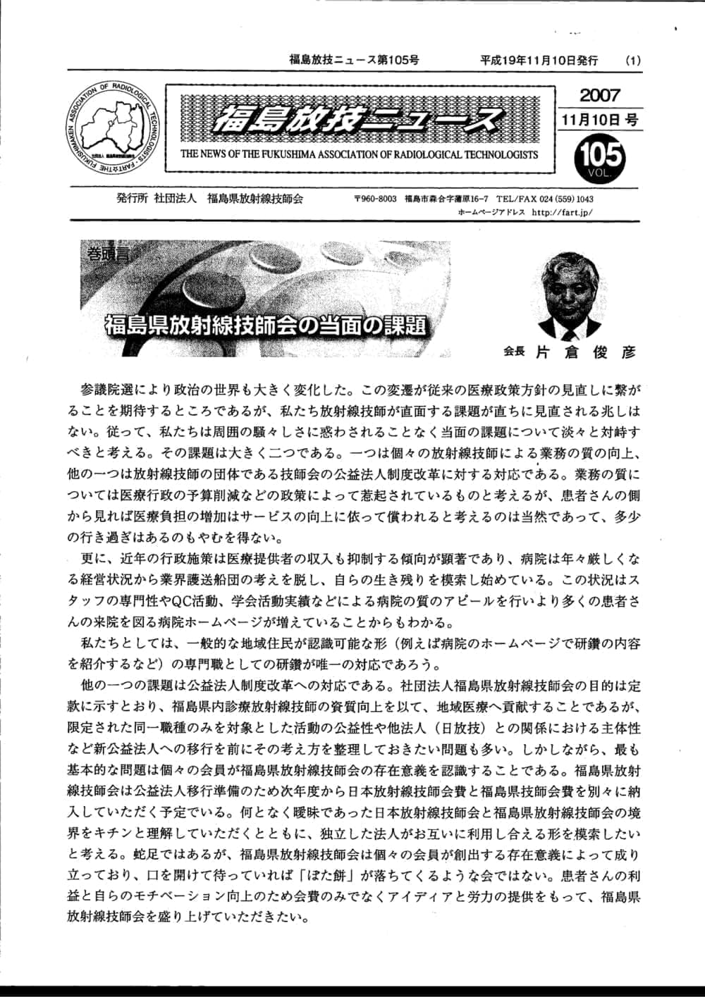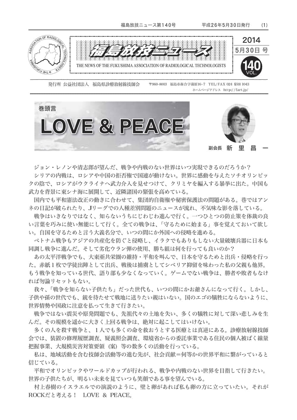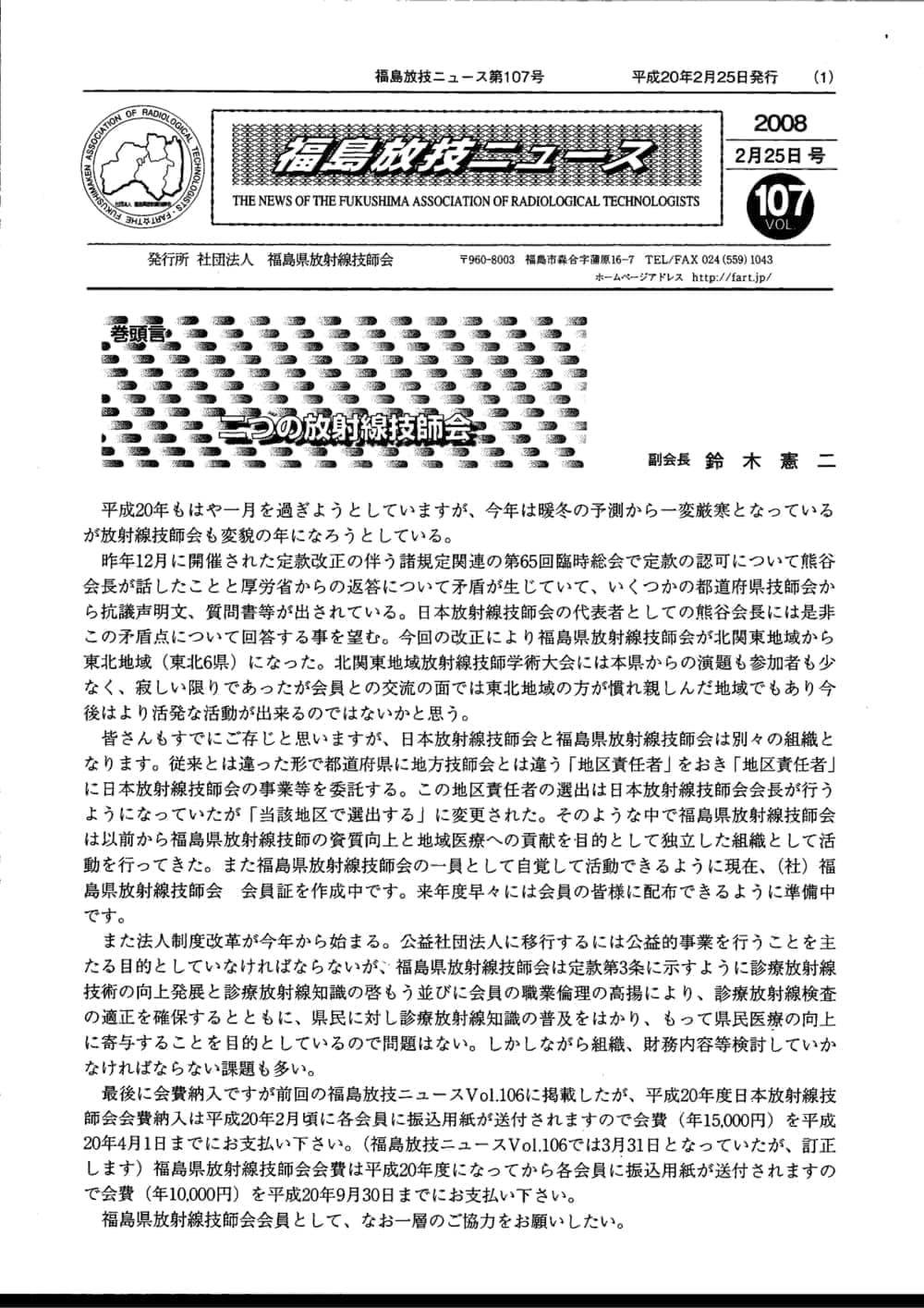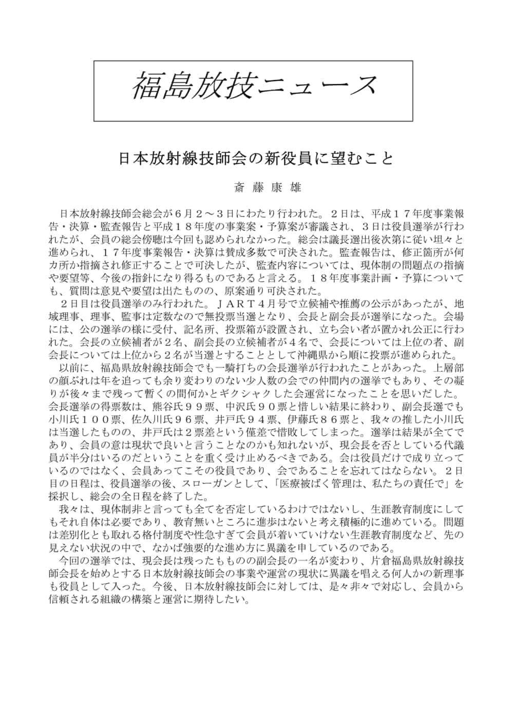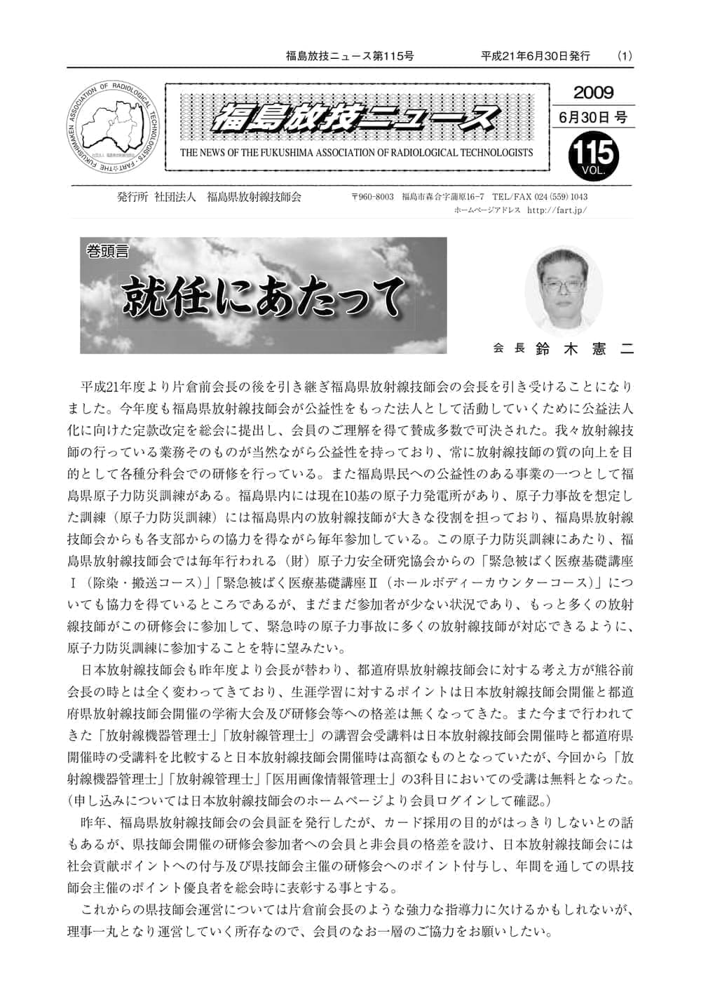 福島放技ニュースのバックナンバーをPDFファイルで閲覧することができます。 注1)Adobe Reader 6.0以上でご覧ください。 注2)ファイルサイズが大きいので、ダウンロードしてご覧頂くことをお勧めします。 【 2026年 】 No.210 No.211 【 2025年 】 No.204 No.205 No.206 No.207 No.208 No.209 【 2024年 】 No.198 No.199 No.200 No.201 No.202 No.203 【 2023年 】 No.192 No.193 No.194 No.195 No.196 No.197 【 2022年 】 No.186 No.187 No.188 No.189 No.190 No.191 【 2021年 】 No.180 No.181 No.182 No.183 No.184 No.185 【 2020年 】 No.174 No.175 No.176 No.177 No.178 No.179 【 2019年 】 No.168 No.169 No.170 No.171 No.172 No.173 【 2018年 】 No.163 No.164 No.165 No.166 No.167 【 2017年 】 No.161 No.162 No.156 No.157 No.158 No.159 No.160 【 2016年 】 No.155 No.150 No.151 No.152 No.153 No.154 【 2015年 】 No.149 No.144 No.145 No.146 No.147 No.148 【 2014年 】 No.143 No.138 No.139 No.140 No.141 No.142 【 2013年 】 No.133 No.134 No.135 No.136 No.137 【 2012年 】 No.129 No.130 No.131 No.132 【 2011年 】 No.124 No.125 No.126 No.127 No.128 【 2010年 】 No.123 No.118 No.119 No.120 No.121 No.122 【 2009年 】 No.113 No.114 No.115 No.116 No.117 【 2008年 】 No.112 No.107 No.108 No.109 No.110 No.111 【 2007年 】 No.106 No.101 No.102 No.103 No.104 No.105 【 2006年 】 No.100 No.095 No.096 No.097 No.098 No.099 【 2005年 】 No.094-01 No.094-02 No.089 No.090 No.091 No.092 No.093 HOME | 福放技ニュース 前のページ へ 次のページへ 技師会長よりごあいさつ お知らせ分科会・研究会・地区情報告示研修開催情報イベントカレンダー令和7年度 総会議案書役員改選および選挙 >役員改選告示 >役員改選立候補者 会員・医療従事者の皆様へ福放技ニュースメールマガジンに関して生涯ポイント付与について会報 技師会所有の物品貸出について >マンモグラフィトレーニング用ベスト >作業環境測定機器 会員専用情報パスワードについて 各種申請書ダウンロード 委員会報告各委員会ファイル共有 放射線に関する情報 ICRP勧告 MRI磁場の危険性 放射線 Q&A WBCに関する資料 簡易除染マニュアル