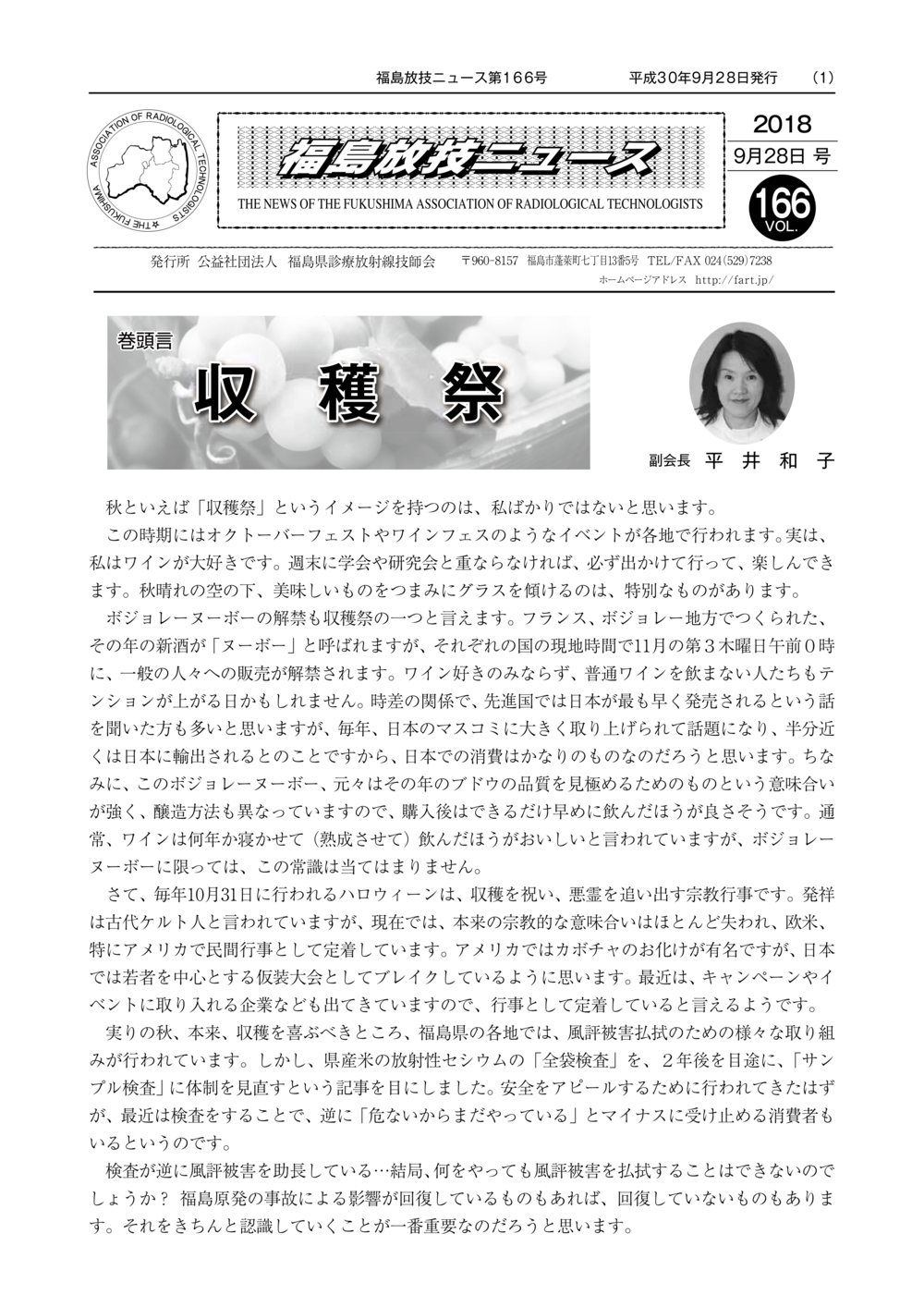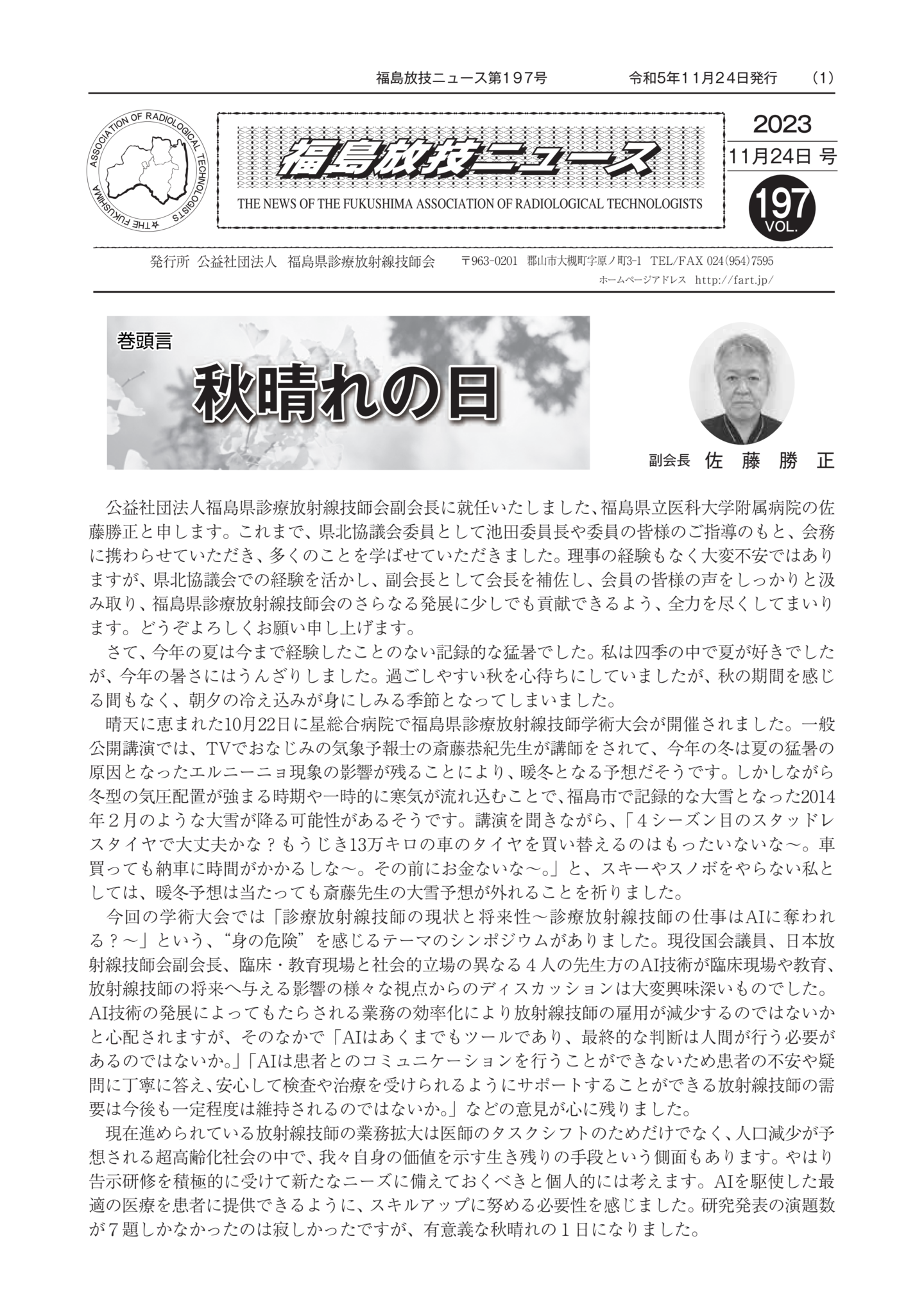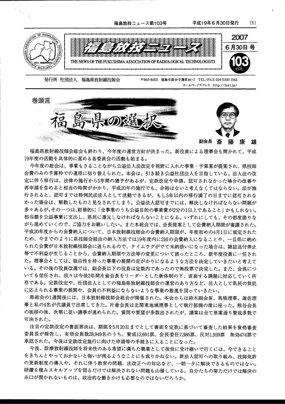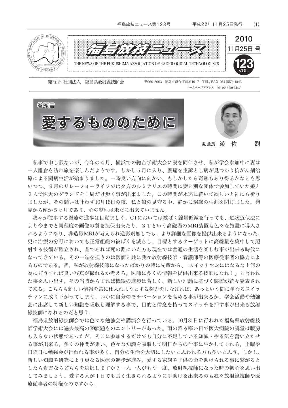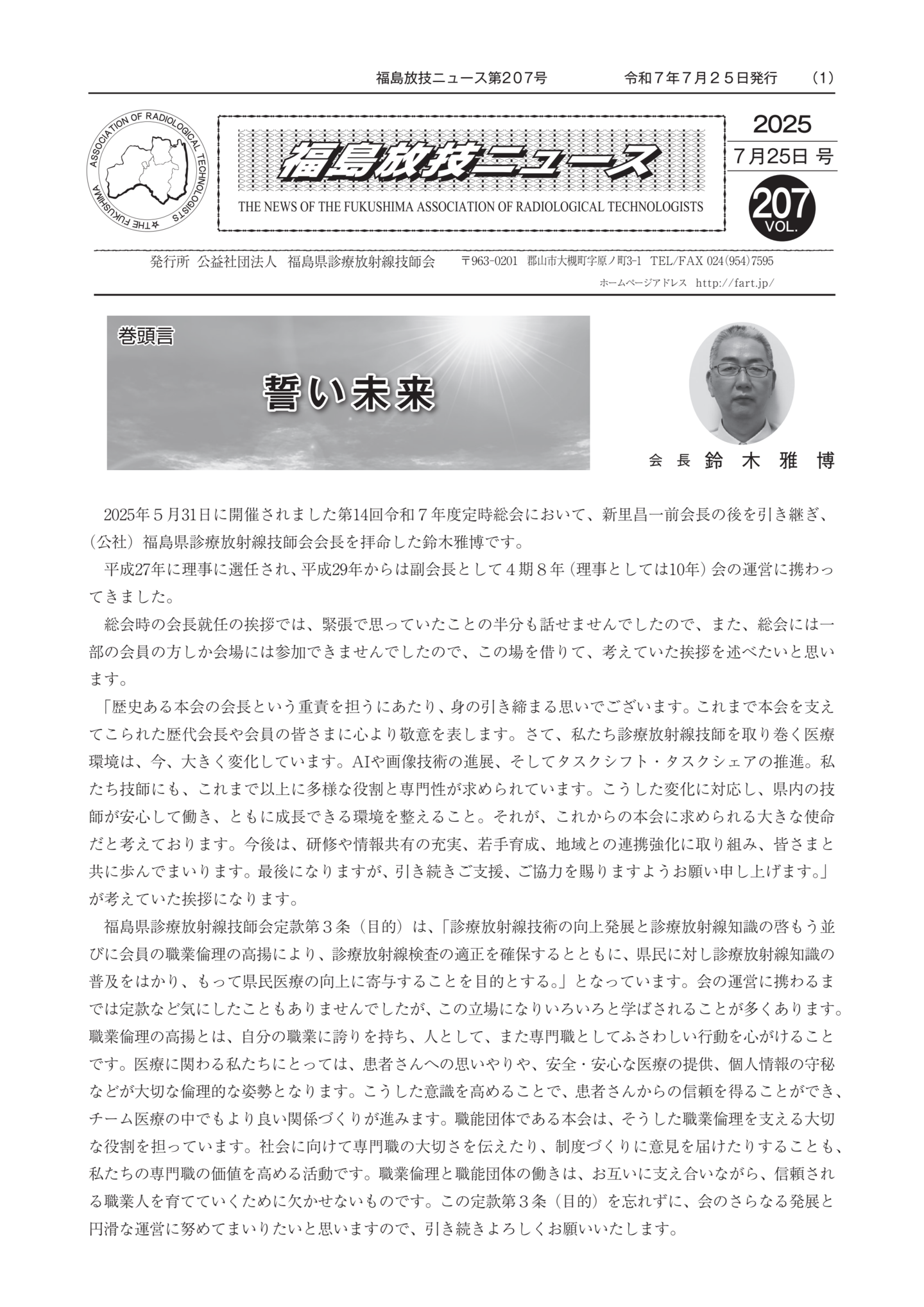 福島放技ニュースのバックナンバーをPDFファイルで閲覧することができます。 注1)Adobe Reader 6.0以上でご覧ください。 注2)ファイルサイズが大きいので、ダウンロードしてご覧頂くことをお勧めします。 【 2026年 】 No.210 No.211 【 2025年 】 No.204 No.205 No.206 No.207 No.208 No.209 【 2024年 】 No.198 No.199 No.200 No.201 No.202 No.203 【 2023年 】 No.192 No.193 No.194 No.195 No.196 No.197 【 2022年 】 No.186 No.187 No.188 No.189 No.190 No.191 【 2021年 】 No.180 No.181 No.182 No.183 No.184 No.185 【 2020年 】 No.174 No.175 No.176 No.177 No.178 No.179 【 2019年 】 No.168 No.169 No.170 No.171 No.172 No.173 【 2018年 】 No.163 No.164 No.165 No.166 No.167 【 2017年 】 No.161 No.162 No.156 No.157 No.158 No.159 No.160 【 2016年 】 No.155 No.150 No.151 No.152 No.153 No.154 【 2015年 】 No.149 No.144 No.145 No.146 No.147 No.148 【 2014年 】 No.143 No.138 No.139 No.140 No.141 No.142 【 2013年 】 No.133 No.134 No.135 No.136 No.137 【 2012年 】 No.129 No.130 No.131 No.132 【 2011年 】 No.124 No.125 No.126 No.127 No.128 【 2010年 】 No.123 No.118 No.119 No.120 No.121 No.122 【 2009年 】 No.113 No.114 No.115 No.116 No.117 【 2008年 】 No.112 No.107 No.108 No.109 No.110 No.111 【 2007年 】 No.106 No.101 No.102 No.103 No.104 No.105 【 2006年 】 No.100 No.095 No.096 No.097 No.098 No.099 【 2005年 】 No.094-01 No.094-02 No.089 No.090 No.091 No.092 No.093 HOME | 福放技ニュース 前のページ へ 次のページへ 技師会長よりごあいさつ お知らせ分科会・研究会・地区情報告示研修開催情報イベントカレンダー令和7年度 総会議案書役員改選および選挙 >役員改選告示 >役員改選立候補者 会員・医療従事者の皆様へ福放技ニュースメールマガジンに関して生涯ポイント付与について会報 技師会所有の物品貸出について >マンモグラフィトレーニング用ベスト >作業環境測定機器 会員専用情報パスワードについて 各種申請書ダウンロード 委員会報告各委員会ファイル共有 放射線に関する情報 ICRP勧告 MRI磁場の危険性 放射線 Q&A WBCに関する資料 簡易除染マニュアル