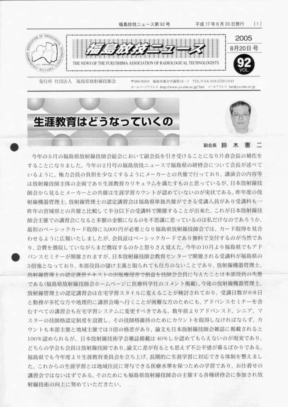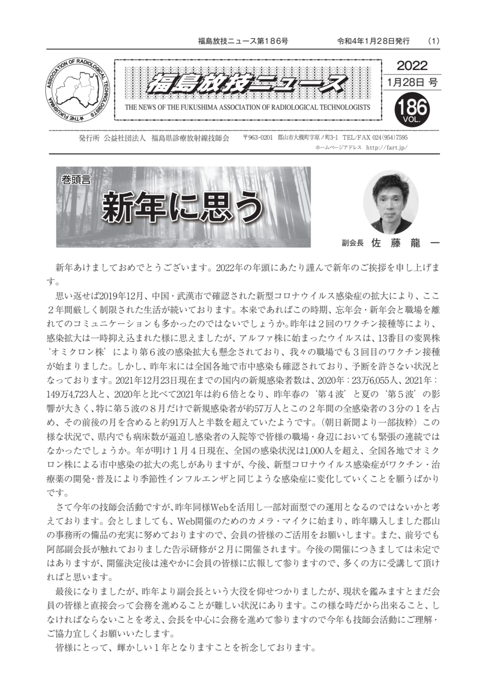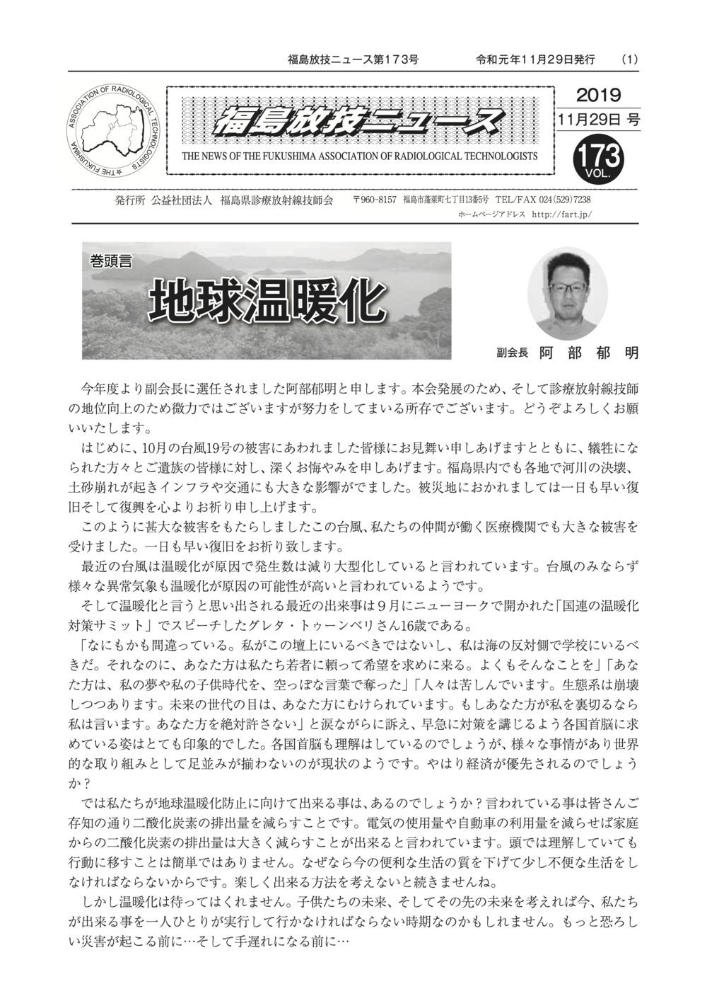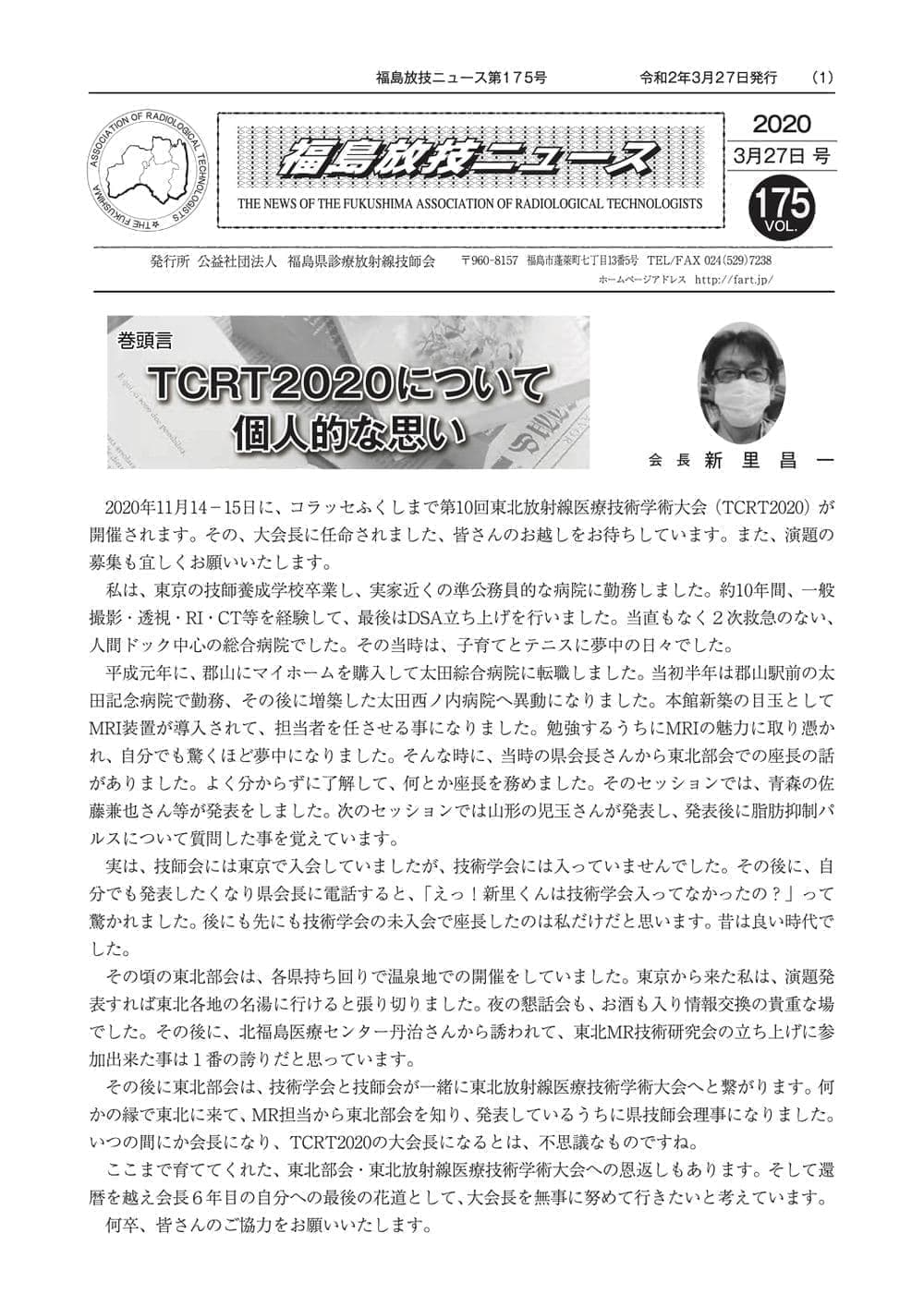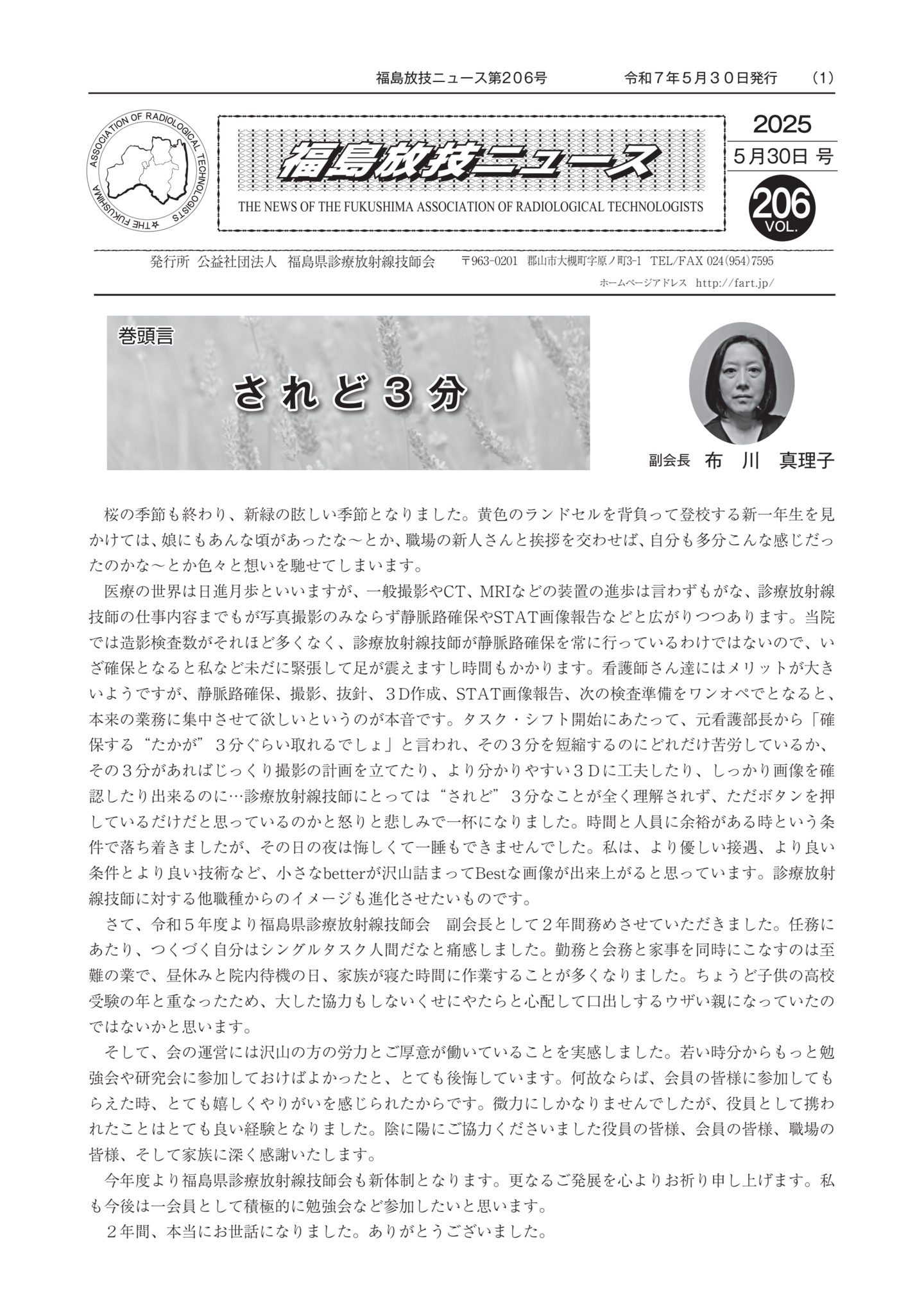 福島放技ニュースのバックナンバーをPDFファイルで閲覧することができます。 注1)Adobe Reader 6.0以上でご覧ください。 注2)ファイルサイズが大きいので、ダウンロードしてご覧頂くことをお勧めします。 【 2026年 】 No.210 No.211 【 2025年 】 No.204 No.205 No.206 No.207 No.208 No.209 【 2024年 】 No.198 No.199 No.200 No.201 No.202 No.203 【 2023年 】 No.192 No.193 No.194 No.195 No.196 No.197 【 2022年 】 No.186 No.187 No.188 No.189 No.190 No.191 【 2021年 】 No.180 No.181 No.182 No.183 No.184 No.185 【 2020年 】 No.174 No.175 No.176 No.177 No.178 No.179 【 2019年 】 No.168 No.169 No.170 No.171 No.172 No.173 【 2018年 】 No.163 No.164 No.165 No.166 No.167 【 2017年 】 No.161 No.162 No.156 No.157 No.158 No.159 No.160 【 2016年 】 No.155 No.150 No.151 No.152 No.153 No.154 【 2015年 】 No.149 No.144 No.145 No.146 No.147 No.148 【 2014年 】 No.143 No.138 No.139 No.140 No.141 No.142 【 2013年 】 No.133 No.134 No.135 No.136 No.137 【 2012年 】 No.129 No.130 No.131 No.132 【 2011年 】 No.124 No.125 No.126 No.127 No.128 【 2010年 】 No.123 No.118 No.119 No.120 No.121 No.122 【 2009年 】 No.113 No.114 No.115 No.116 No.117 【 2008年 】 No.112 No.107 No.108 No.109 No.110 No.111 【 2007年 】 No.106 No.101 No.102 No.103 No.104 No.105 【 2006年 】 No.100 No.095 No.096 No.097 No.098 No.099 【 2005年 】 No.094-01 No.094-02 No.089 No.090 No.091 No.092 No.093 HOME | 福放技ニュース 前のページ へ 次のページへ 技師会長よりごあいさつ お知らせ分科会・研究会・地区情報告示研修開催情報イベントカレンダー令和7年度 総会議案書役員改選および選挙 >役員改選告示 >役員改選立候補者 会員・医療従事者の皆様へ福放技ニュースメールマガジンに関して生涯ポイント付与について会報 技師会所有の物品貸出について >マンモグラフィトレーニング用ベスト >作業環境測定機器 会員専用情報パスワードについて 各種申請書ダウンロード 委員会報告各委員会ファイル共有 放射線に関する情報 ICRP勧告 MRI磁場の危険性 放射線 Q&A WBCに関する資料 簡易除染マニュアル
