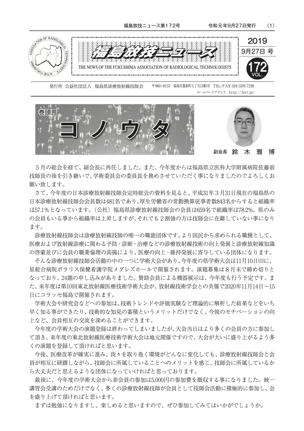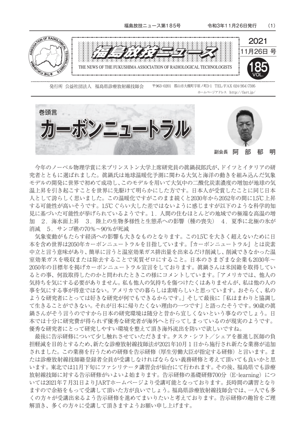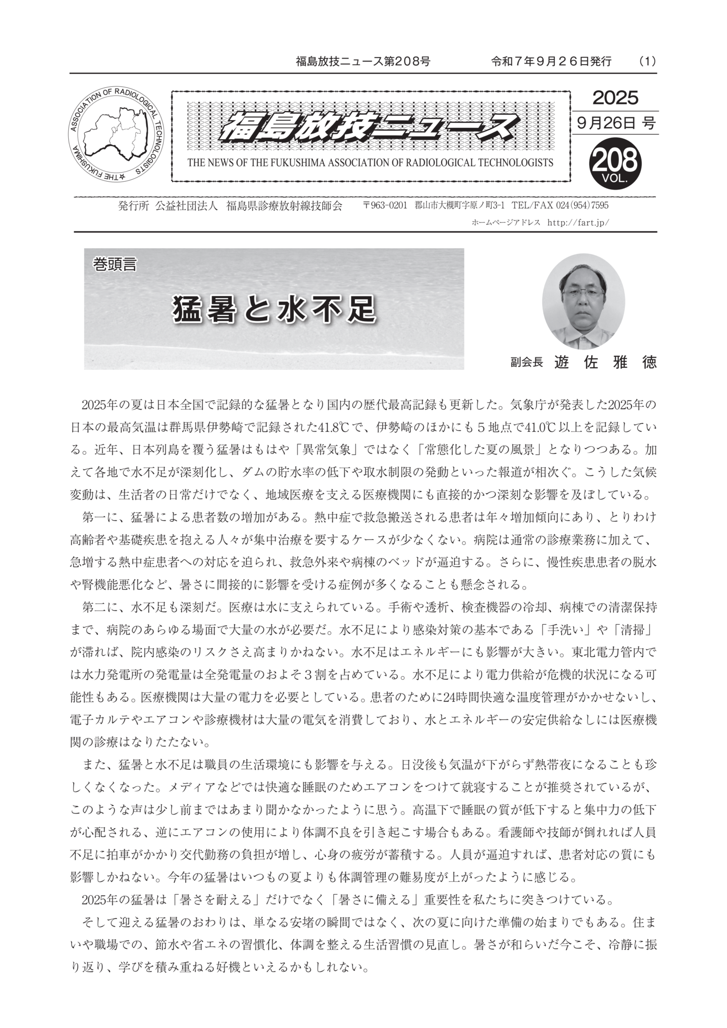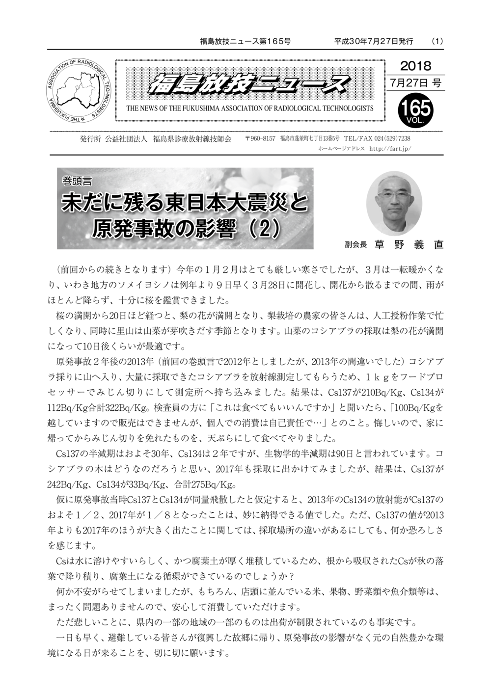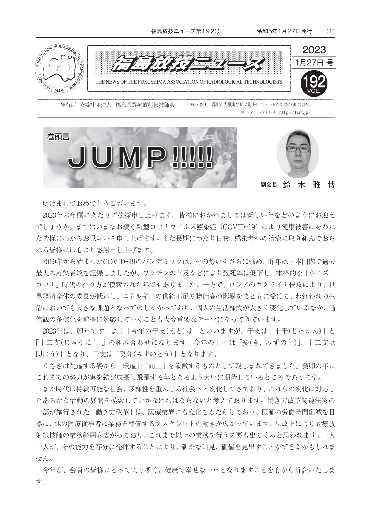 福島放技ニュースのバックナンバーをPDFファイルで閲覧することができます。 注1)Adobe Reader 6.0以上でご覧ください。 注2)ファイルサイズが大きいので、ダウンロードしてご覧頂くことをお勧めします。 【 2026年 】 No.210 No.211 【 2025年 】 No.204 No.205 No.206 No.207 No.208 No.209 【 2024年 】 No.198 No.199 No.200 No.201 No.202 No.203 【 2023年 】 No.192 No.193 No.194 No.195 No.196 No.197 【 2022年 】 No.186 No.187 No.188 No.189 No.190 No.191 【 2021年 】 No.180 No.181 No.182 No.183 No.184 No.185 【 2020年 】 No.174 No.175 No.176 No.177 No.178 No.179 【 2019年 】 No.168 No.169 No.170 No.171 No.172 No.173 【 2018年 】 No.163 No.164 No.165 No.166 No.167 【 2017年 】 No.161 No.162 No.156 No.157 No.158 No.159 No.160 【 2016年 】 No.155 No.150 No.151 No.152 No.153 No.154 【 2015年 】 No.149 No.144 No.145 No.146 No.147 No.148 【 2014年 】 No.143 No.138 No.139 No.140 No.141 No.142 【 2013年 】 No.133 No.134 No.135 No.136 No.137 【 2012年 】 No.129 No.130 No.131 No.132 【 2011年 】 No.124 No.125 No.126 No.127 No.128 【 2010年 】 No.123 No.118 No.119 No.120 No.121 No.122 【 2009年 】 No.113 No.114 No.115 No.116 No.117 【 2008年 】 No.112 No.107 No.108 No.109 No.110 No.111 【 2007年 】 No.106 No.101 No.102 No.103 No.104 No.105 【 2006年 】 No.100 No.095 No.096 No.097 No.098 No.099 【 2005年 】 No.094-01 No.094-02 No.089 No.090 No.091 No.092 No.093 HOME | 福放技ニュース 前のページ へ 次のページへ 技師会長よりごあいさつ お知らせ分科会・研究会・地区情報告示研修開催情報イベントカレンダー令和7年度 総会議案書役員改選および選挙 >役員改選告示 >役員改選立候補者 会員・医療従事者の皆様へ福放技ニュースメールマガジンに関して生涯ポイント付与について会報 技師会所有の物品貸出について >マンモグラフィトレーニング用ベスト >作業環境測定機器 会員専用情報パスワードについて 各種申請書ダウンロード 委員会報告各委員会ファイル共有 放射線に関する情報 ICRP勧告 MRI磁場の危険性 放射線 Q&A WBCに関する資料 簡易除染マニュアル
