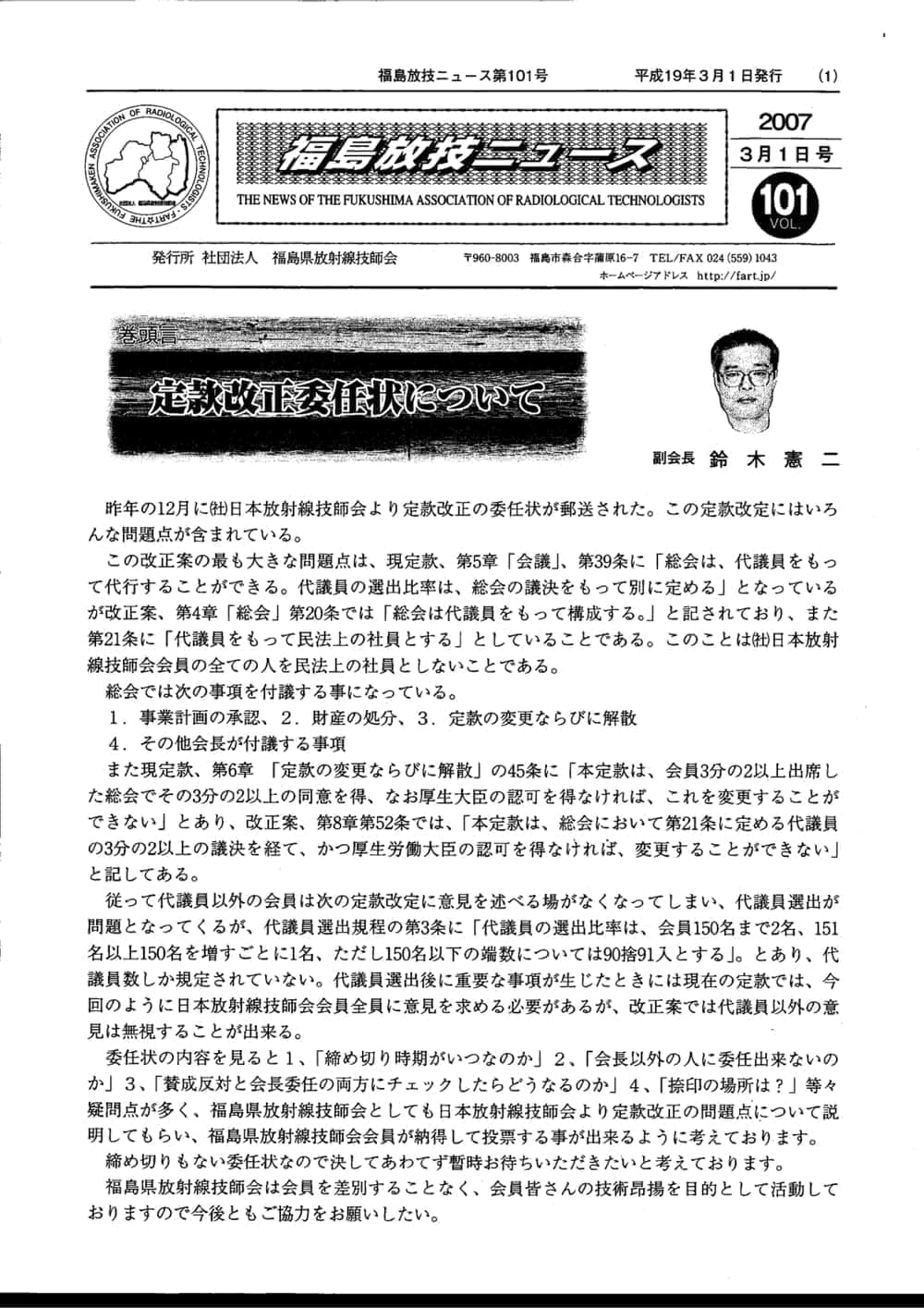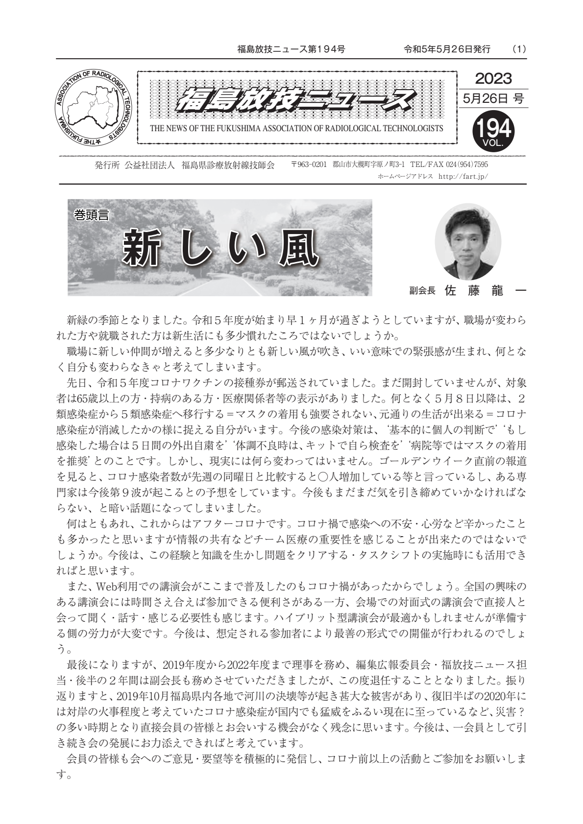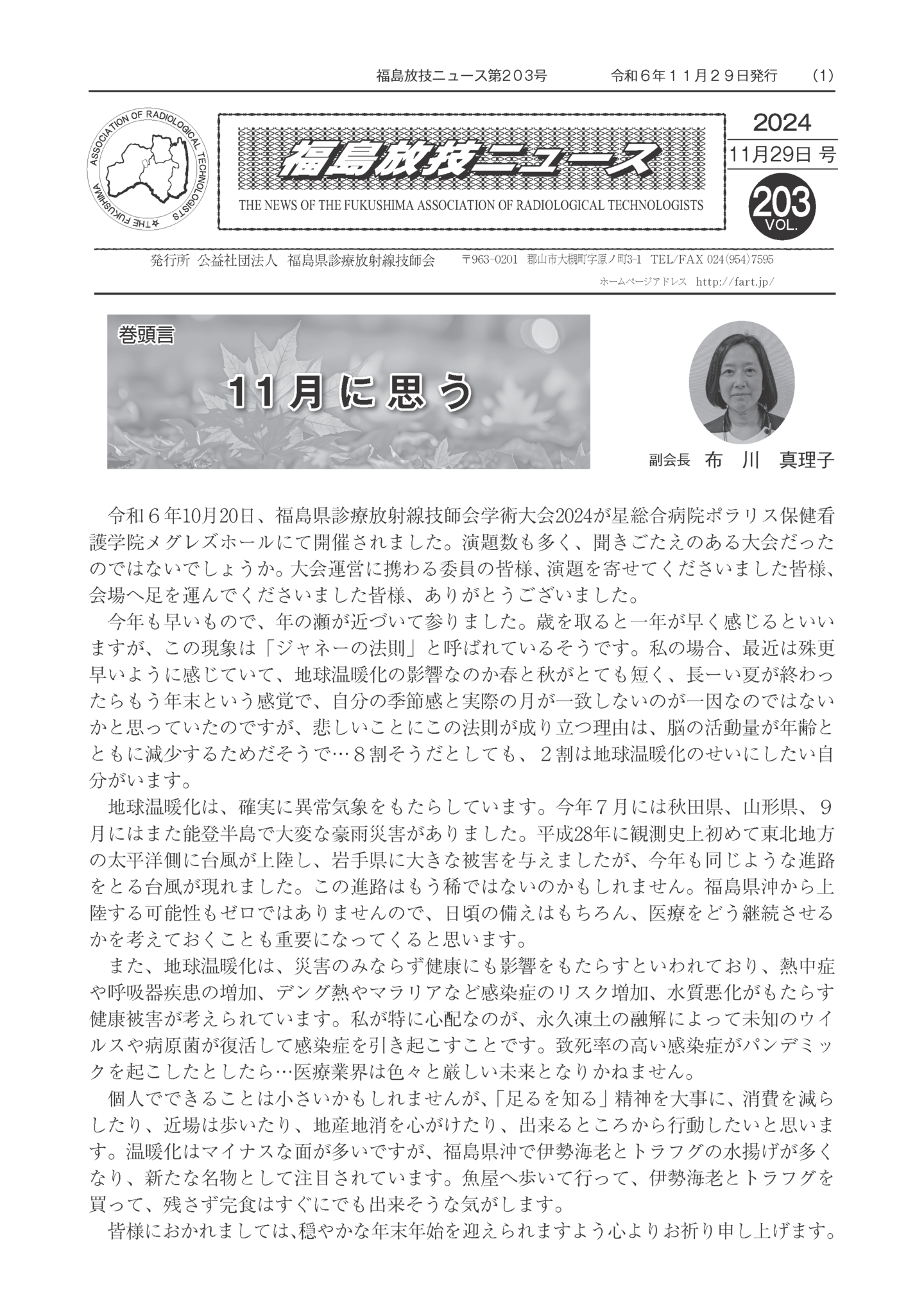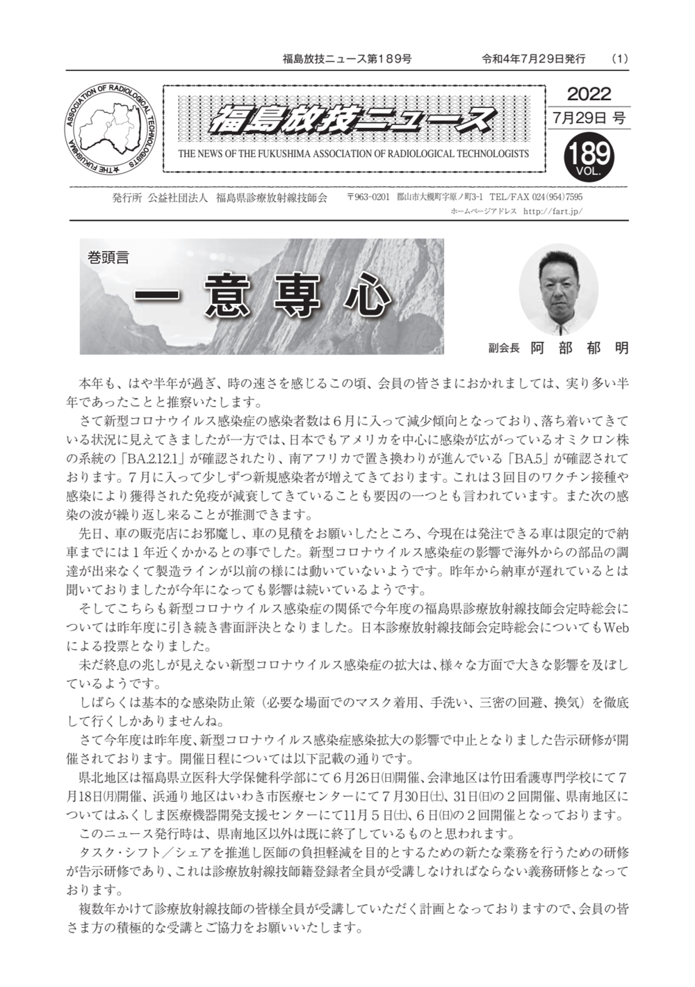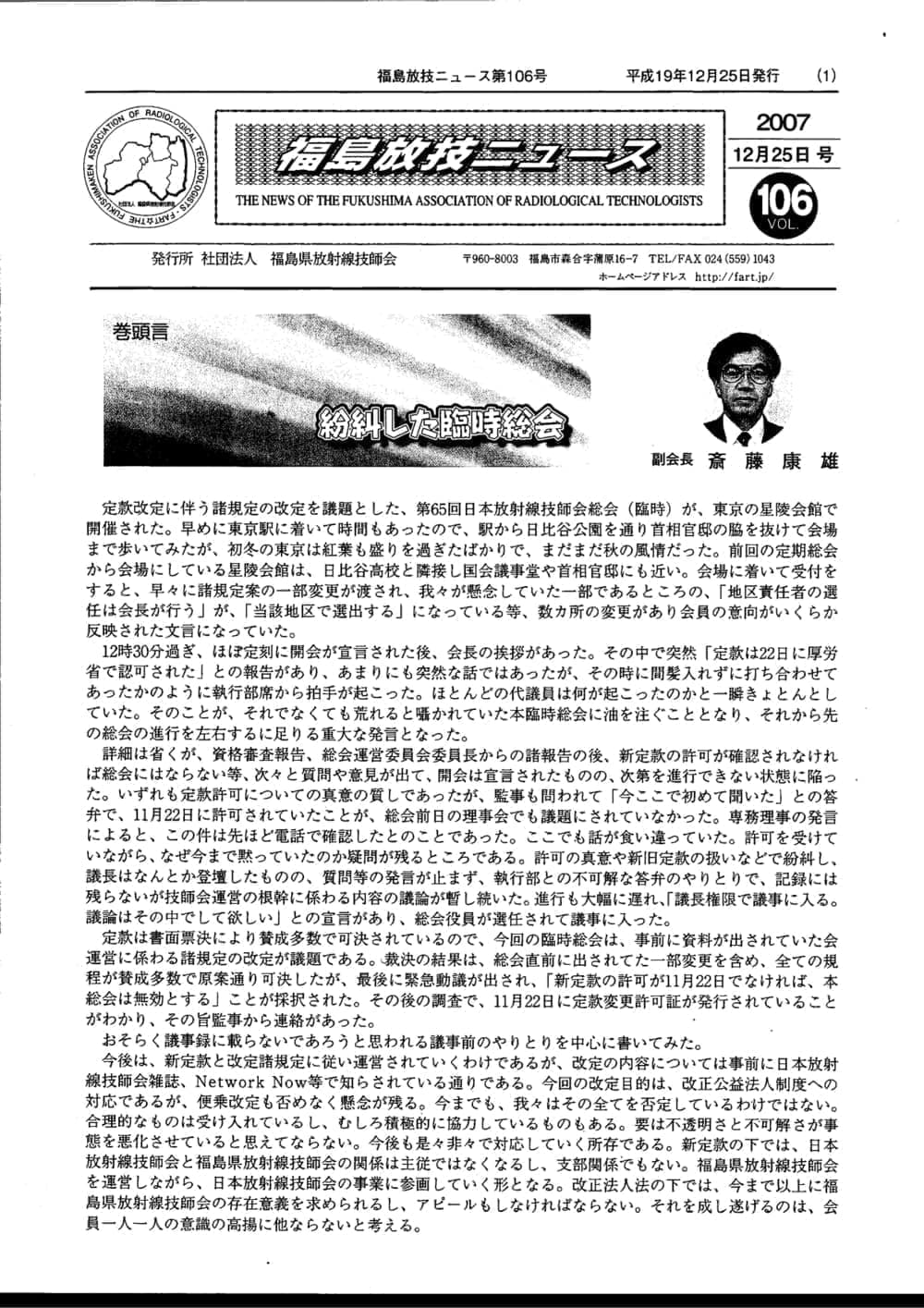 福島放技ニュースのバックナンバーをPDFファイルで閲覧することができます。 注1)Adobe Reader 6.0以上でご覧ください。 注2)ファイルサイズが大きいので、ダウンロードしてご覧頂くことをお勧めします。 【 2026年 】 No.210 No.211 【 2025年 】 No.204 No.205 No.206 No.207 No.208 No.209 【 2024年 】 No.198 No.199 No.200 No.201 No.202 No.203 【 2023年 】 No.192 No.193 No.194 No.195 No.196 No.197 【 2022年 】 No.186 No.187 No.188 No.189 No.190 No.191 【 2021年 】 No.180 No.181 No.182 No.183 No.184 No.185 【 2020年 】 No.174 No.175 No.176 No.177 No.178 No.179 【 2019年 】 No.168 No.169 No.170 No.171 No.172 No.173 【 2018年 】 No.163 No.164 No.165 No.166 No.167 【 2017年 】 No.161 No.162 No.156 No.157 No.158 No.159 No.160 【 2016年 】 No.155 No.150 No.151 No.152 No.153 No.154 【 2015年 】 No.149 No.144 No.145 No.146 No.147 No.148 【 2014年 】 No.143 No.138 No.139 No.140 No.141 No.142 【 2013年 】 No.133 No.134 No.135 No.136 No.137 【 2012年 】 No.129 No.130 No.131 No.132 【 2011年 】 No.124 No.125 No.126 No.127 No.128 【 2010年 】 No.123 No.118 No.119 No.120 No.121 No.122 【 2009年 】 No.113 No.114 No.115 No.116 No.117 【 2008年 】 No.112 No.107 No.108 No.109 No.110 No.111 【 2007年 】 No.106 No.101 No.102 No.103 No.104 No.105 【 2006年 】 No.100 No.095 No.096 No.097 No.098 No.099 【 2005年 】 No.094-01 No.094-02 No.089 No.090 No.091 No.092 No.093 HOME | 福放技ニュース 前のページ へ 次のページへ 技師会長よりごあいさつ お知らせ分科会・研究会・地区情報告示研修開催情報イベントカレンダー令和7年度 総会議案書役員改選および選挙 >役員改選告示 >役員改選立候補者 会員・医療従事者の皆様へ福放技ニュースメールマガジンに関して生涯ポイント付与について会報 技師会所有の物品貸出について >マンモグラフィトレーニング用ベスト >作業環境測定機器 会員専用情報パスワードについて 各種申請書ダウンロード 委員会報告各委員会ファイル共有 放射線に関する情報 ICRP勧告 MRI磁場の危険性 放射線 Q&A WBCに関する資料 簡易除染マニュアル