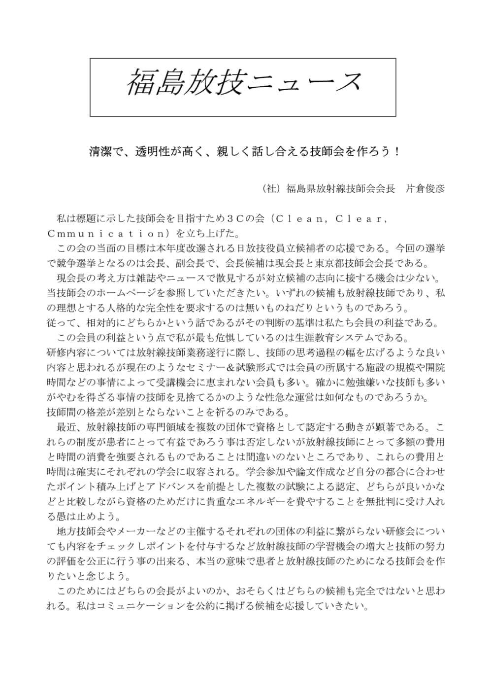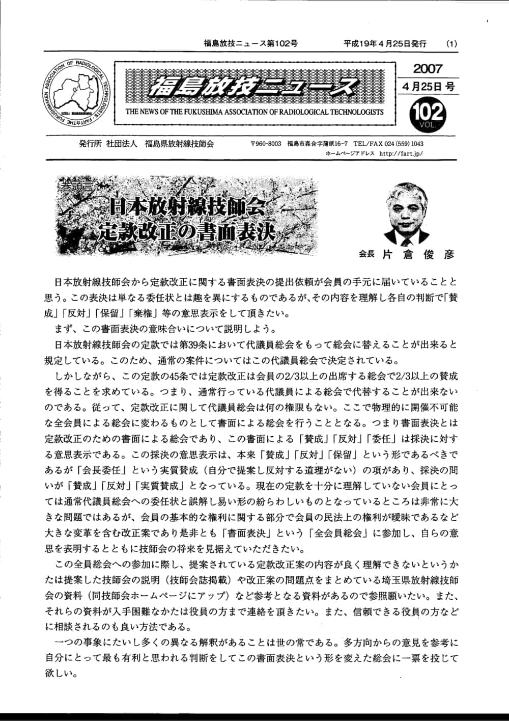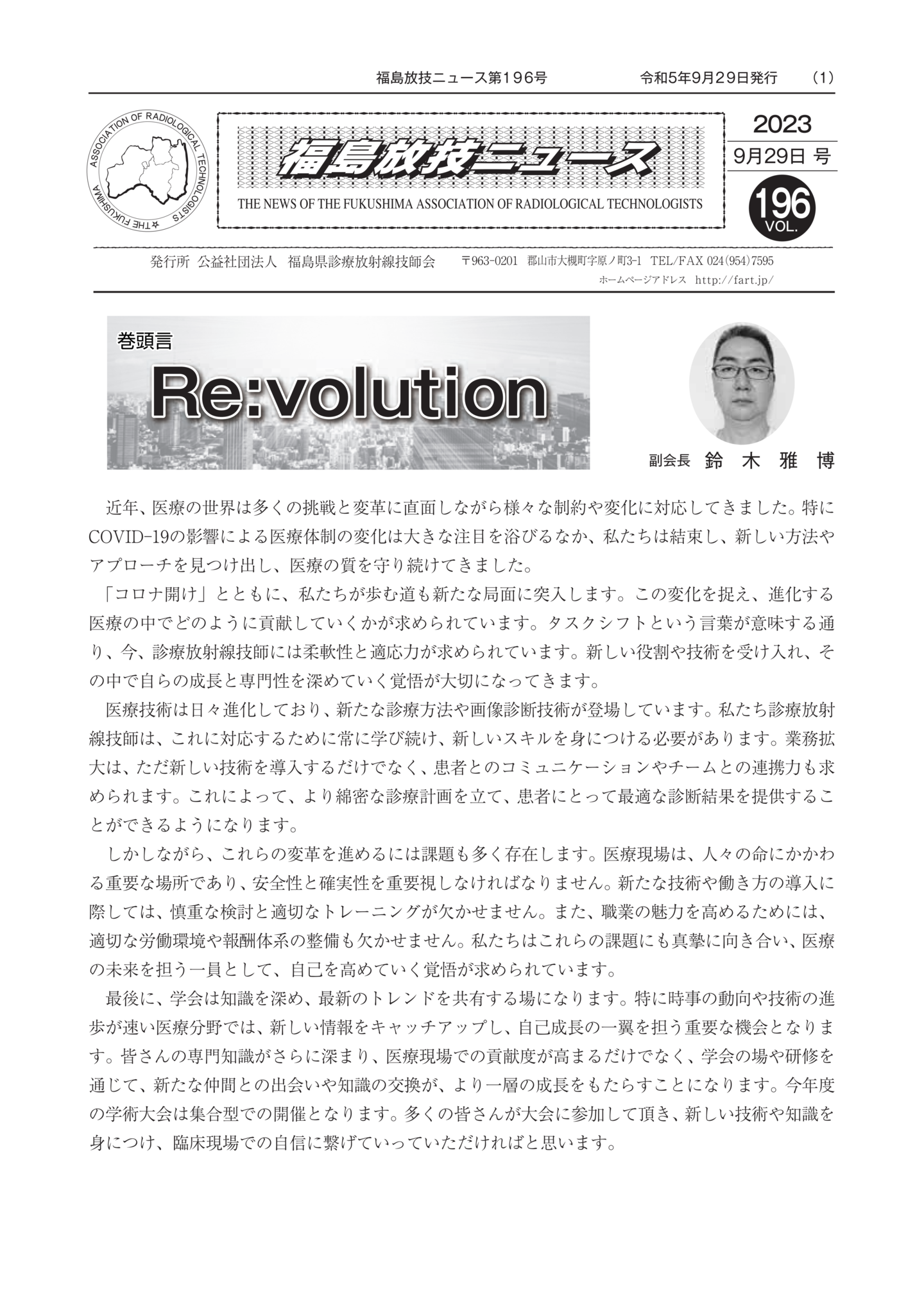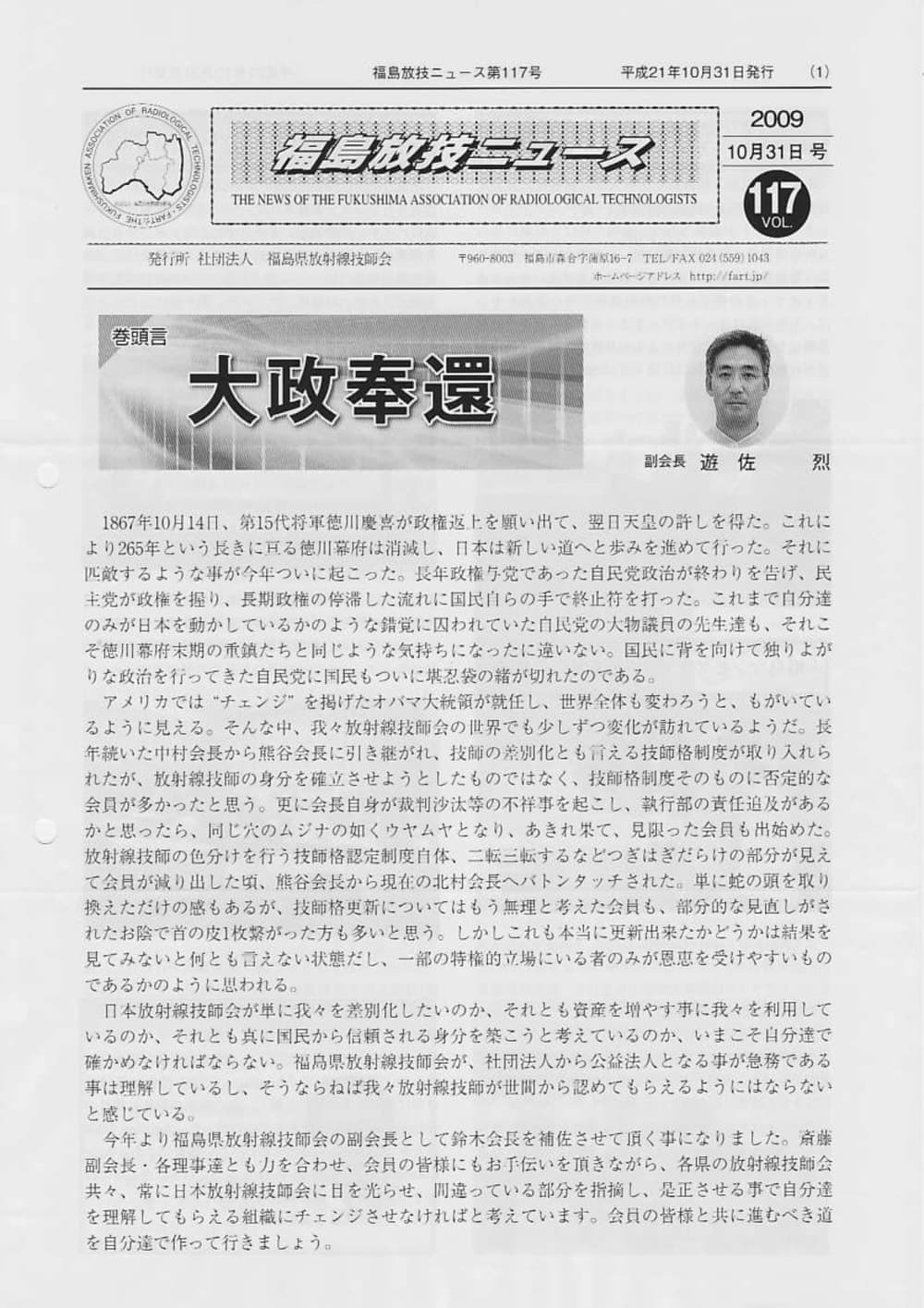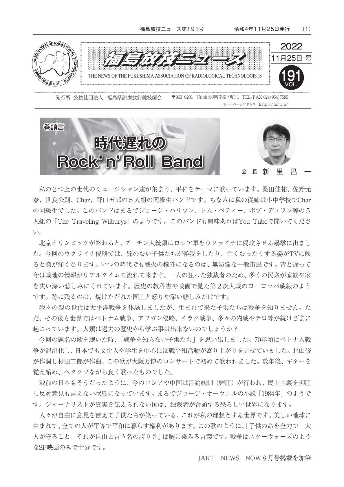 福島放技ニュースのバックナンバーをPDFファイルで閲覧することができます。 注1)Adobe Reader 6.0以上でご覧ください。 注2)ファイルサイズが大きいので、ダウンロードしてご覧頂くことをお勧めします。 【 2026年 】 No.210 No.211 【 2025年 】 No.204 No.205 No.206 No.207 No.208 No.209 【 2024年 】 No.198 No.199 No.200 No.201 No.202 No.203 【 2023年 】 No.192 No.193 No.194 No.195 No.196 No.197 【 2022年 】 No.186 No.187 No.188 No.189 No.190 No.191 【 2021年 】 No.180 No.181 No.182 No.183 No.184 No.185 【 2020年 】 No.174 No.175 No.176 No.177 No.178 No.179 【 2019年 】 No.168 No.169 No.170 No.171 No.172 No.173 【 2018年 】 No.163 No.164 No.165 No.166 No.167 【 2017年 】 No.161 No.162 No.156 No.157 No.158 No.159 No.160 【 2016年 】 No.155 No.150 No.151 No.152 No.153 No.154 【 2015年 】 No.149 No.144 No.145 No.146 No.147 No.148 【 2014年 】 No.143 No.138 No.139 No.140 No.141 No.142 【 2013年 】 No.133 No.134 No.135 No.136 No.137 【 2012年 】 No.129 No.130 No.131 No.132 【 2011年 】 No.124 No.125 No.126 No.127 No.128 【 2010年 】 No.123 No.118 No.119 No.120 No.121 No.122 【 2009年 】 No.113 No.114 No.115 No.116 No.117 【 2008年 】 No.112 No.107 No.108 No.109 No.110 No.111 【 2007年 】 No.106 No.101 No.102 No.103 No.104 No.105 【 2006年 】 No.100 No.095 No.096 No.097 No.098 No.099 【 2005年 】 No.094-01 No.094-02 No.089 No.090 No.091 No.092 No.093 HOME | 福放技ニュース 前のページ へ 次のページへ 技師会長よりごあいさつ お知らせ分科会・研究会・地区情報告示研修開催情報イベントカレンダー令和7年度 総会議案書役員改選および選挙 >役員改選告示 >役員改選立候補者 会員・医療従事者の皆様へ福放技ニュースメールマガジンに関して生涯ポイント付与について会報 技師会所有の物品貸出について >マンモグラフィトレーニング用ベスト >作業環境測定機器 会員専用情報パスワードについて 各種申請書ダウンロード 委員会報告各委員会ファイル共有 放射線に関する情報 ICRP勧告 MRI磁場の危険性 放射線 Q&A WBCに関する資料 簡易除染マニュアル
