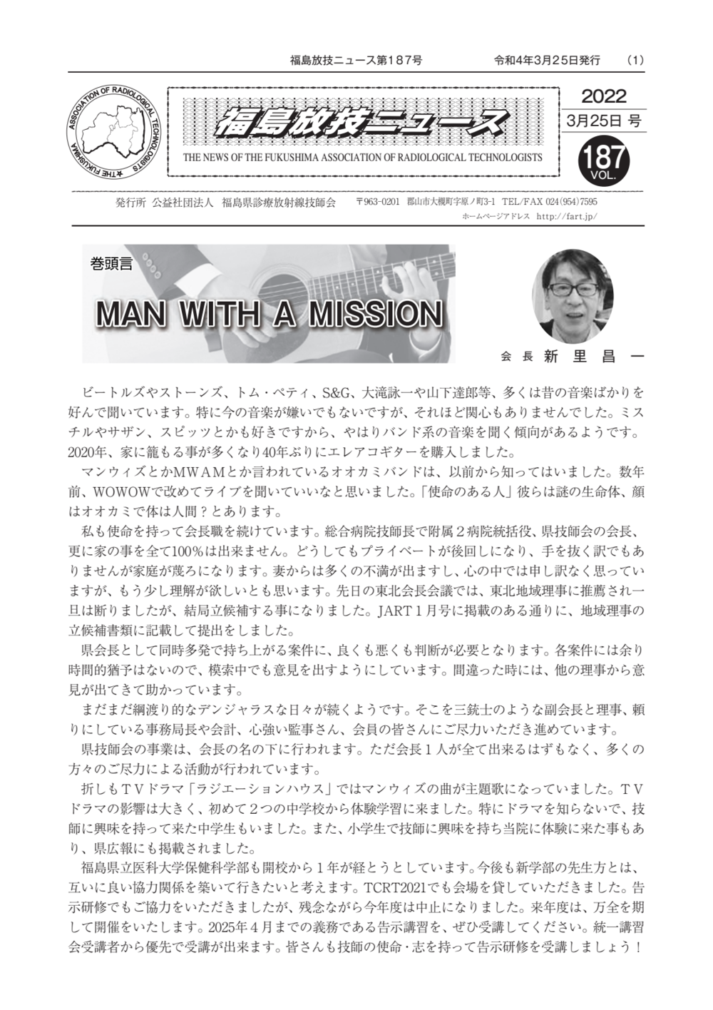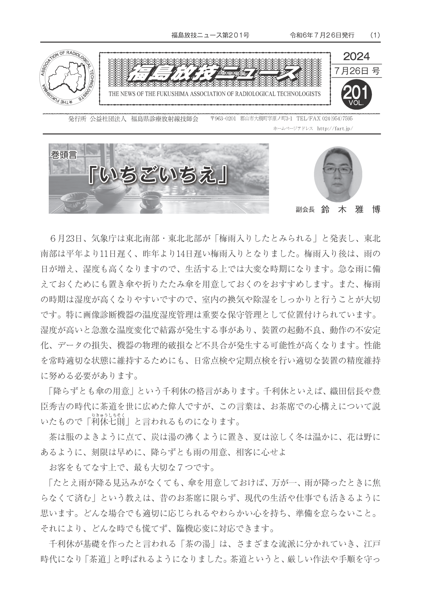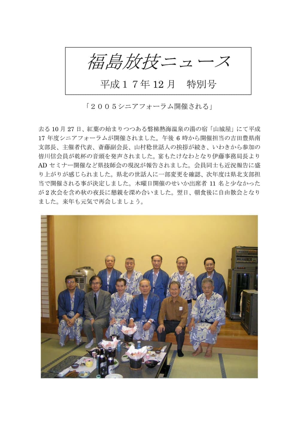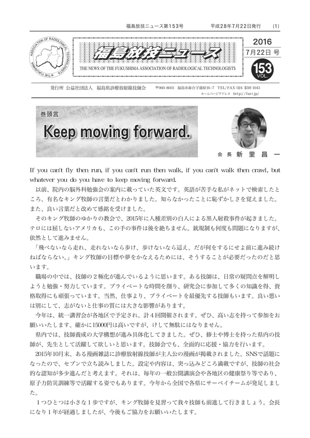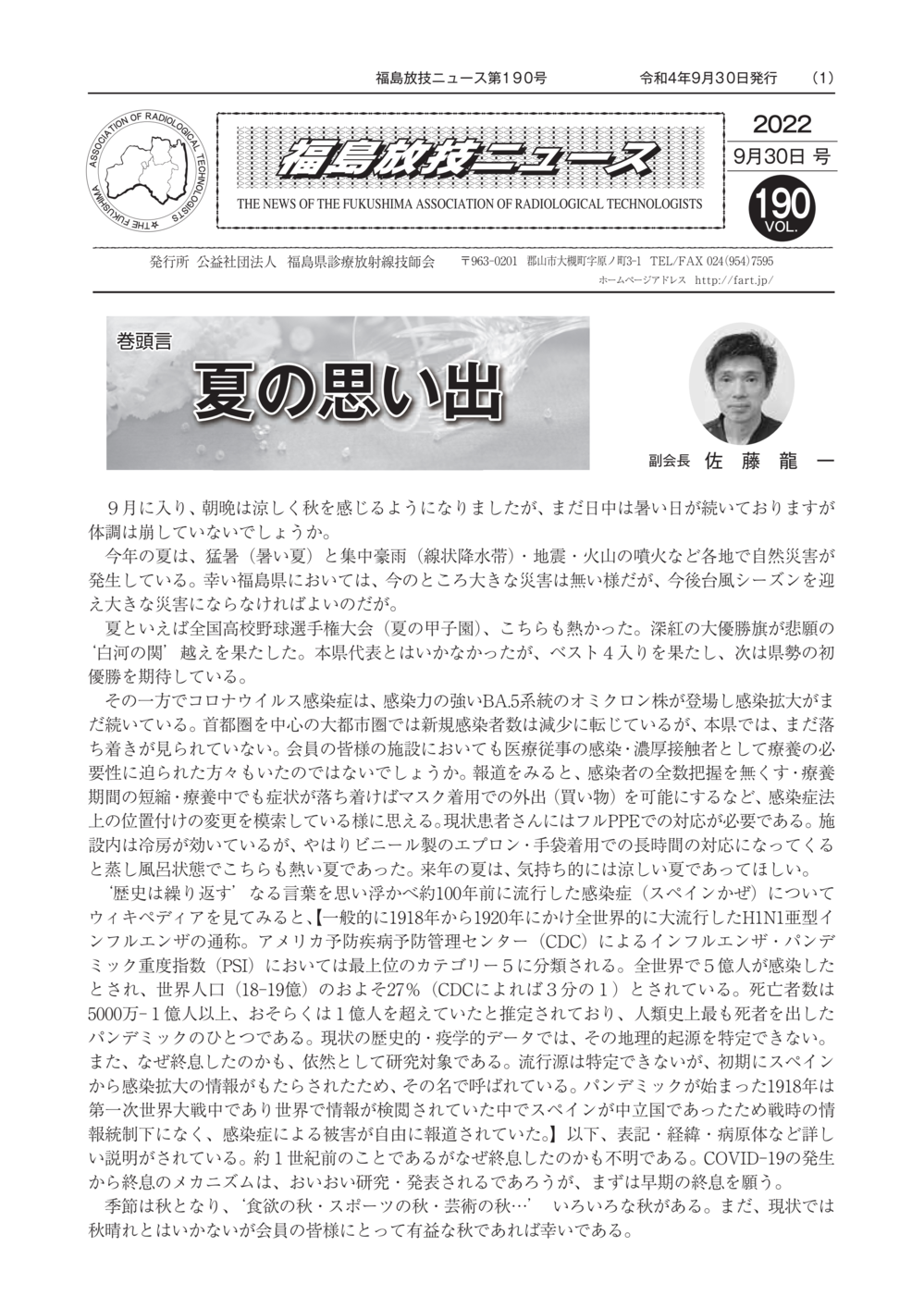 福島放技ニュースのバックナンバーをPDFファイルで閲覧することができます。 注1)Adobe Reader 6.0以上でご覧ください。 注2)ファイルサイズが大きいので、ダウンロードしてご覧頂くことをお勧めします。 【 2026年 】 No.210 No.211 【 2025年 】 No.204 No.205 No.206 No.207 No.208 No.209 【 2024年 】 No.198 No.199 No.200 No.201 No.202 No.203 【 2023年 】 No.192 No.193 No.194 No.195 No.196 No.197 【 2022年 】 No.186 No.187 No.188 No.189 No.190 No.191 【 2021年 】 No.180 No.181 No.182 No.183 No.184 No.185 【 2020年 】 No.174 No.175 No.176 No.177 No.178 No.179 【 2019年 】 No.168 No.169 No.170 No.171 No.172 No.173 【 2018年 】 No.163 No.164 No.165 No.166 No.167 【 2017年 】 No.161 No.162 No.156 No.157 No.158 No.159 No.160 【 2016年 】 No.155 No.150 No.151 No.152 No.153 No.154 【 2015年 】 No.149 No.144 No.145 No.146 No.147 No.148 【 2014年 】 No.143 No.138 No.139 No.140 No.141 No.142 【 2013年 】 No.133 No.134 No.135 No.136 No.137 【 2012年 】 No.129 No.130 No.131 No.132 【 2011年 】 No.124 No.125 No.126 No.127 No.128 【 2010年 】 No.123 No.118 No.119 No.120 No.121 No.122 【 2009年 】 No.113 No.114 No.115 No.116 No.117 【 2008年 】 No.112 No.107 No.108 No.109 No.110 No.111 【 2007年 】 No.106 No.101 No.102 No.103 No.104 No.105 【 2006年 】 No.100 No.095 No.096 No.097 No.098 No.099 【 2005年 】 No.094-01 No.094-02 No.089 No.090 No.091 No.092 No.093 HOME | 福放技ニュース 前のページ へ 次のページへ 技師会長よりごあいさつ お知らせ分科会・研究会・地区情報告示研修開催情報イベントカレンダー令和7年度 総会議案書役員改選および選挙 >役員改選告示 >役員改選立候補者 会員・医療従事者の皆様へ福放技ニュースメールマガジンに関して生涯ポイント付与について会報 技師会所有の物品貸出について >マンモグラフィトレーニング用ベスト >作業環境測定機器 会員専用情報パスワードについて 各種申請書ダウンロード 委員会報告各委員会ファイル共有 放射線に関する情報 ICRP勧告 MRI磁場の危険性 放射線 Q&A WBCに関する資料 簡易除染マニュアル